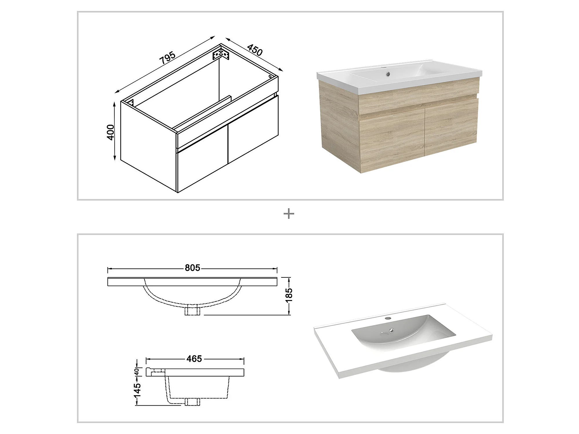 Ensemble meuble de salle de bain 80cm simple vasque + colonne de rangement + miroir lumineux Chêne Wotan