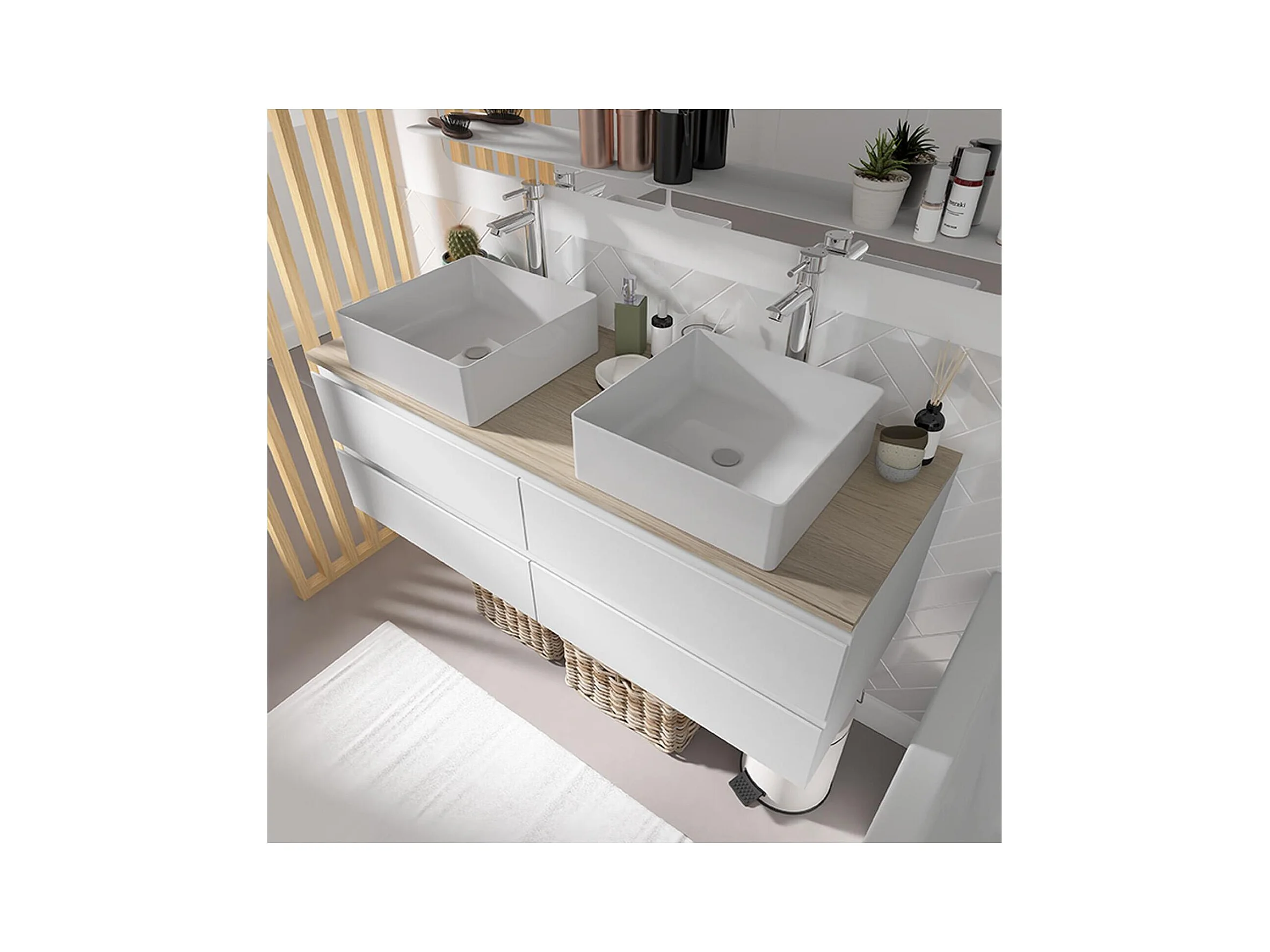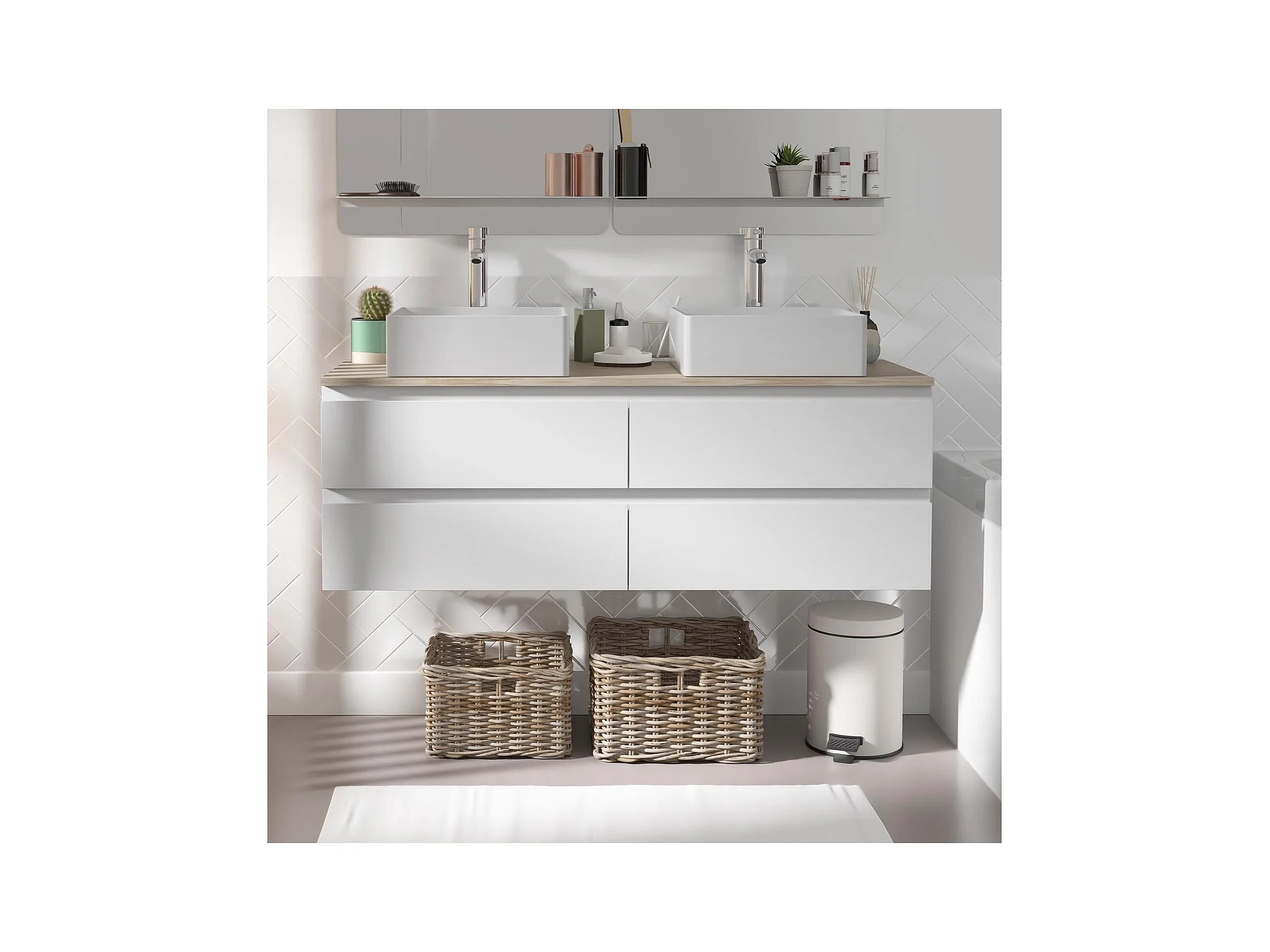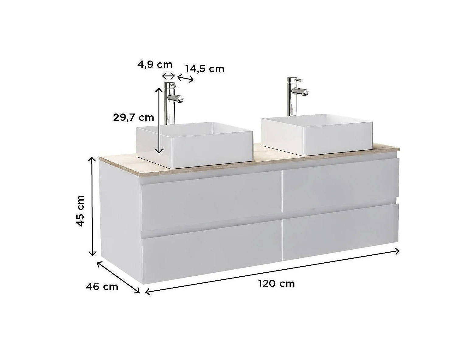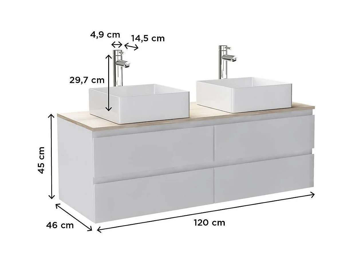 Ensemble double vasque suspendu avec plan bois, vasques et robinets 120 cm