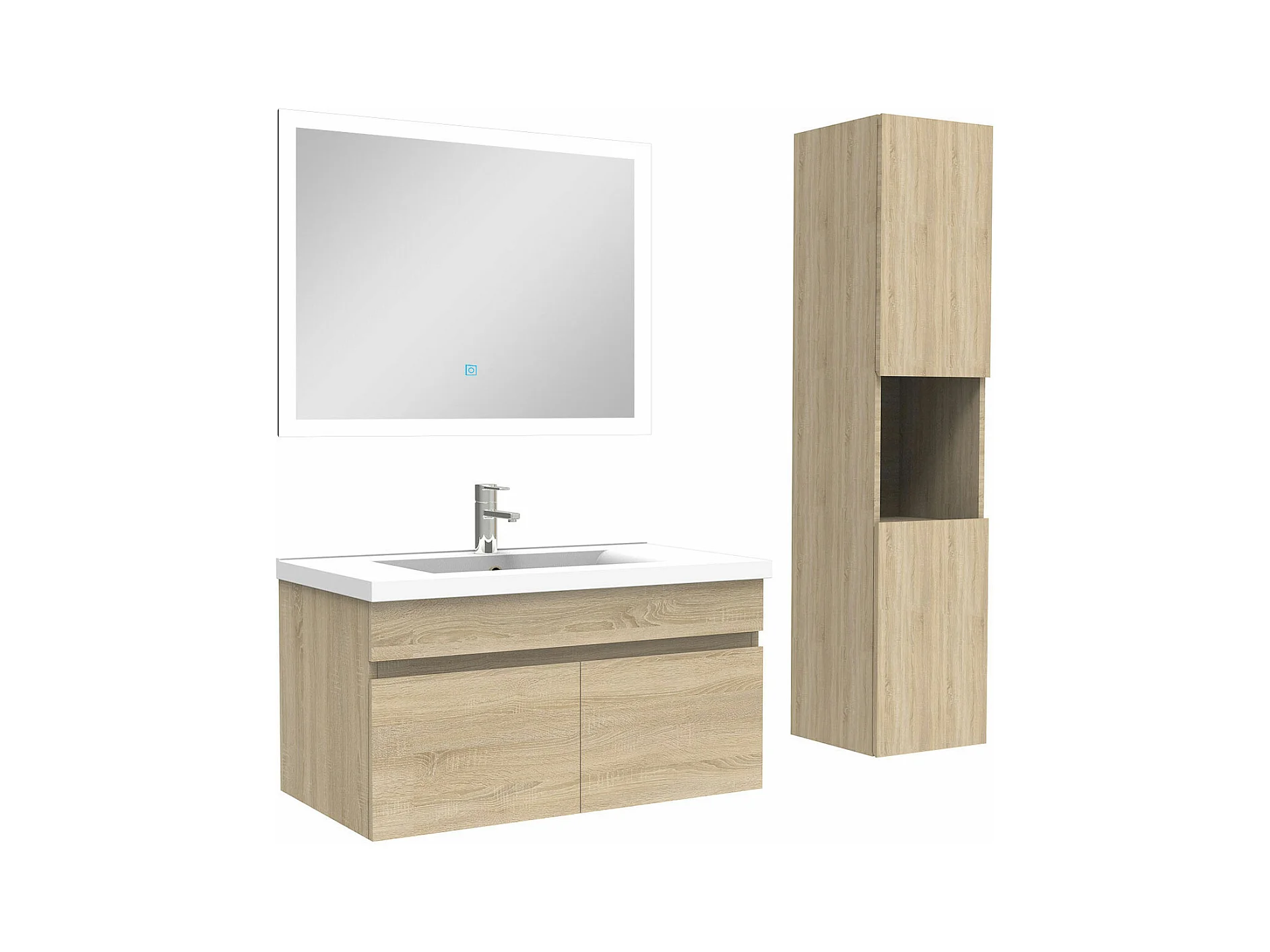 Ensemble meuble Salle de Bain 80cm avec vasque + colonne + miroir lumineux dimmable chêne wotan