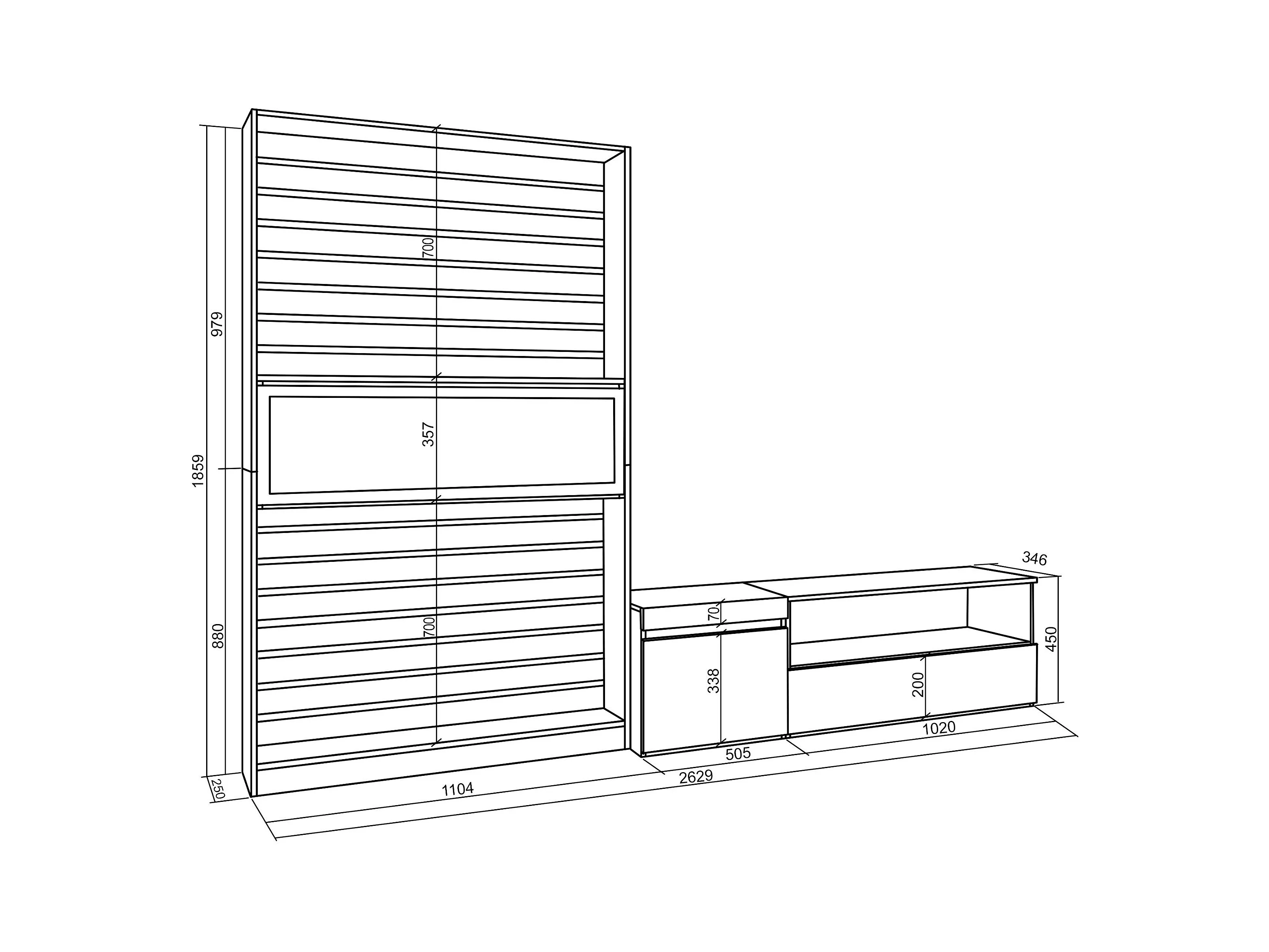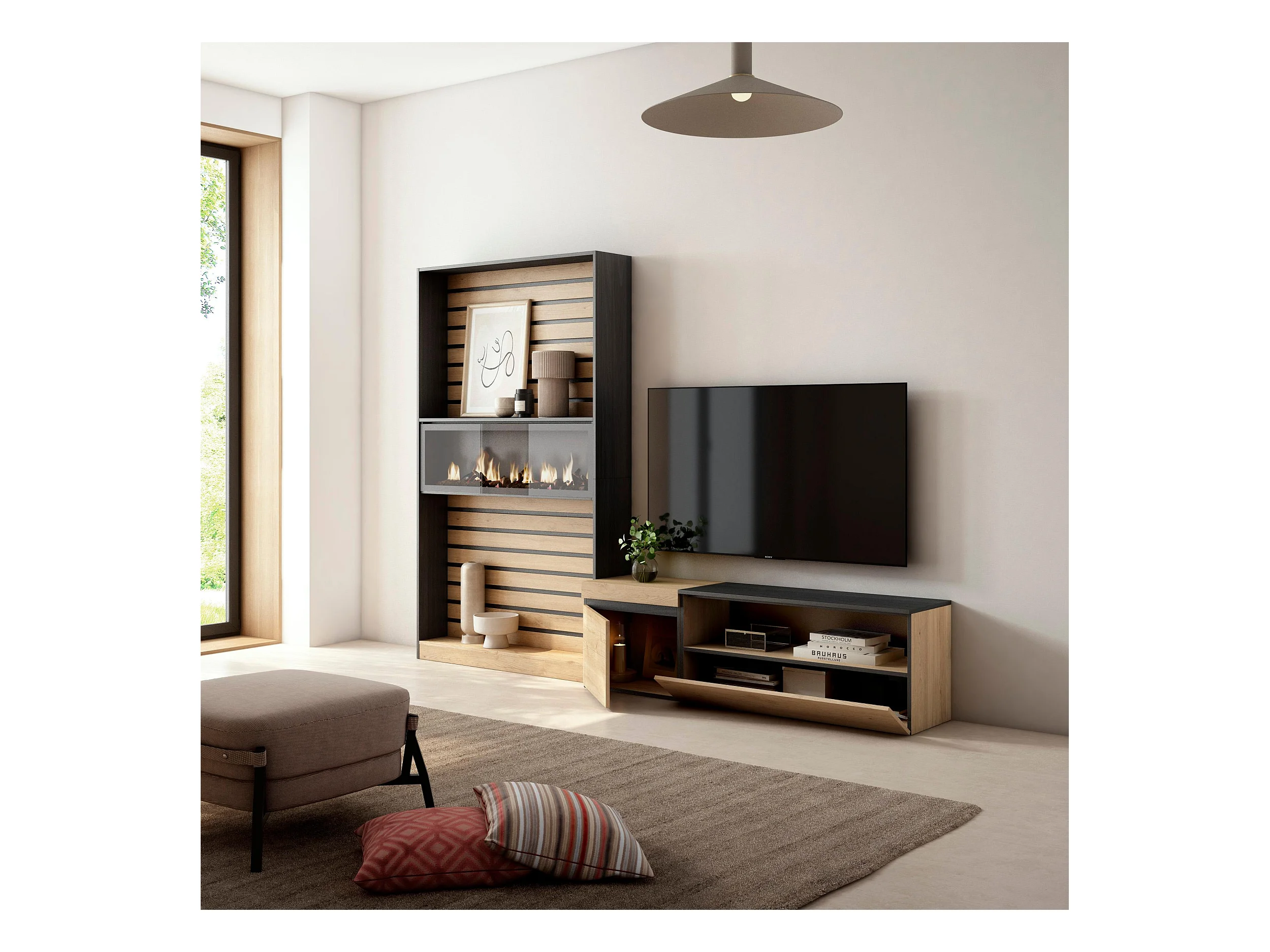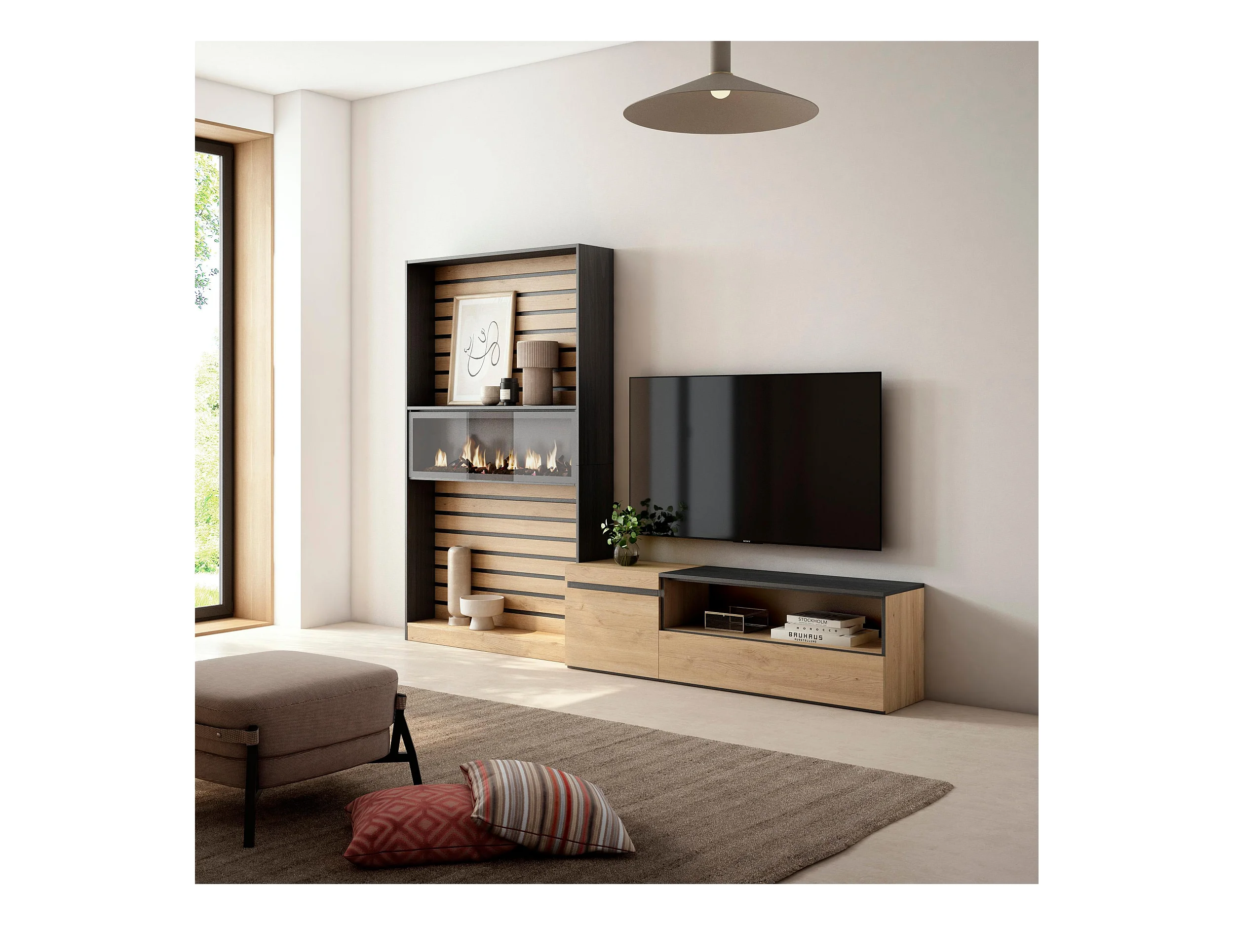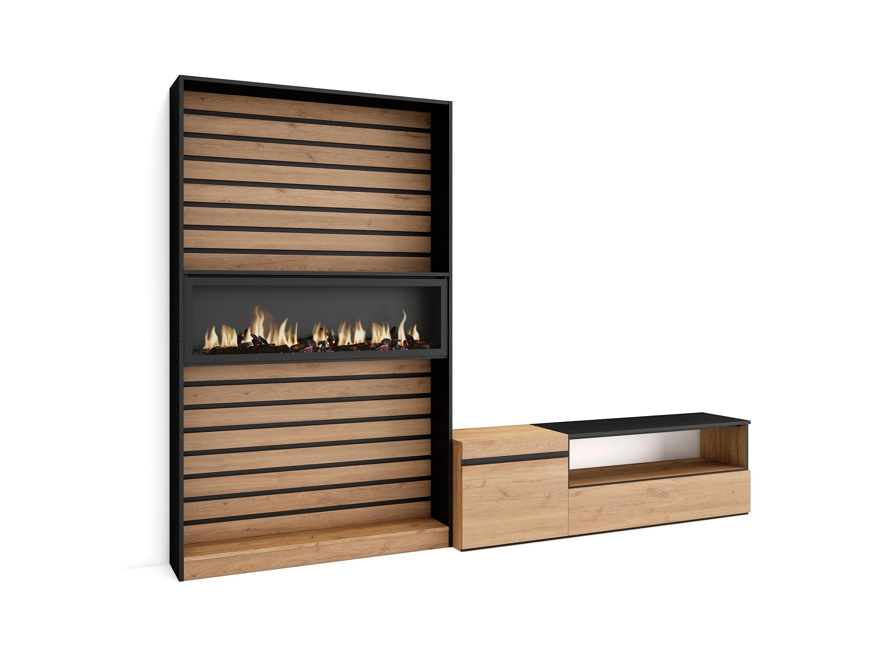 Ensemble Meuble TV, 260x35x186cm, Pour les TV jusqu'à 65", Cheminée électrique, Chêne et noir