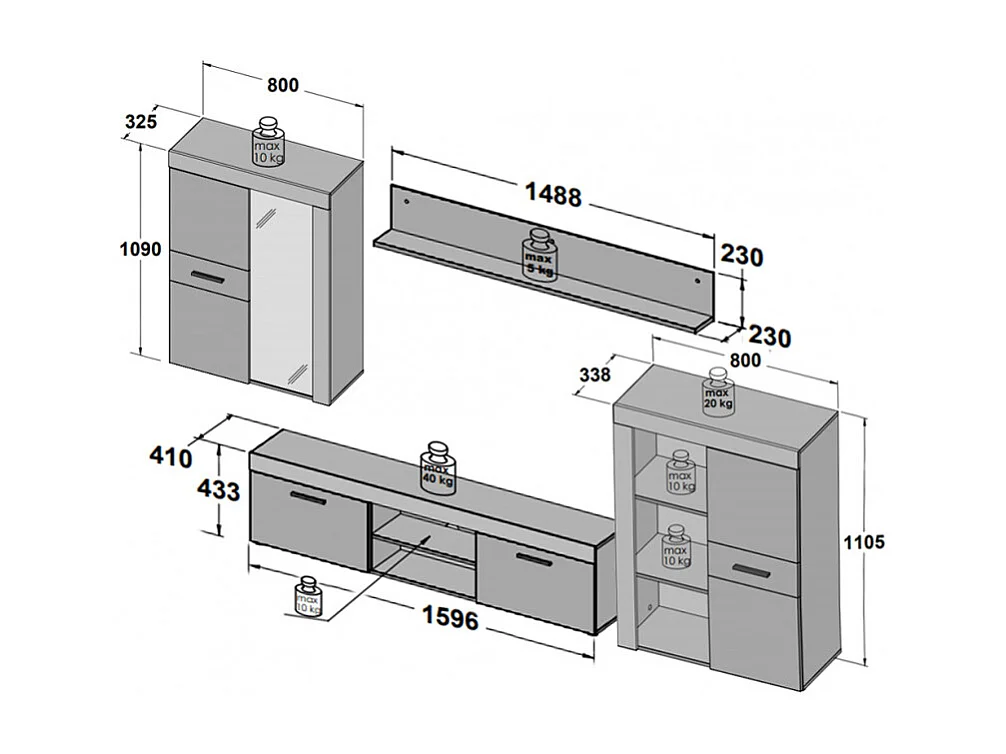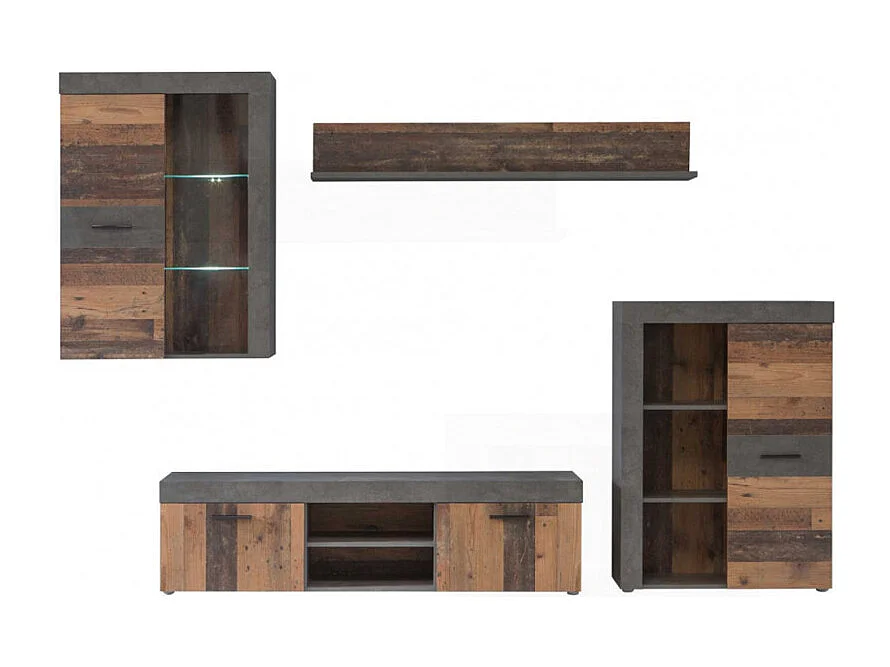 Meuble TV paroi murale 4 éléments décor bois et béton foncé - JULIAN