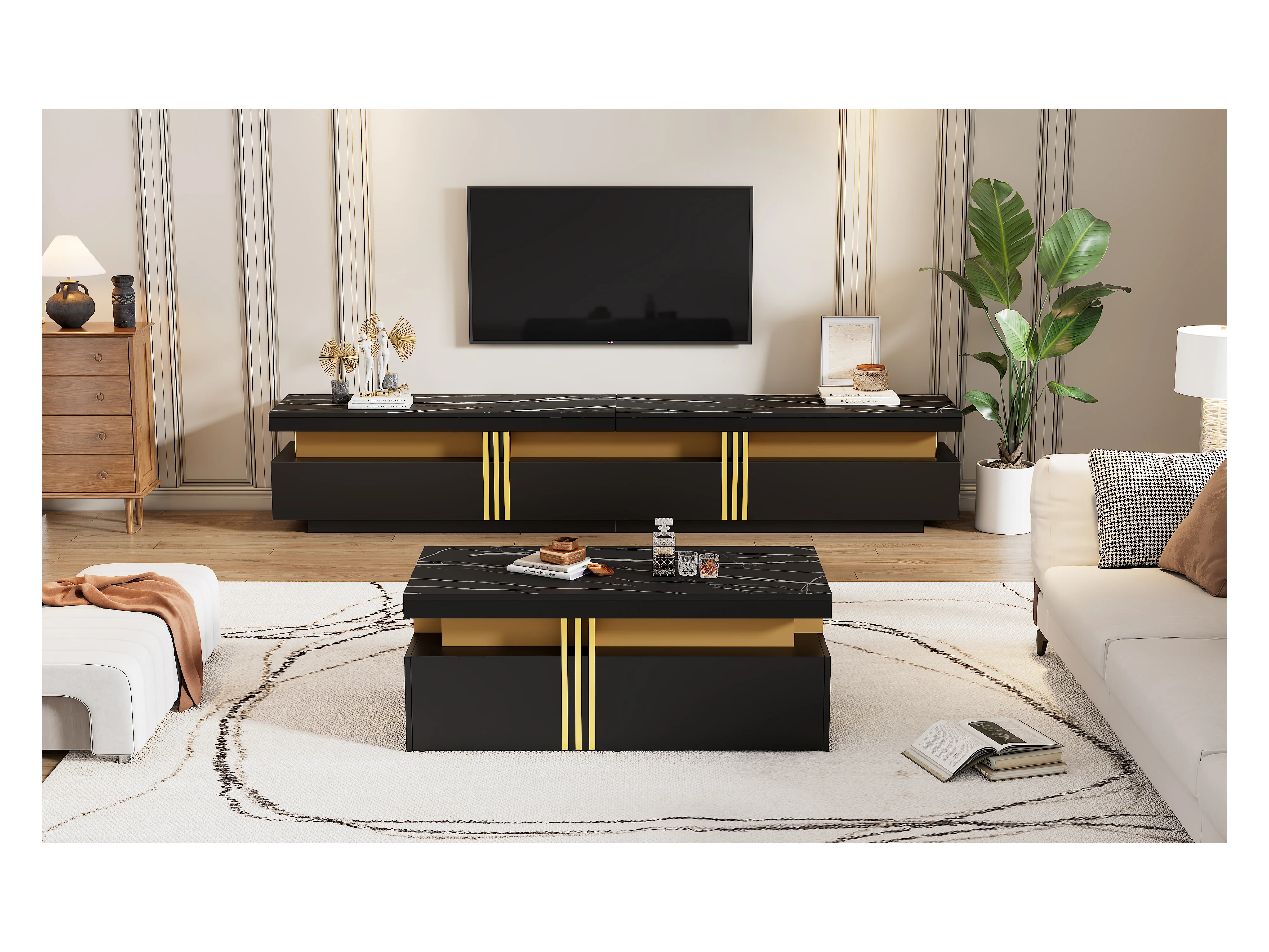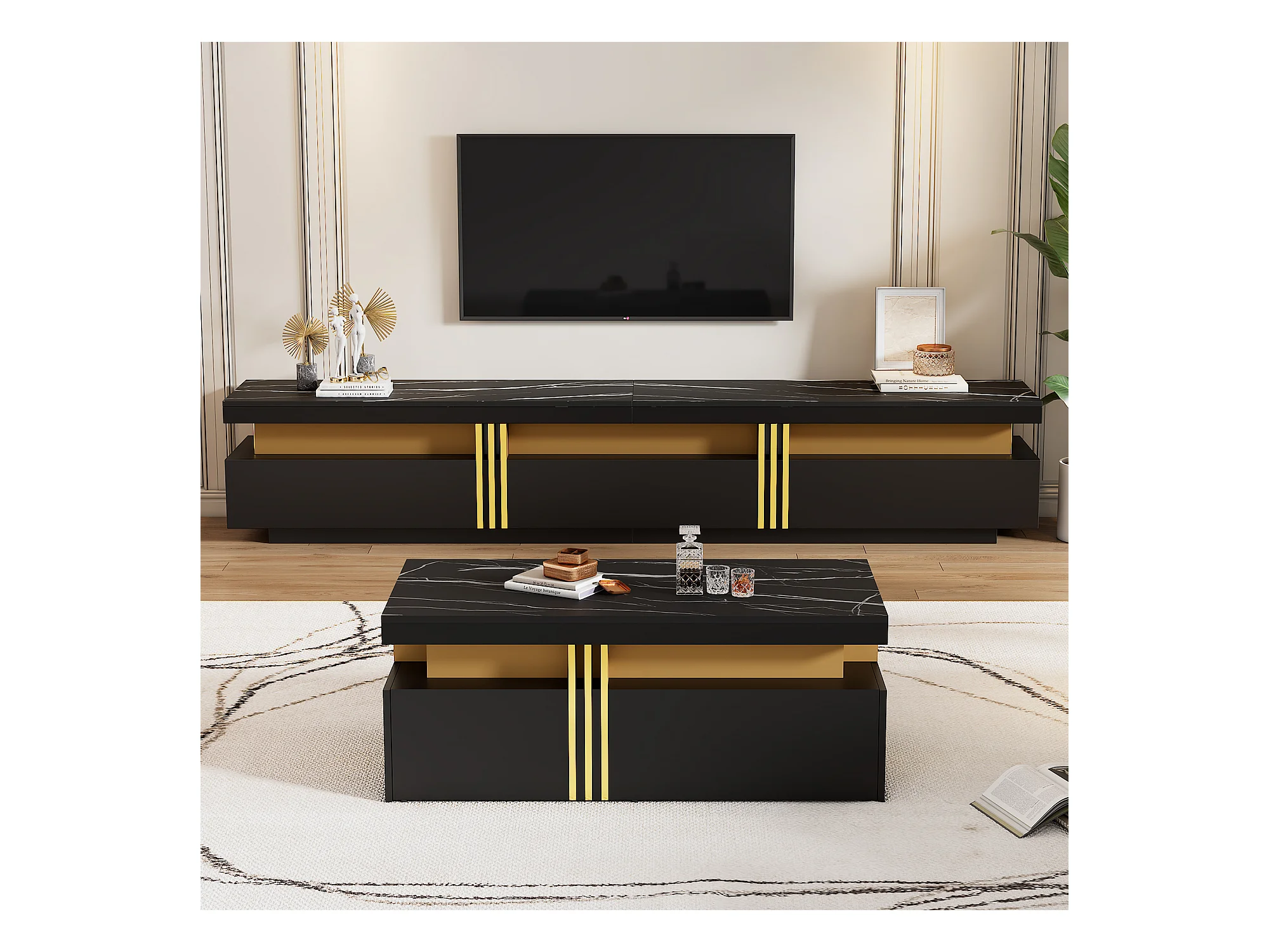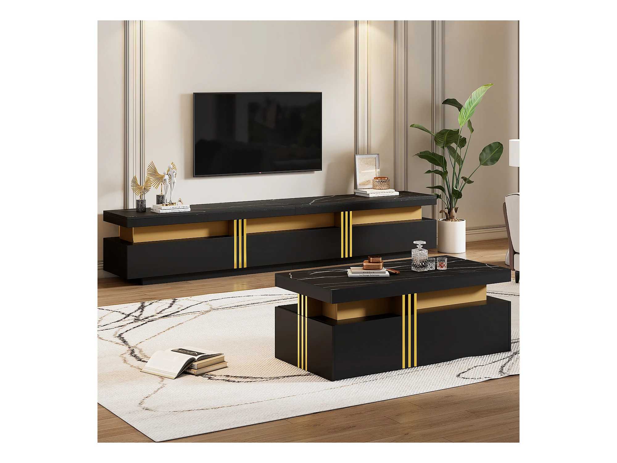 Ensemble meuble TV + table basse - 100 x 50 x 40 cm + 200 x 40 x 42 cm - Panneau de particules - Aspect marbre - Noir