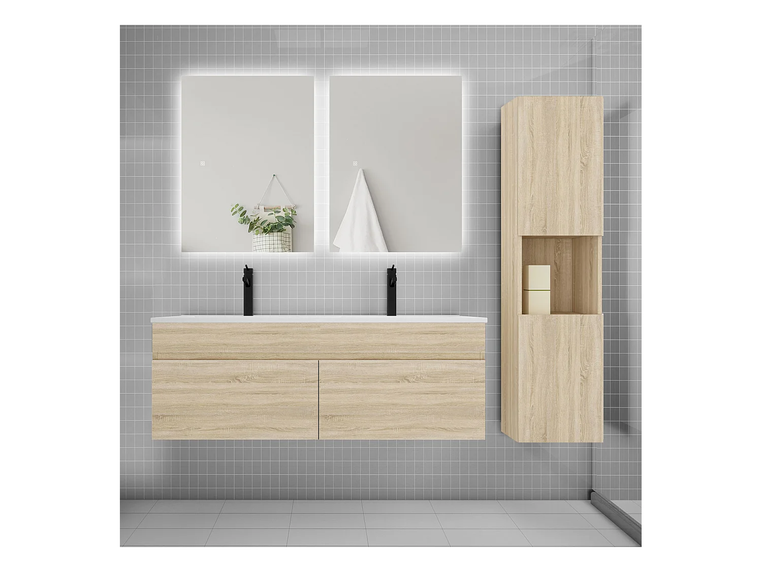 Ensemble meuble vasque 120cm lavabo + colonne + miroir,chêne