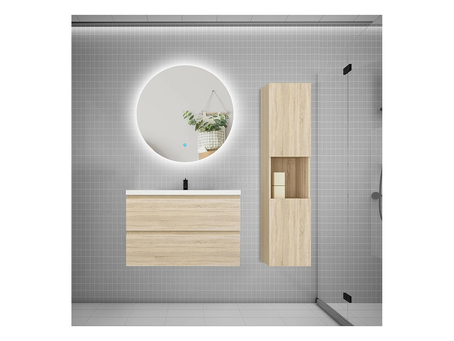 Ensemble meuble vasque 80cm 2 tiroirs + lavabo + colonne + miroir rond,chêne