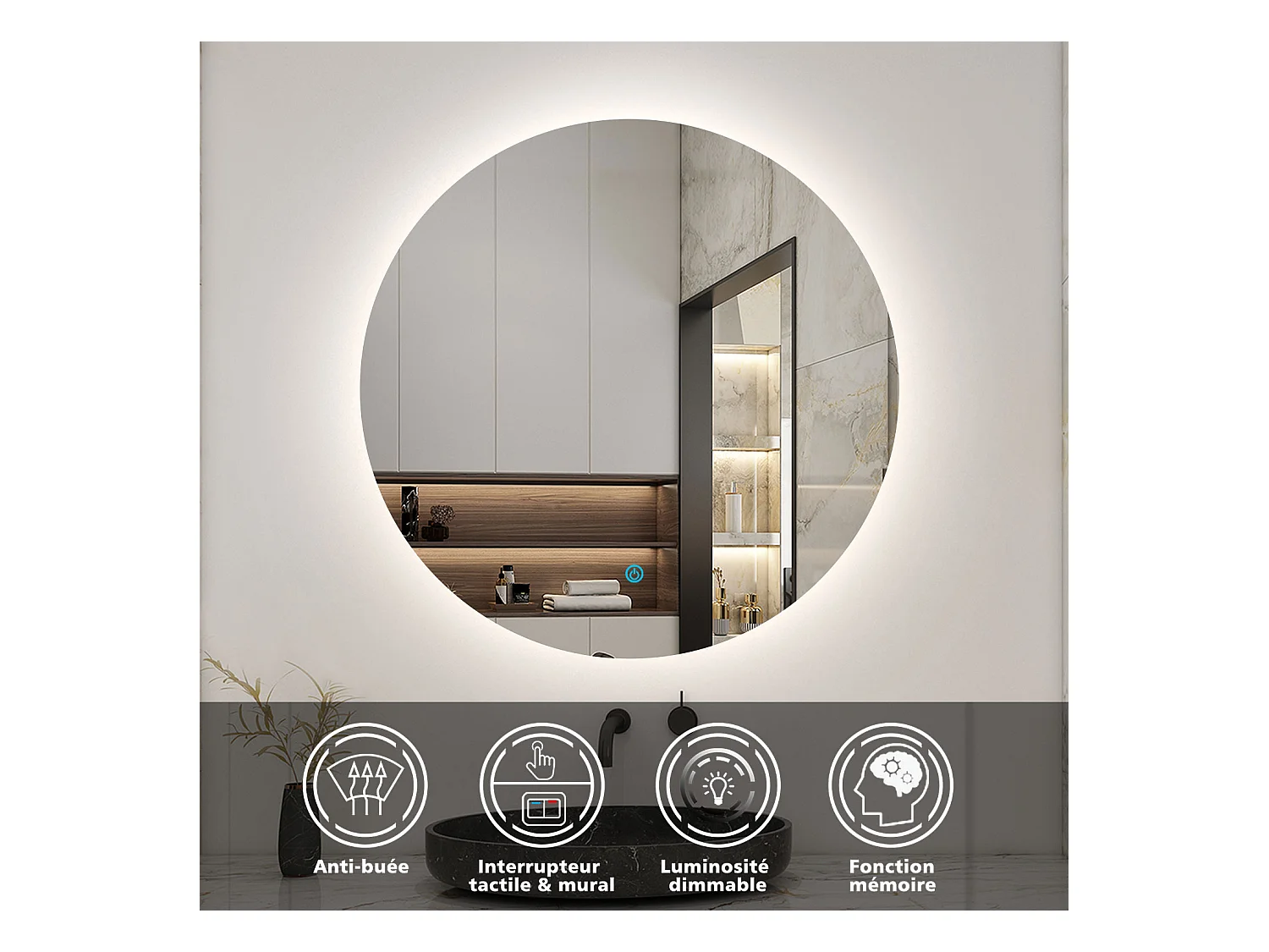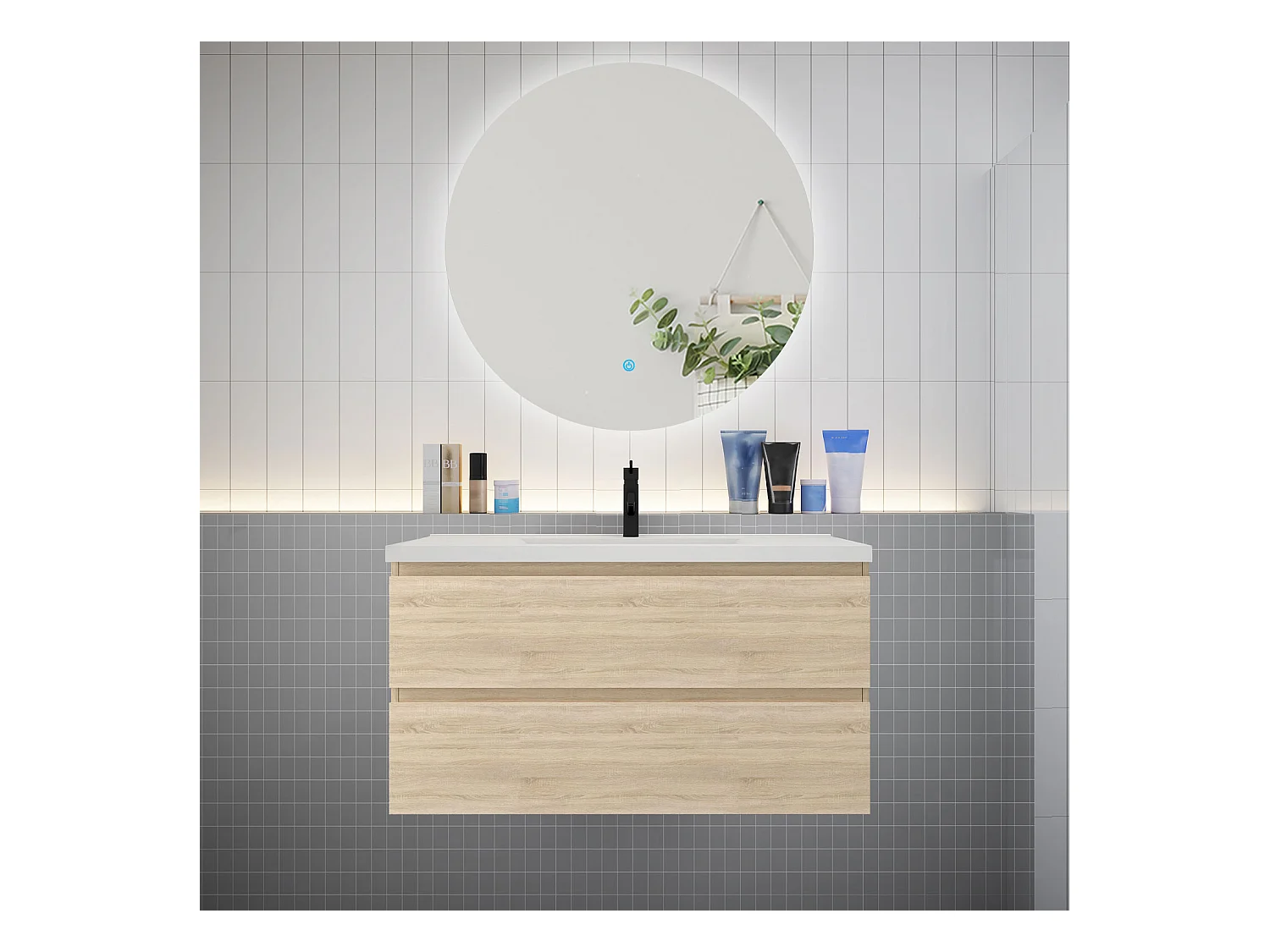Ensemble meuble vasque L.100cm 2 tiroirs + lavabo + LED miroir rond 100cm,chêne
