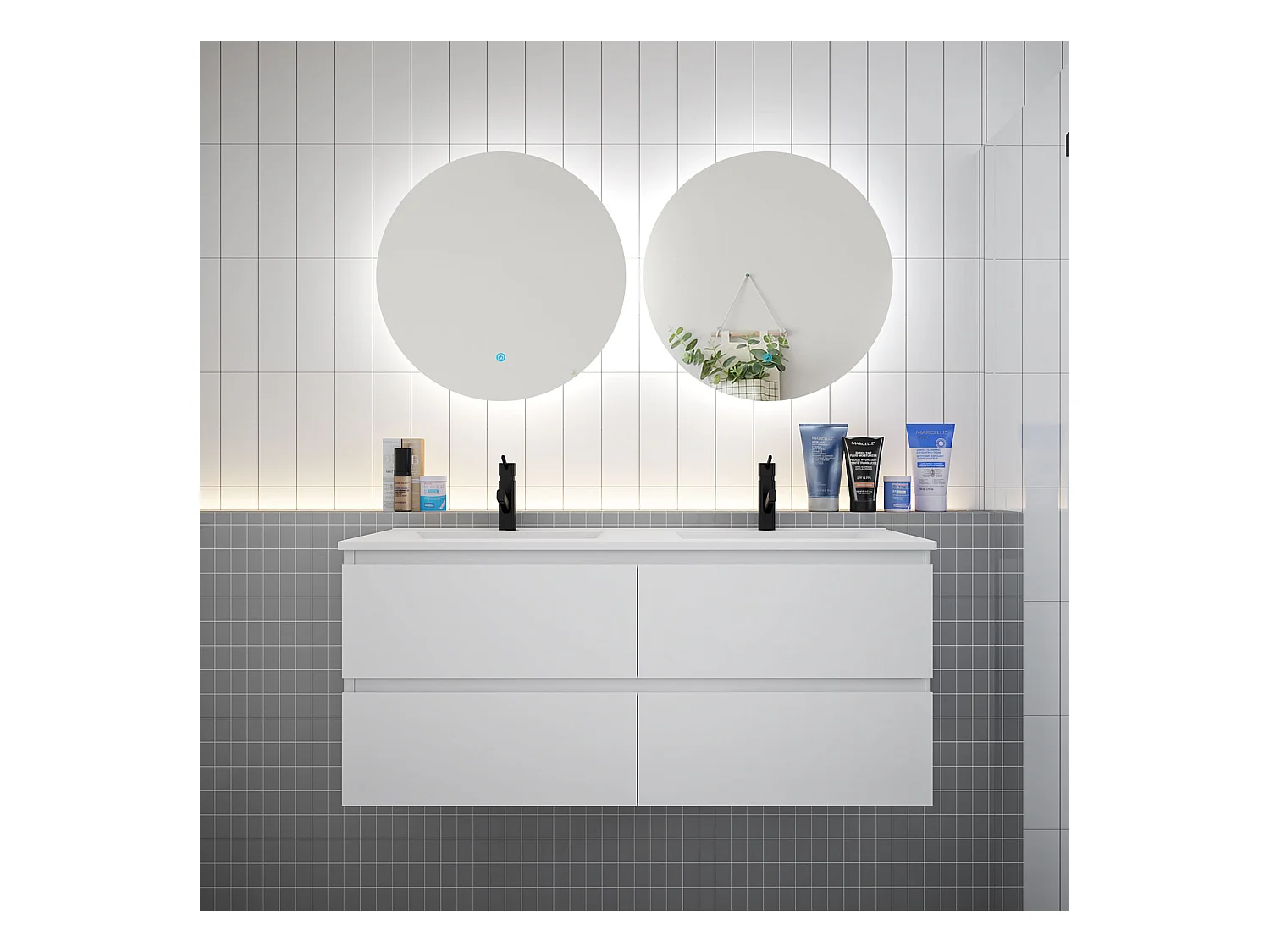 Ensemble meuble vasque L.120cm 2 tiroirs + lavabo + LED miroir rond 60cm,blanc