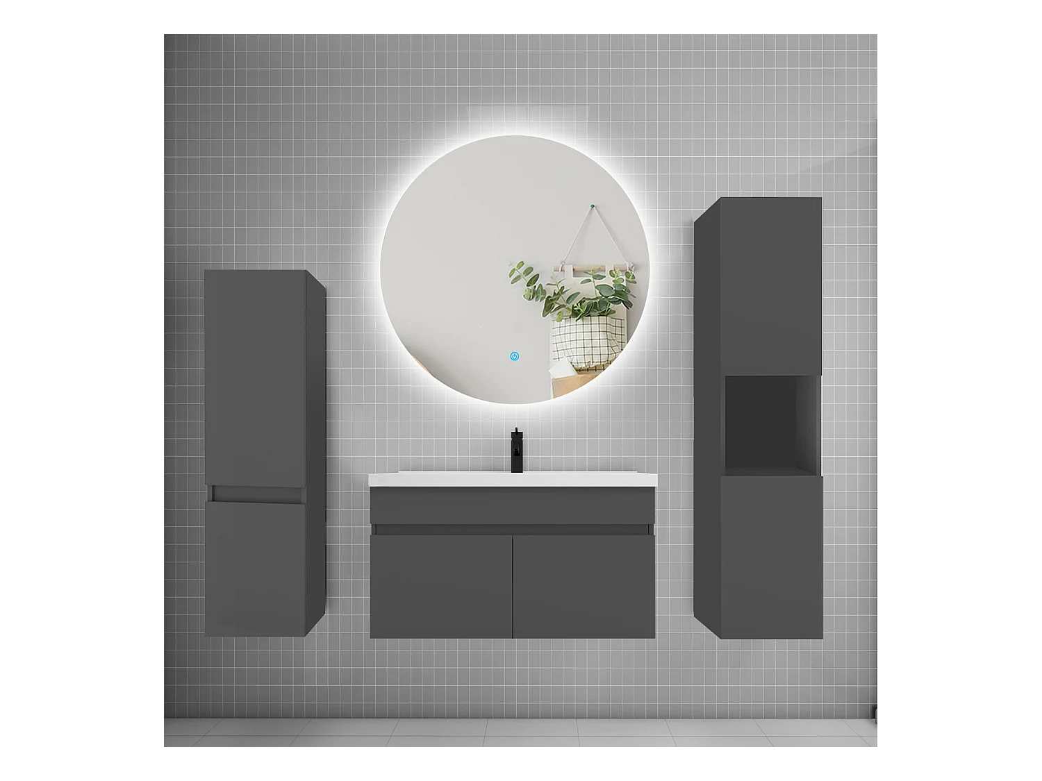Ensemble meuble vasque L.80cm lavabo + colonne + miroir rond mural 80cm,anthracite