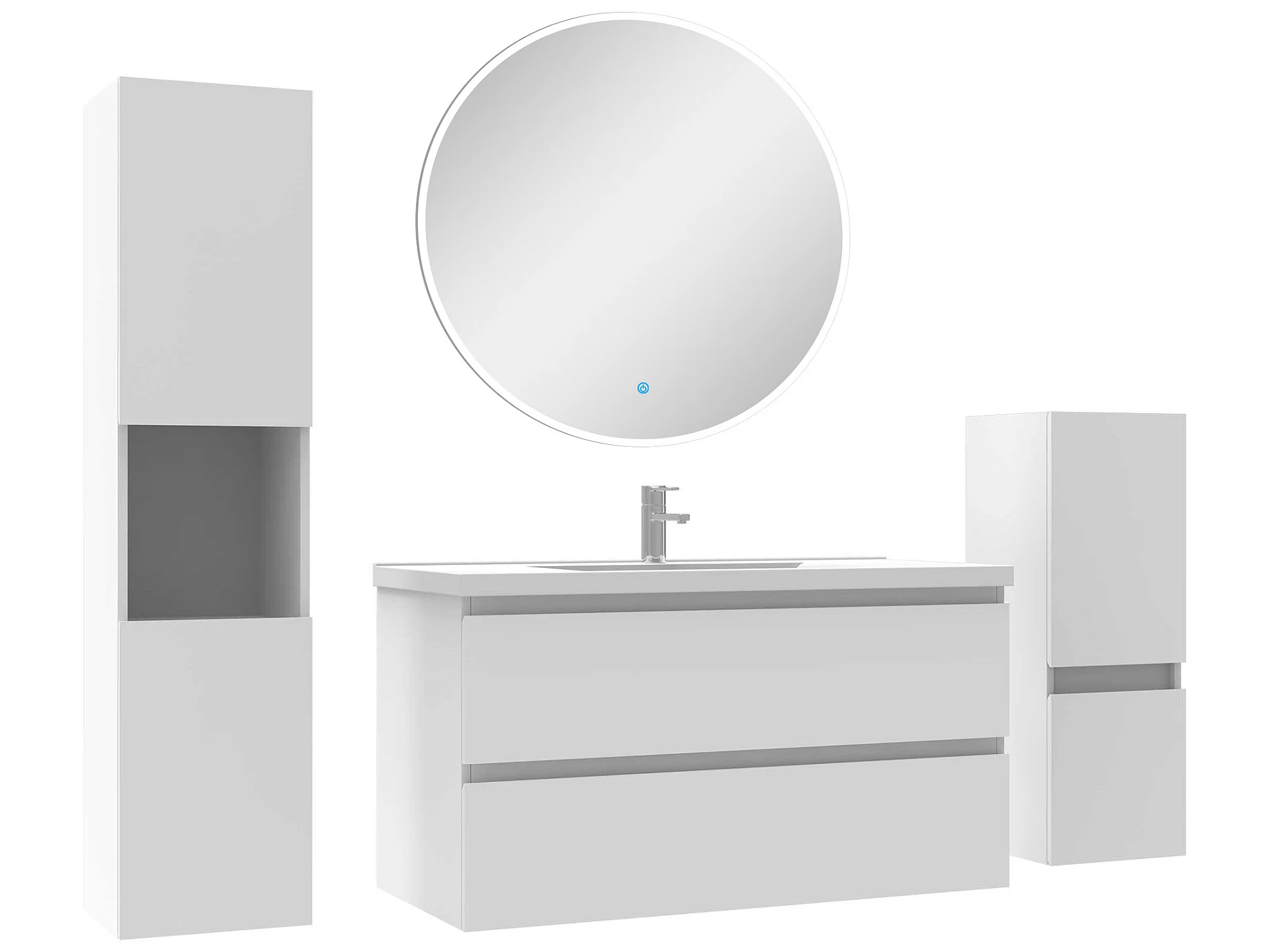 Ensemble meubles Salle de Bain 100cm simple vasque + colonne + miroir rond mural Blanc