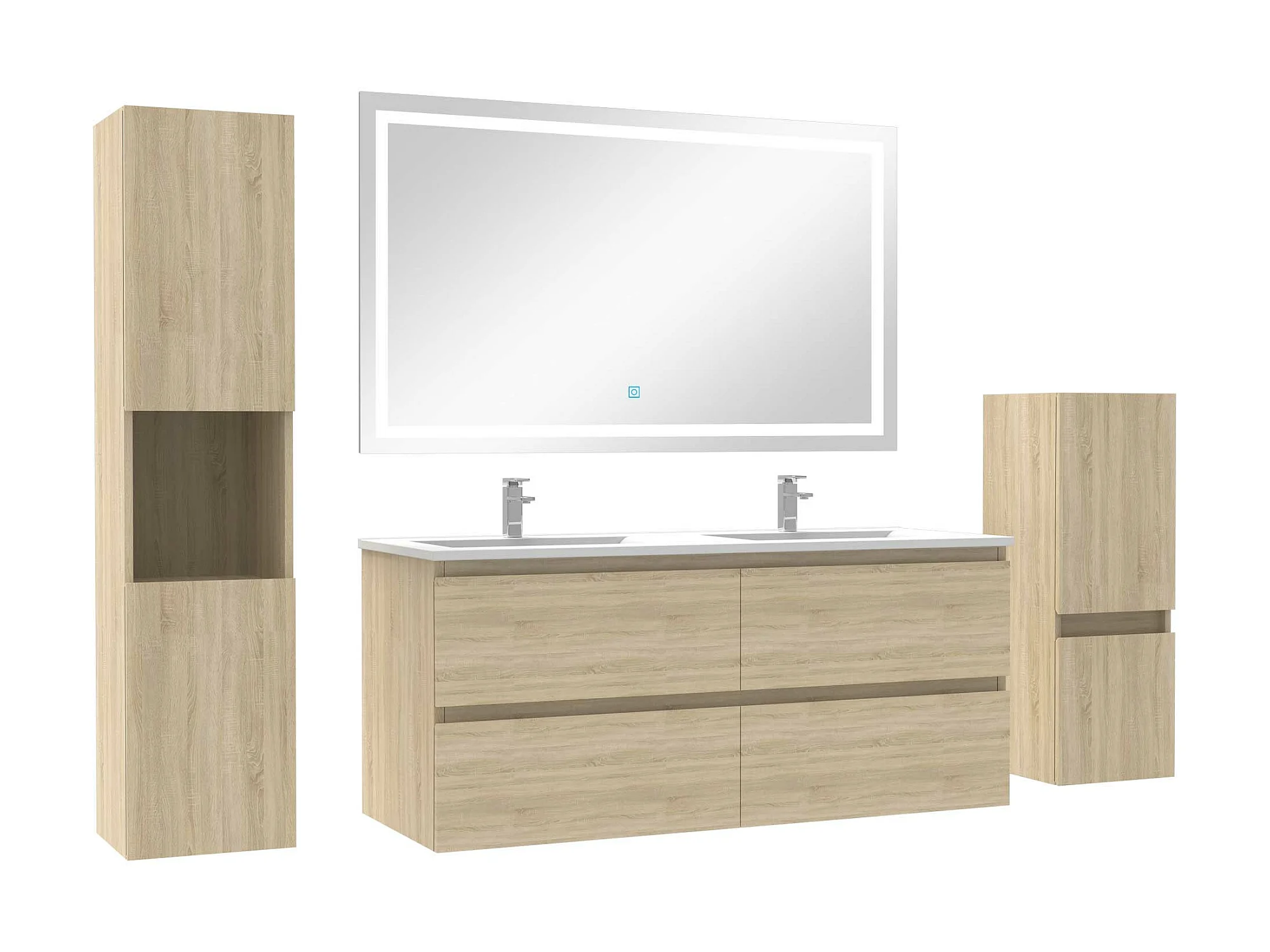 Ensemble meubles Salle de Bain 120cm double vasque + colonne + miroir LED Chêne Wotan