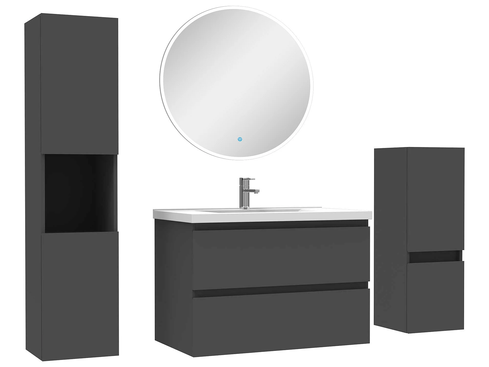 Ensemble meubles Salle de Bain 80cm simple vasque + colonne + miroir rond mural Anthracite