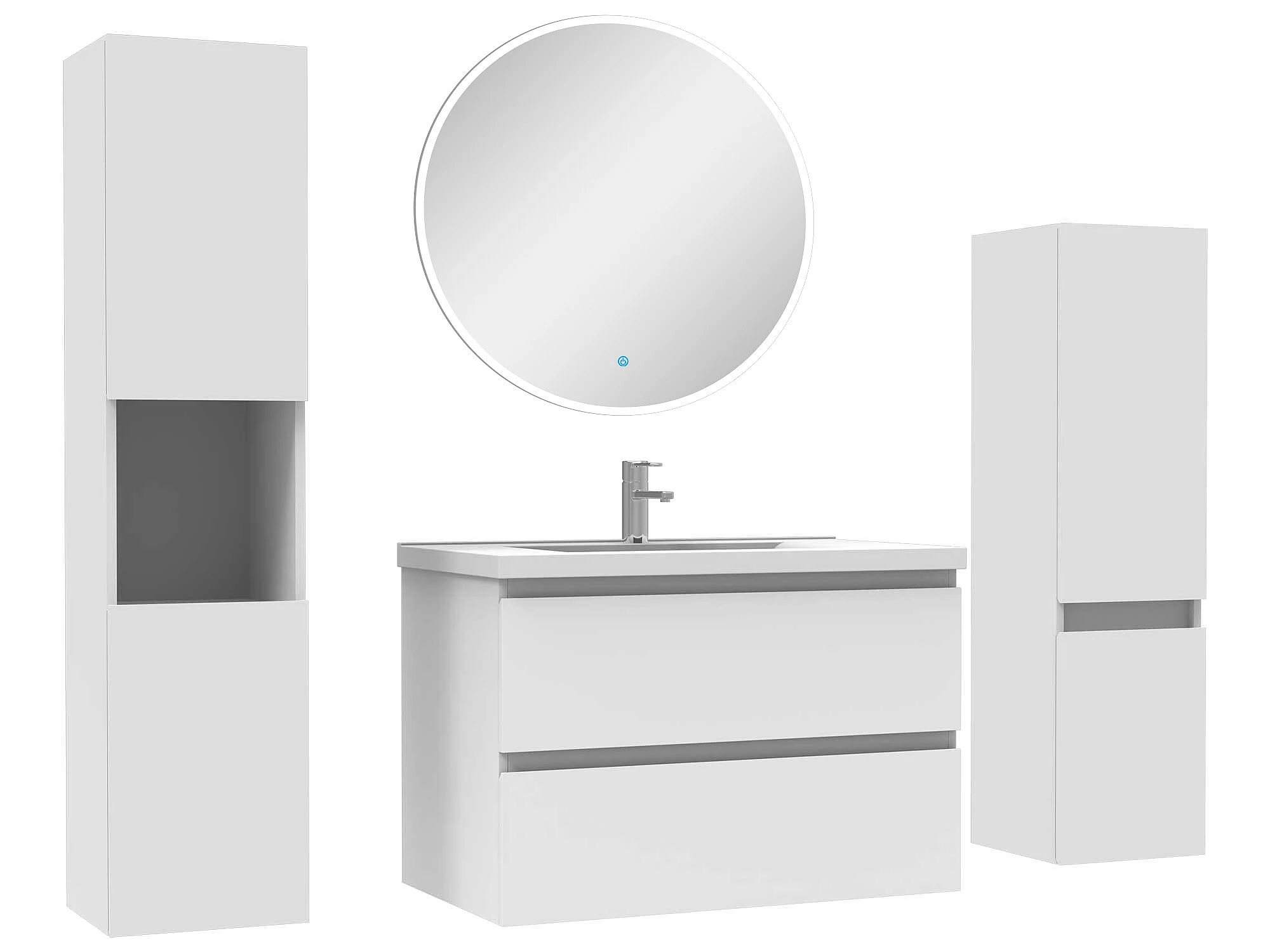 Ensemble meubles Salle de Bain 80cm vasque + colonne + miroir rond mural Blanc