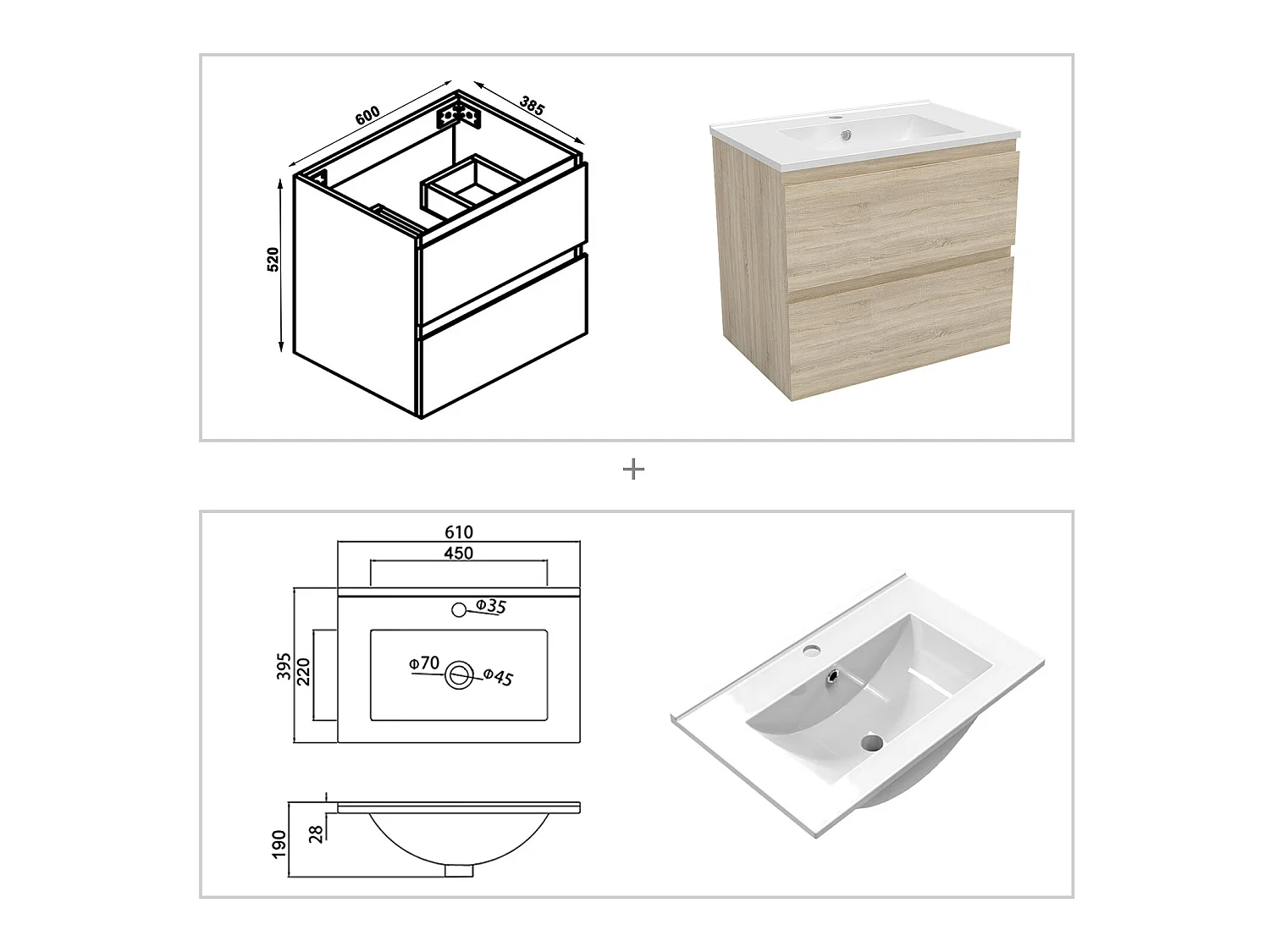 Ensemble meubles Salle de Bain avec colonne et miroir rond mural 60cm meuble Chêne Wotan