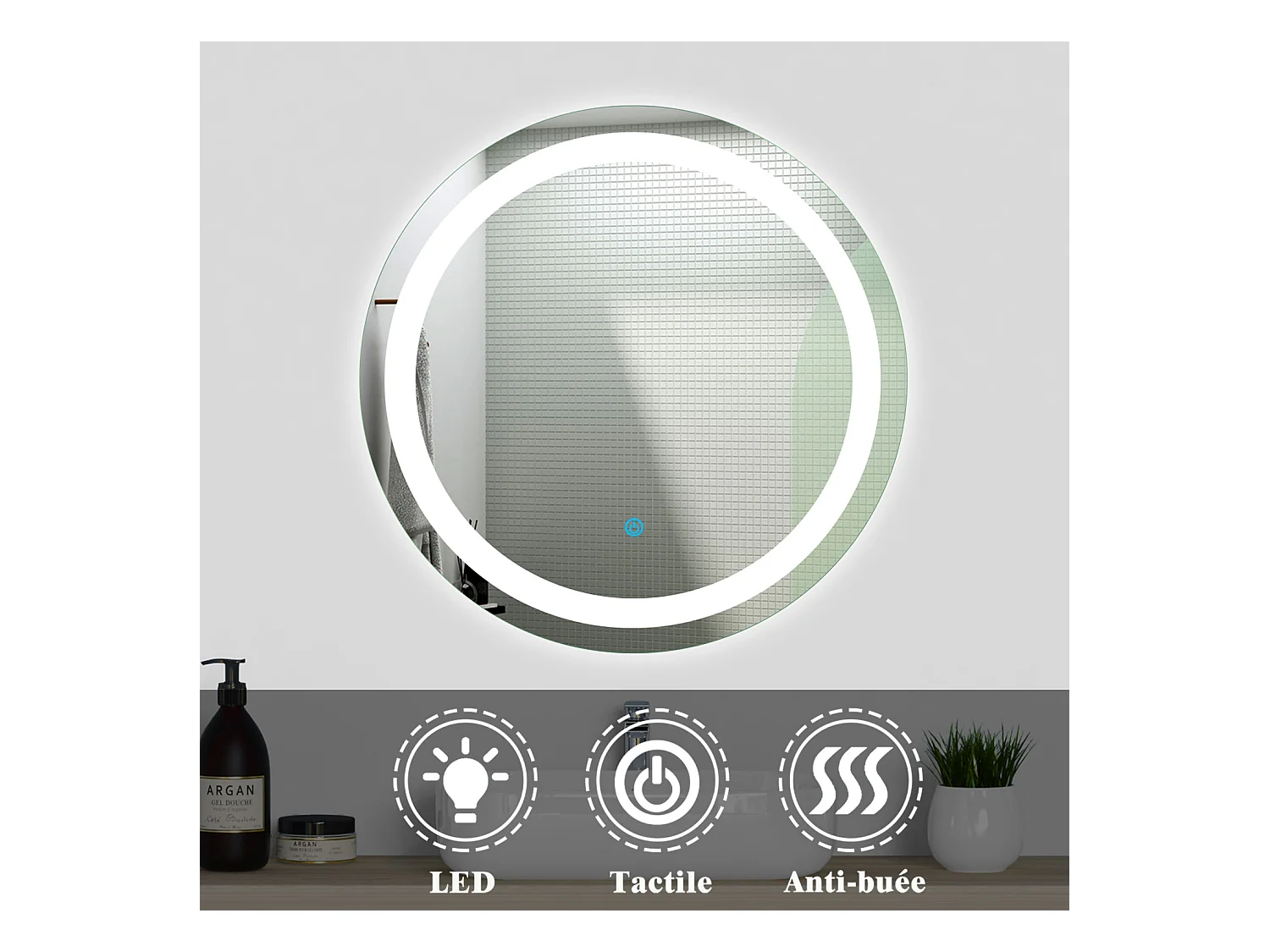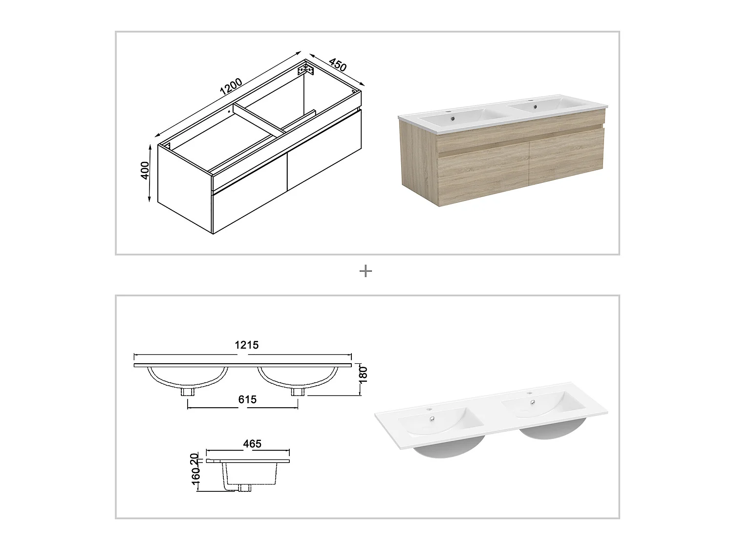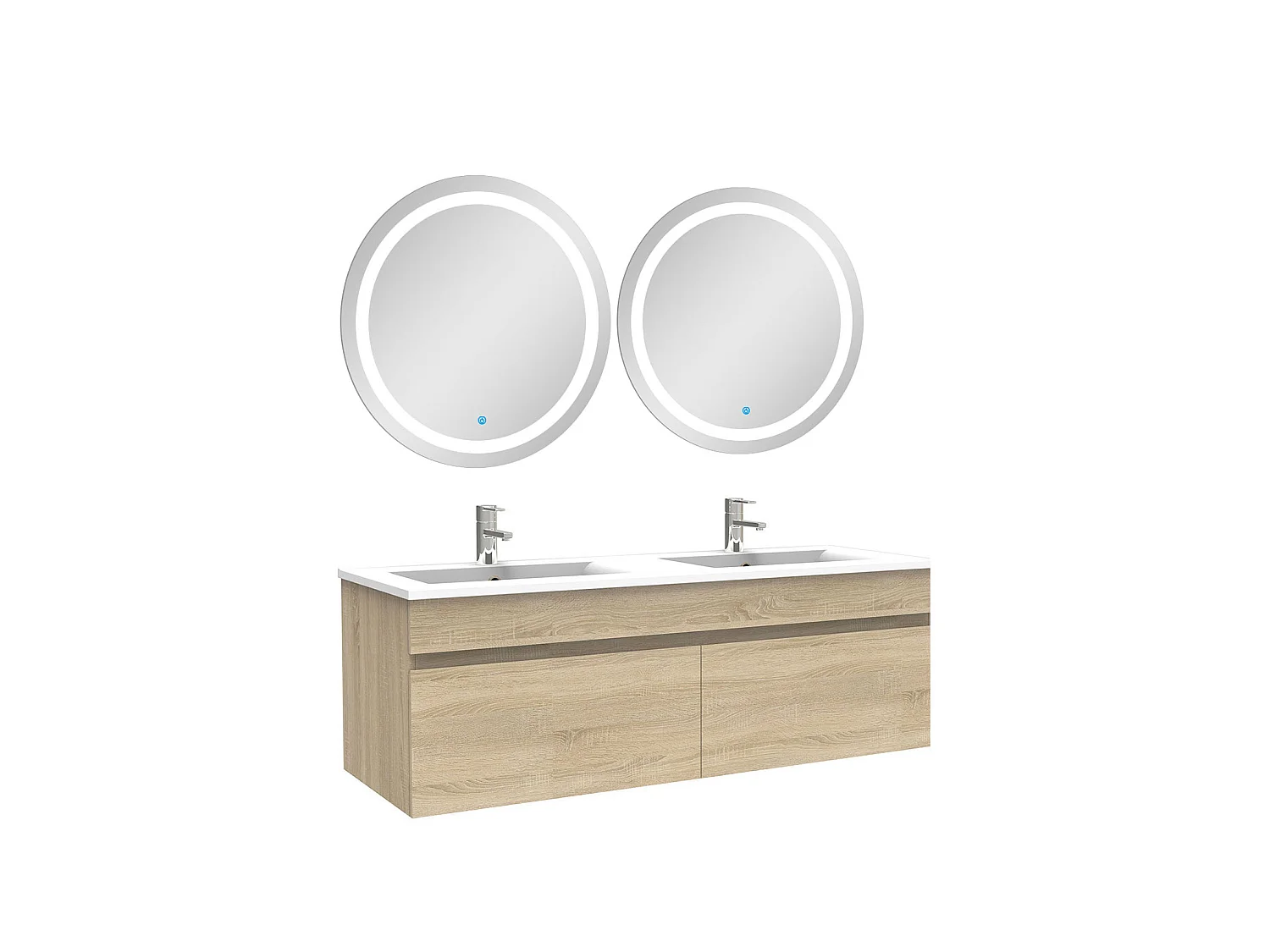 Ensemble meubles Salle de Bain double vasque 120cm + rond miroir lumineux Chêne Wotan