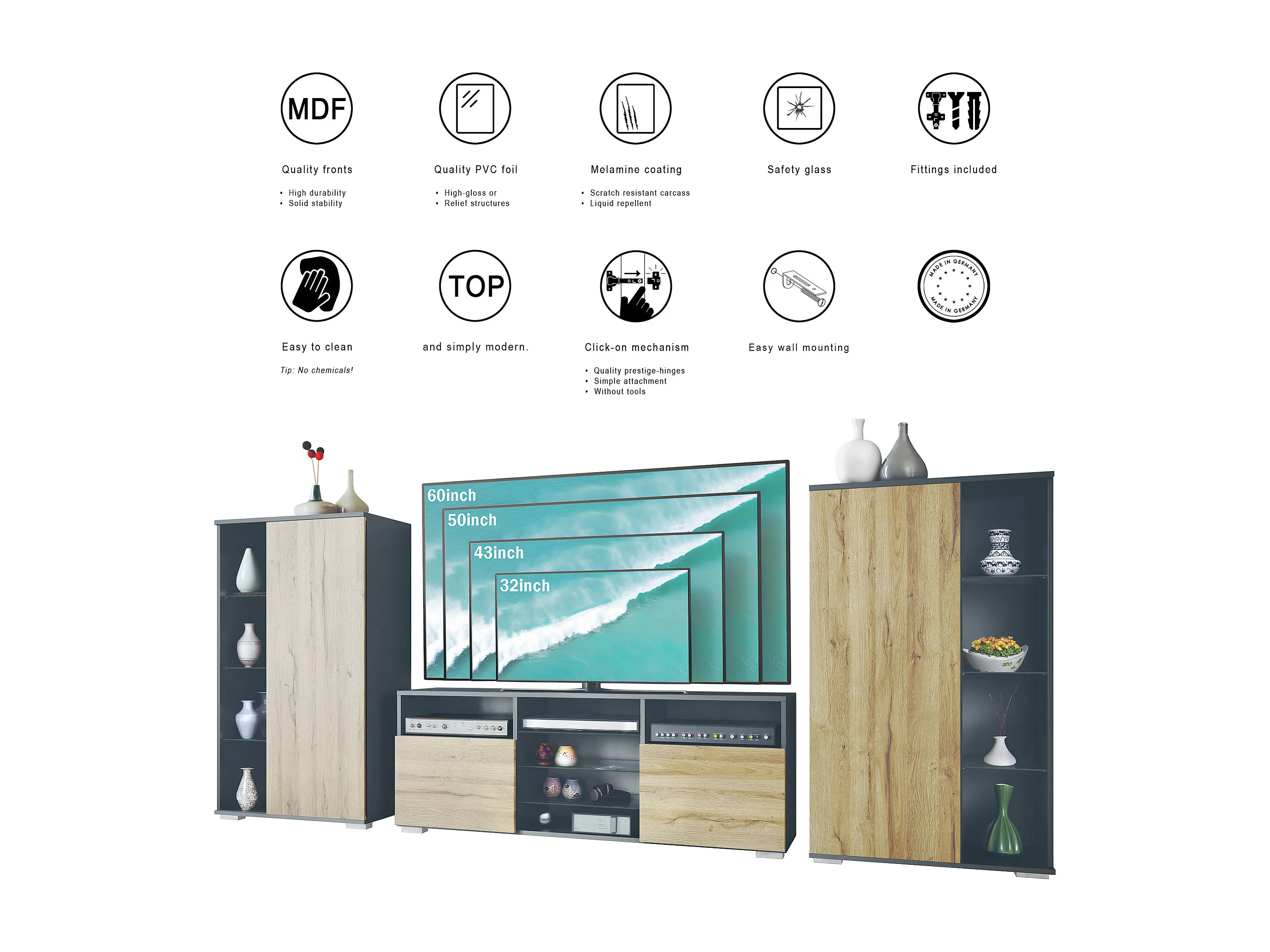 Ensemble mural Davos pour salon, comprenant 2 vitrines et 1 meuble TV, anthracite mat/blanc haute brillance (329 x 134 x 35 cm)