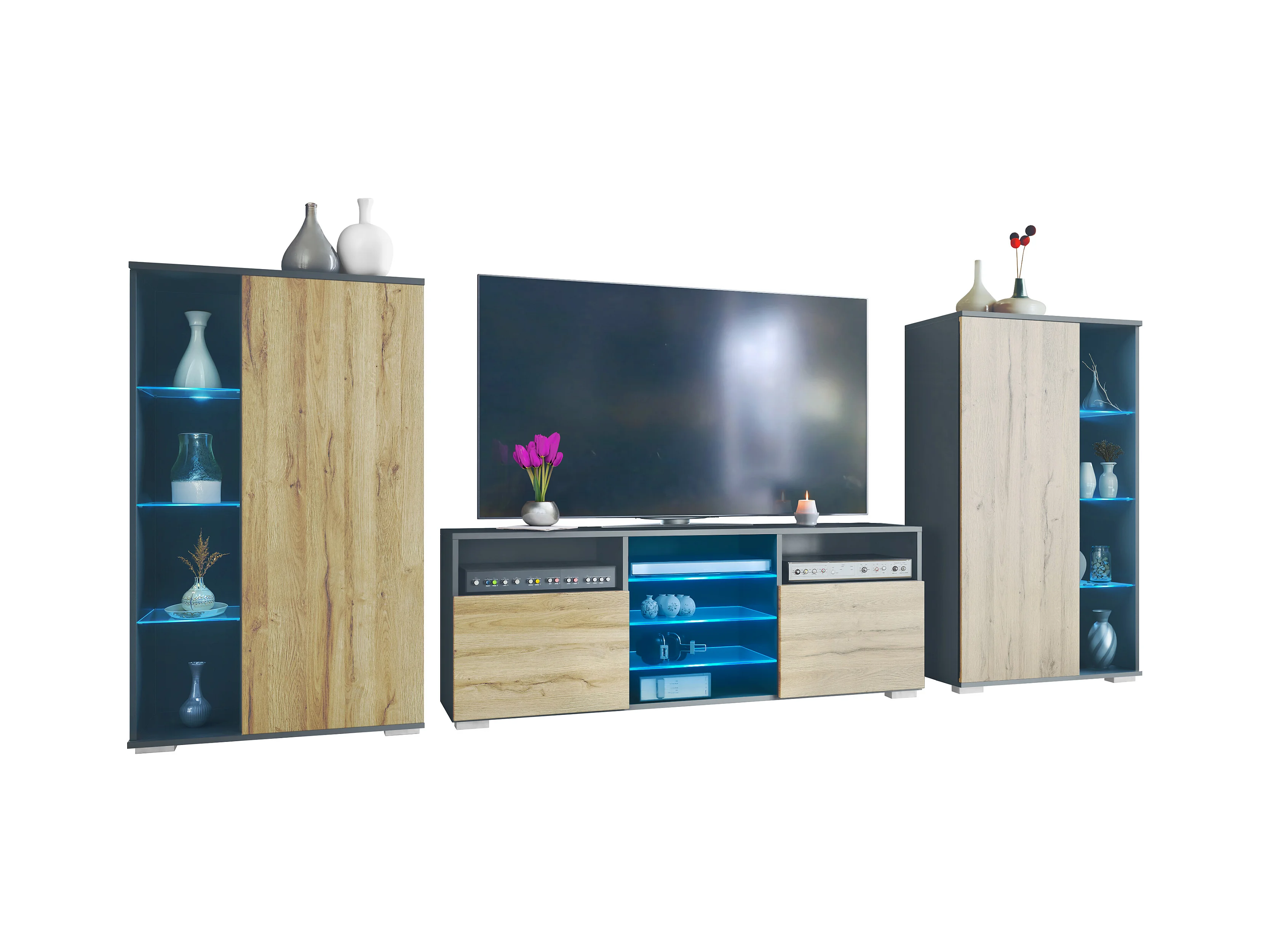 Ensemble mural Davos pour salon, comprenant 2 vitrines et 1 meuble TV, anthracite mat/chêne nature éclairage LED inclus (329 x 134 x 35 cm)