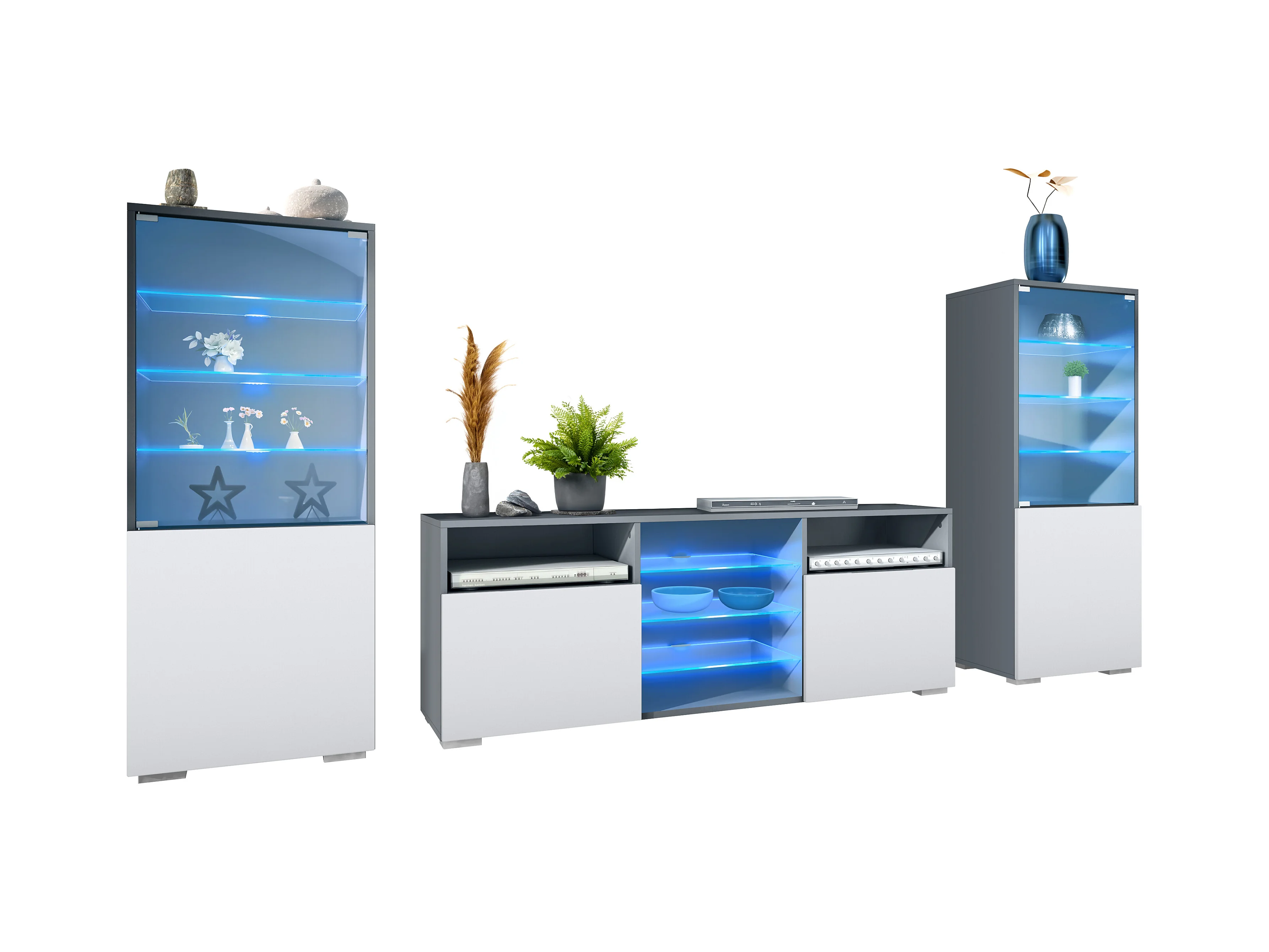 Ensemble mural Granada pour salon, comprenant 2 vitrines et 1 meuble TV, anthracite mat/blanc mat éclairage LED inclus (286 x 122,5 x 35 cm)