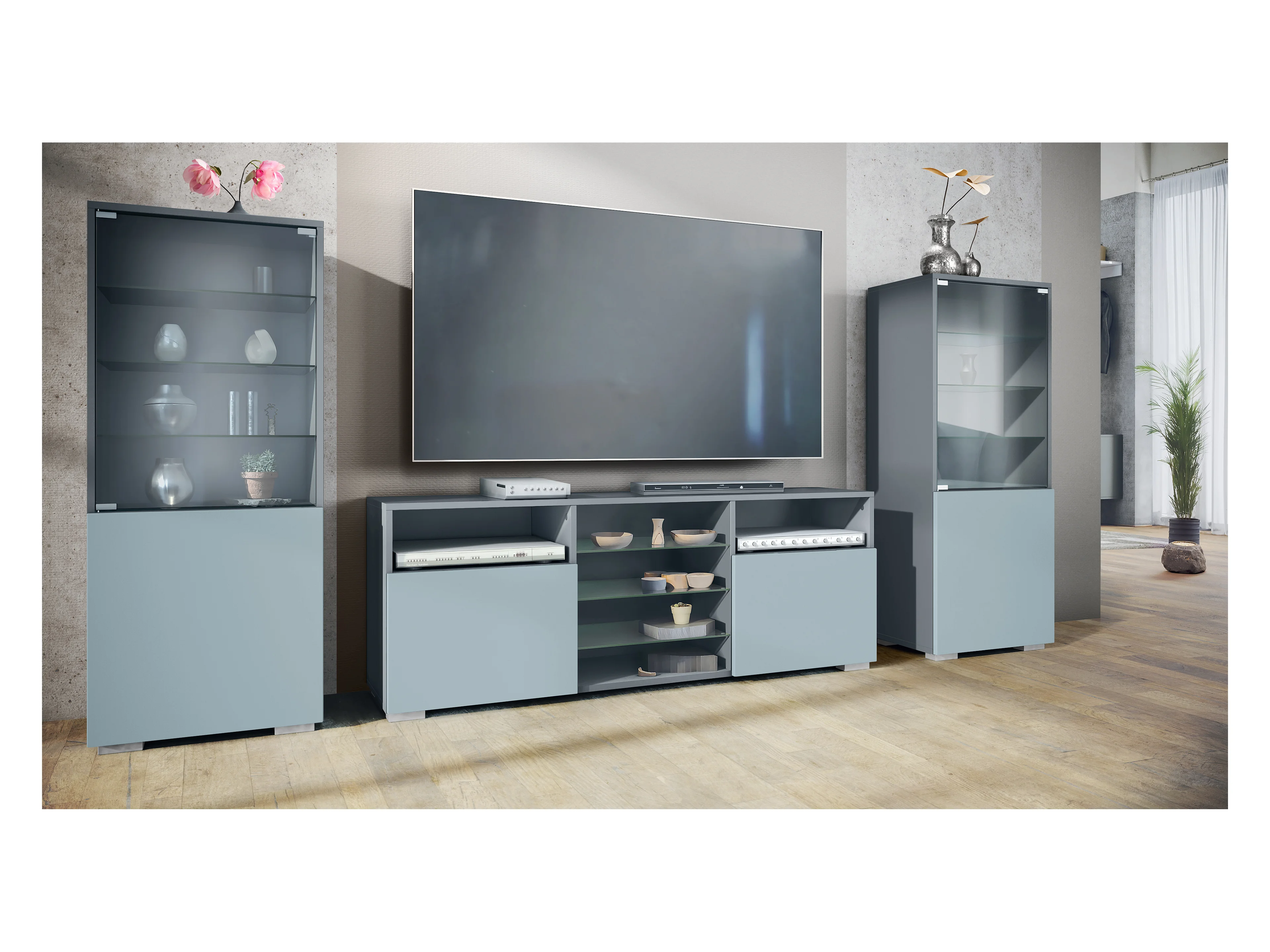 Ensemble mural Granada pour salon, comprenant 2 vitrines et 1 meuble TV, anthracite mat/denim mat (286 x 122,5 x 35 cm)