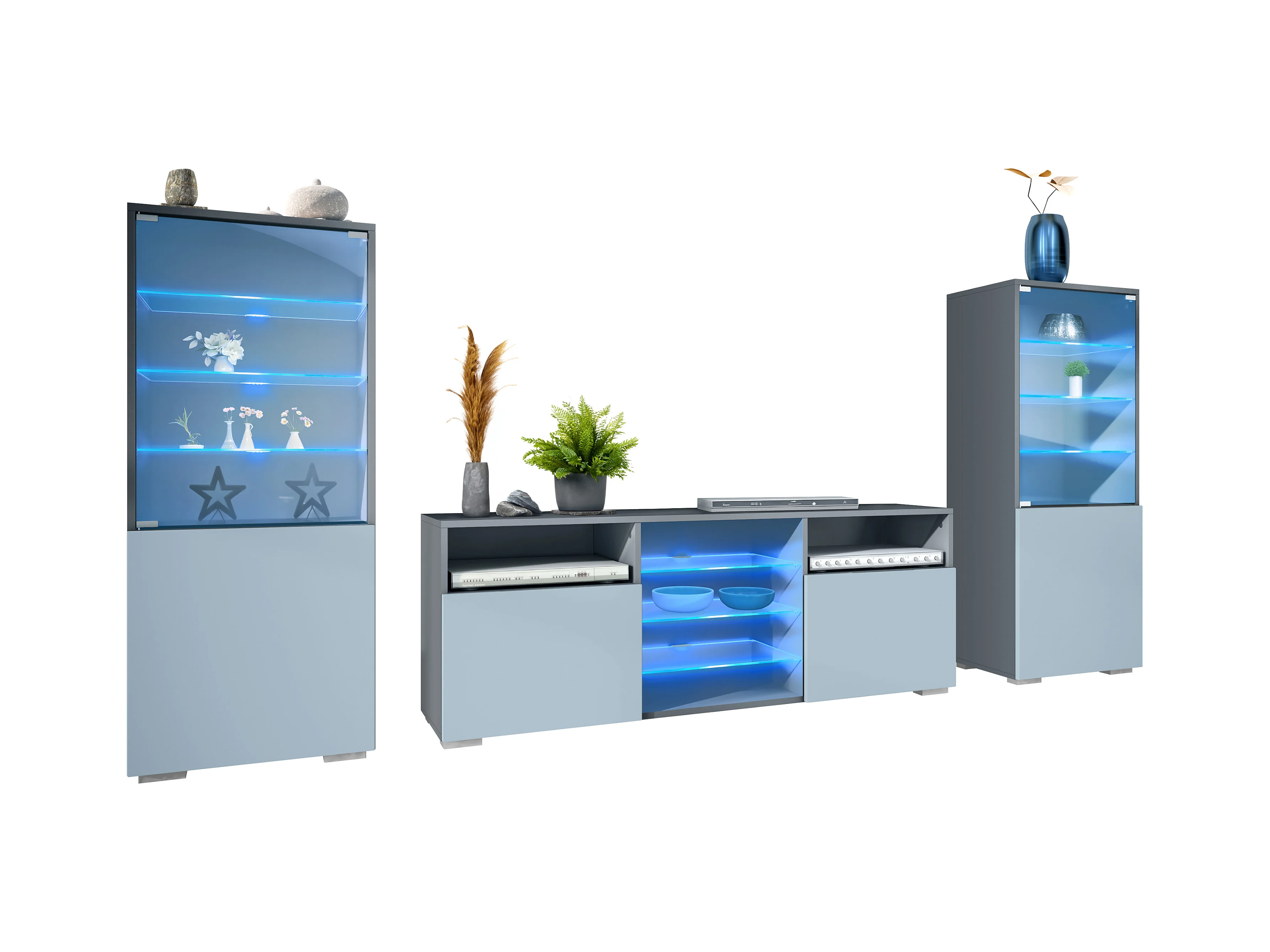 Ensemble mural Granada pour salon, comprenant 2 vitrines et 1 meuble TV, anthracite mat/denim mat éclairage LED inclus (286 x 122,5 x 35 cm)