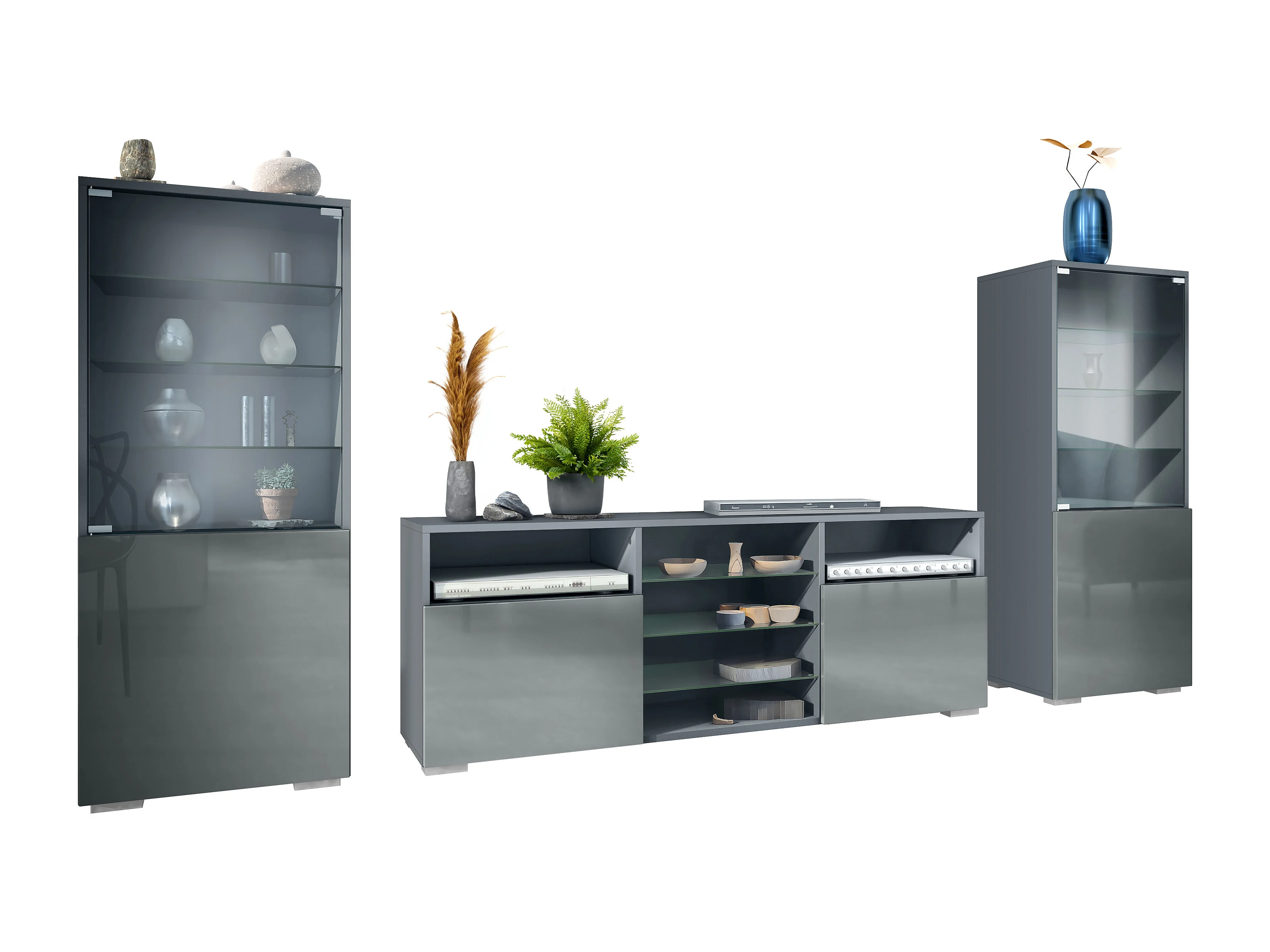 Ensemble mural Granada pour salon, comprenant 2 vitrines et 1 meuble TV, anthracite mat/gris haute brillance (286 x 122,5 x 35 cm)