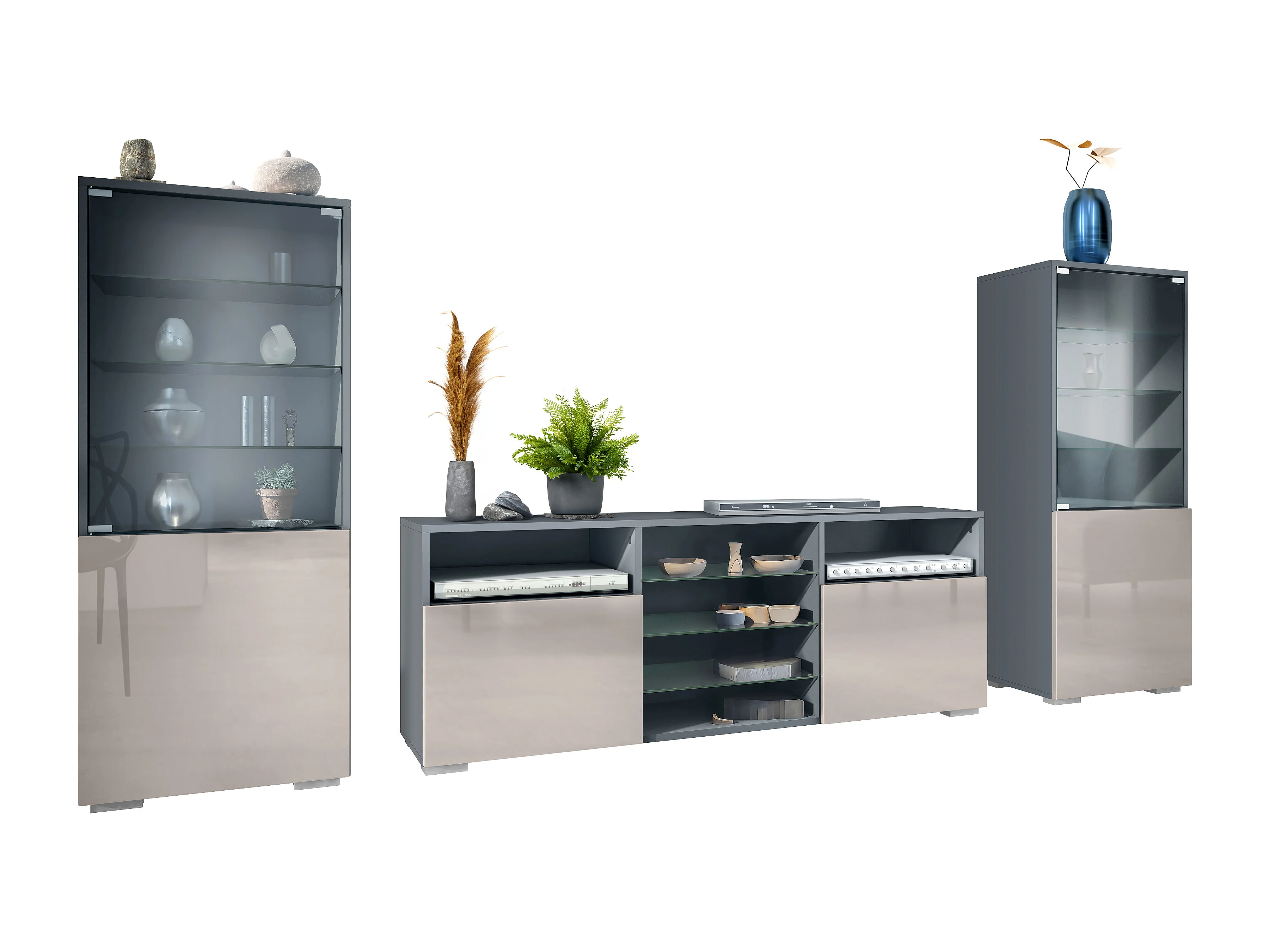 Ensemble mural Granada pour salon, comprenant 2 vitrines et 1 meuble TV, anthracite mat/gris sable haute brillance (286 x 122,5 x 35 cm)