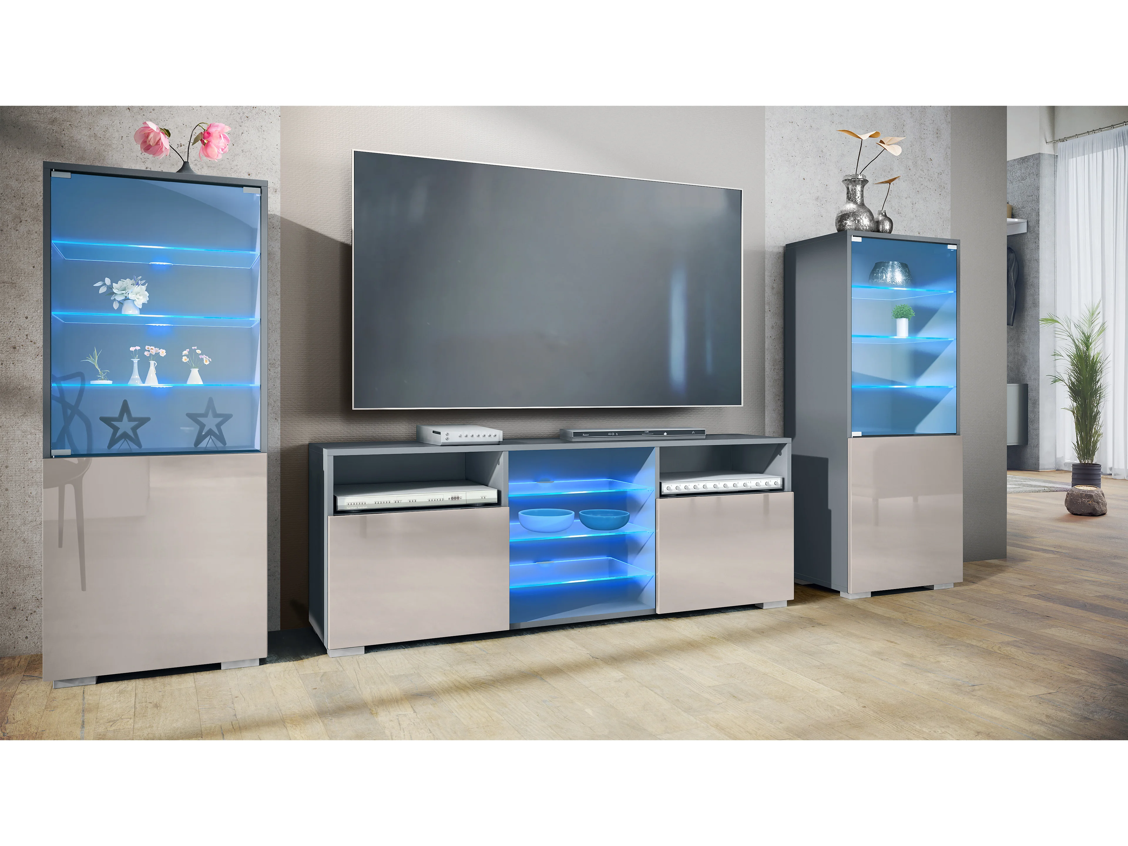 Ensemble mural Granada pour salon, comprenant 2 vitrines et 1 meuble TV, anthracite mat/gris sable haute brillance éclairage LED inclus (286 x 122,5 x 35 cm)