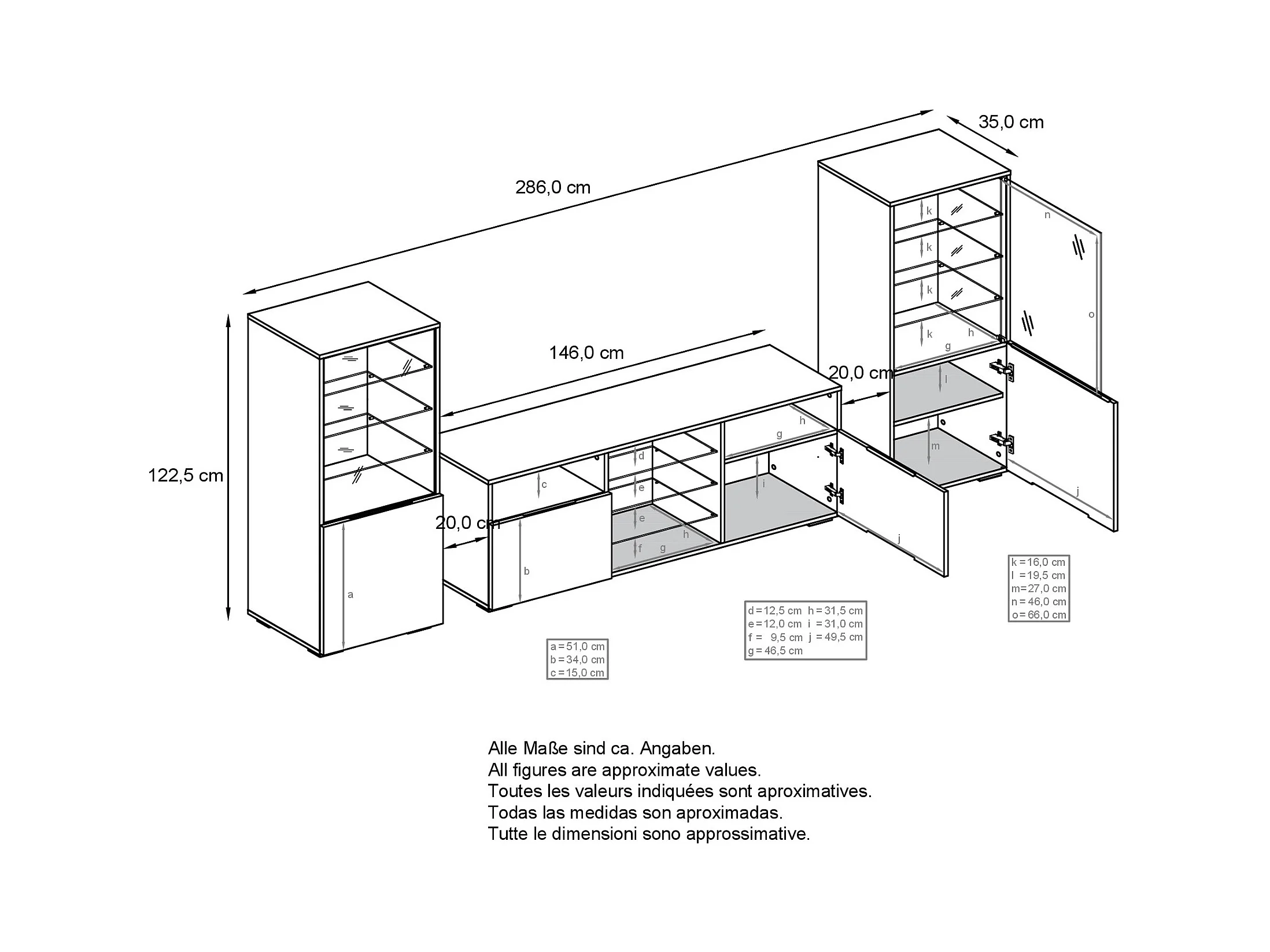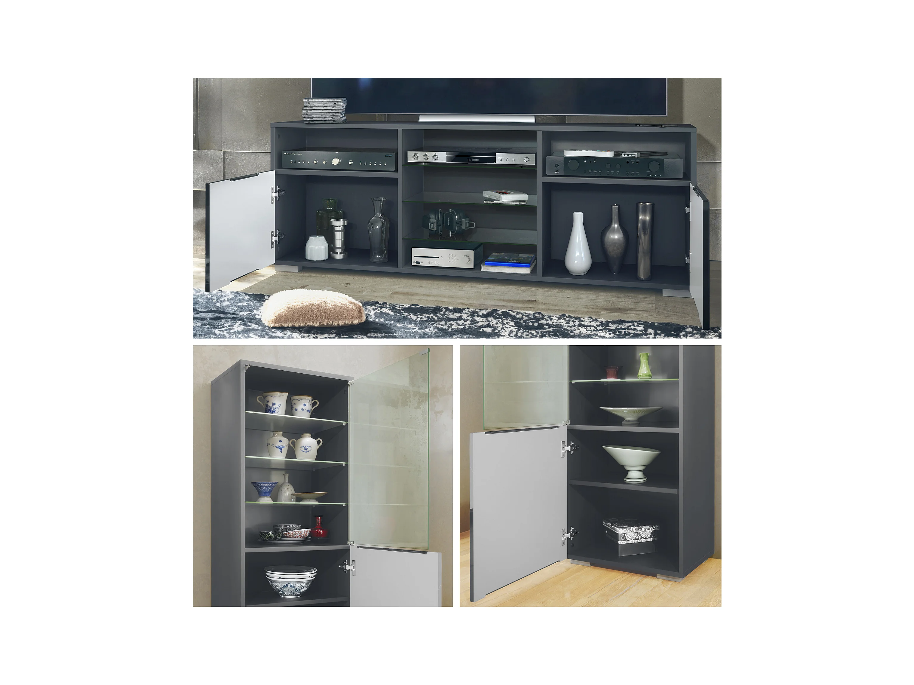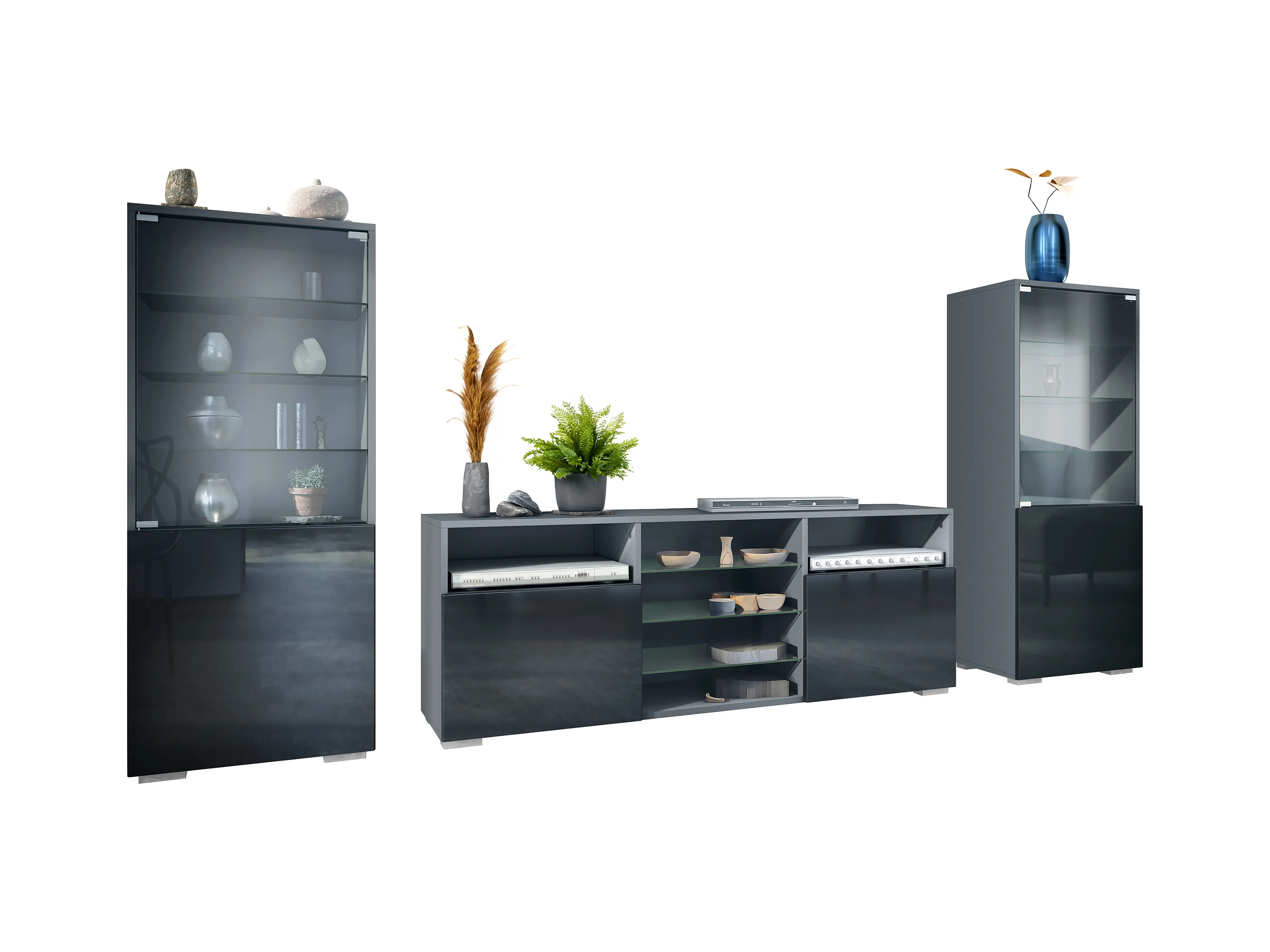 Ensemble mural Granada pour salon, comprenant 2 vitrines et 1 meuble TV, anthracite mat/noir haute brillance (286 x 122,5 x 35 cm)