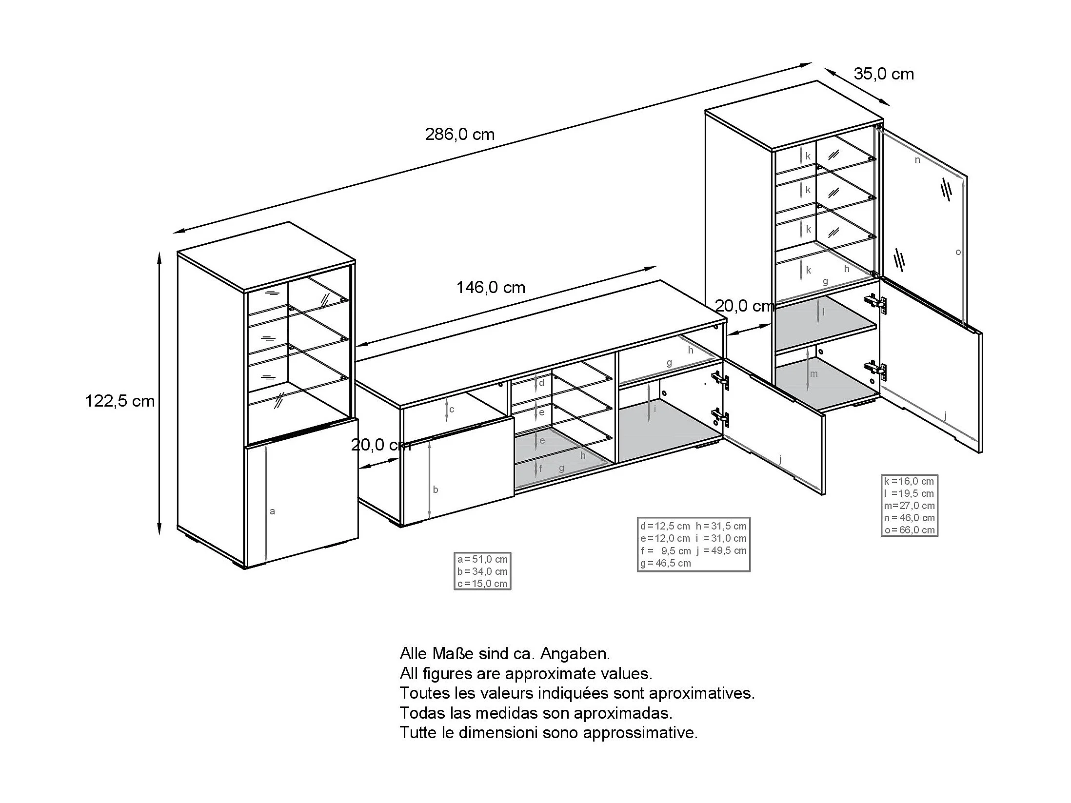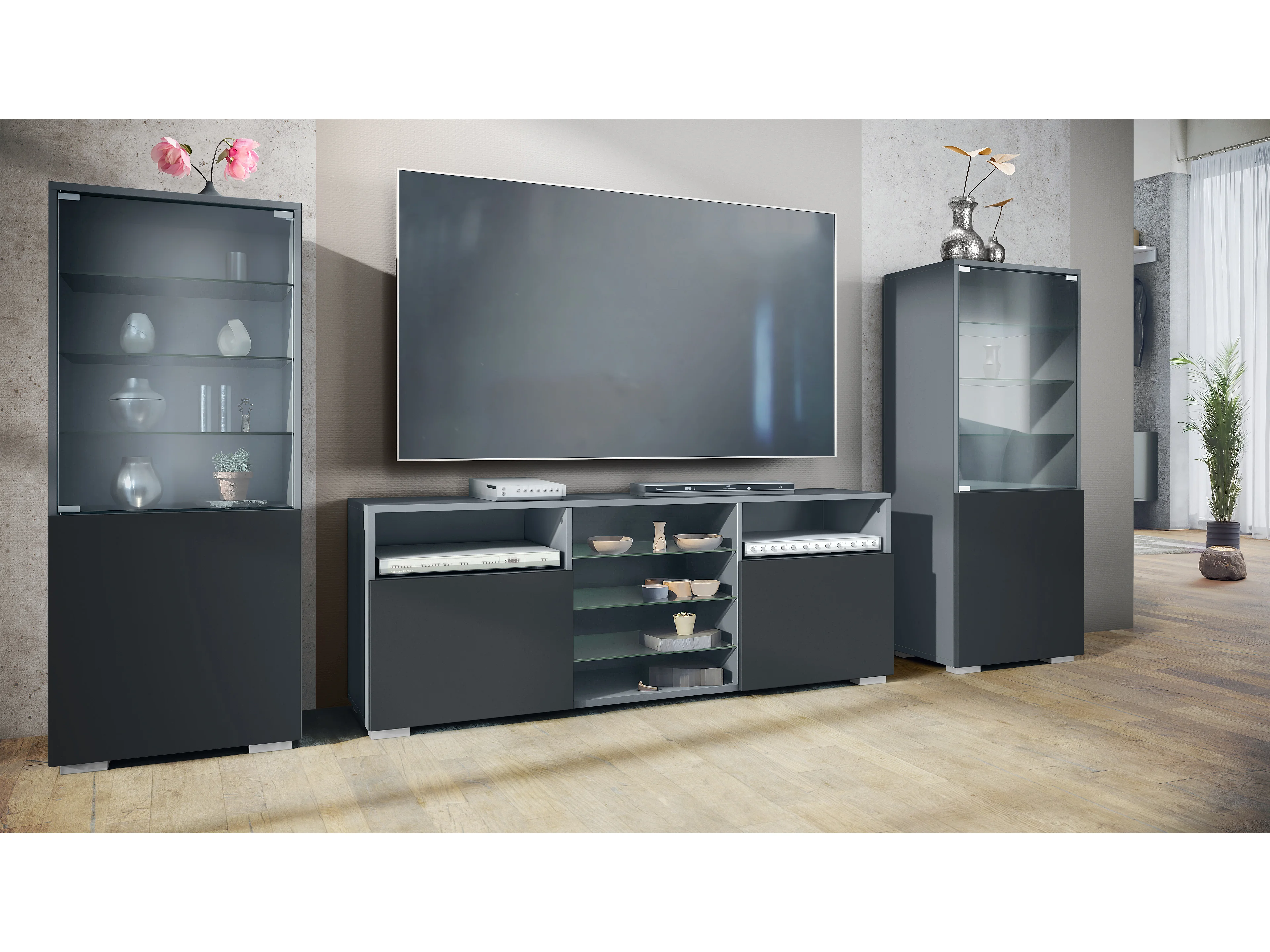 Ensemble mural Granada pour salon, comprenant 2 vitrines et 1 meuble TV, anthracite mat/noir mat (286 x 122,5 x 35 cm)