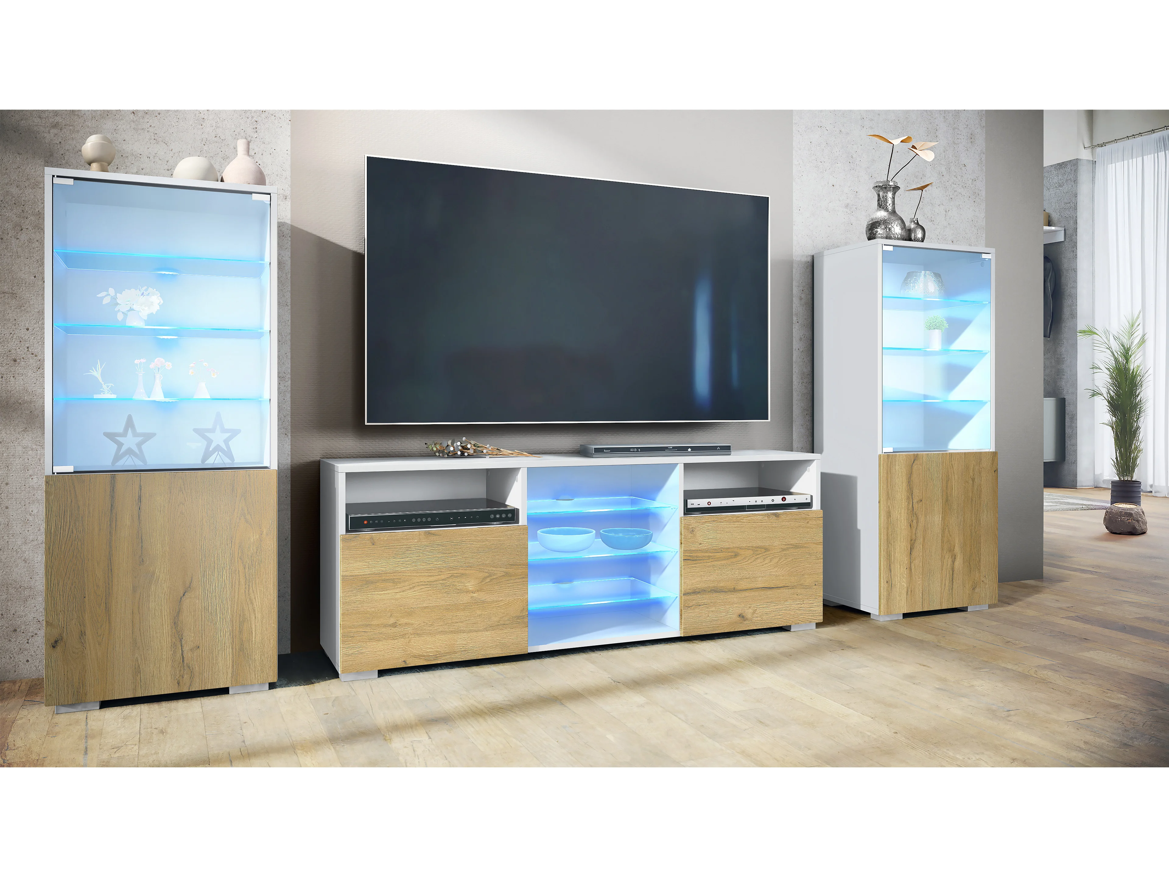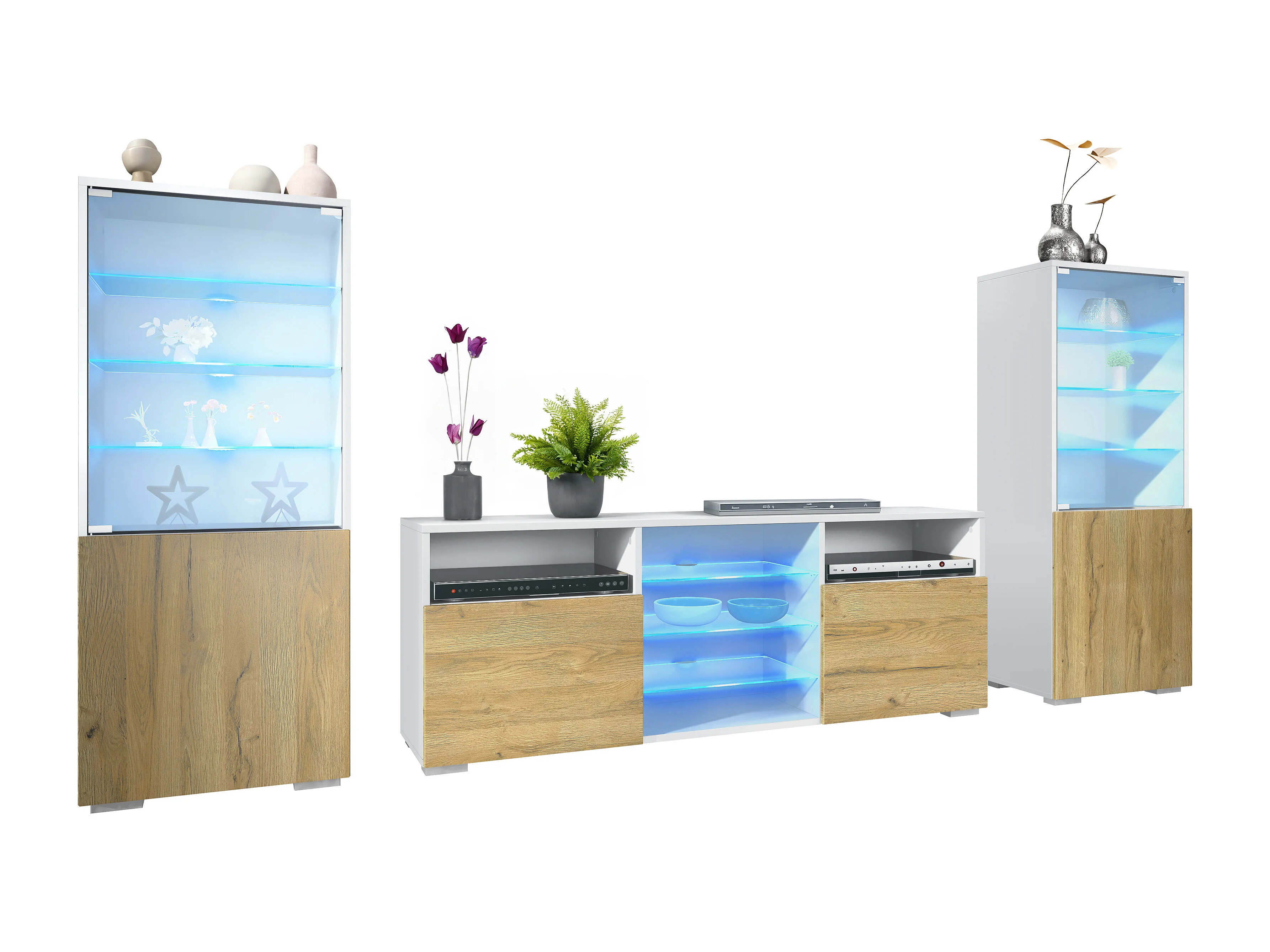 Ensemble mural Granada pour salon, comprenant 2 vitrines et 1 meuble TV, blanc mat/chêne nature éclairage LED inclus (286 x 122,5 x 35 cm)