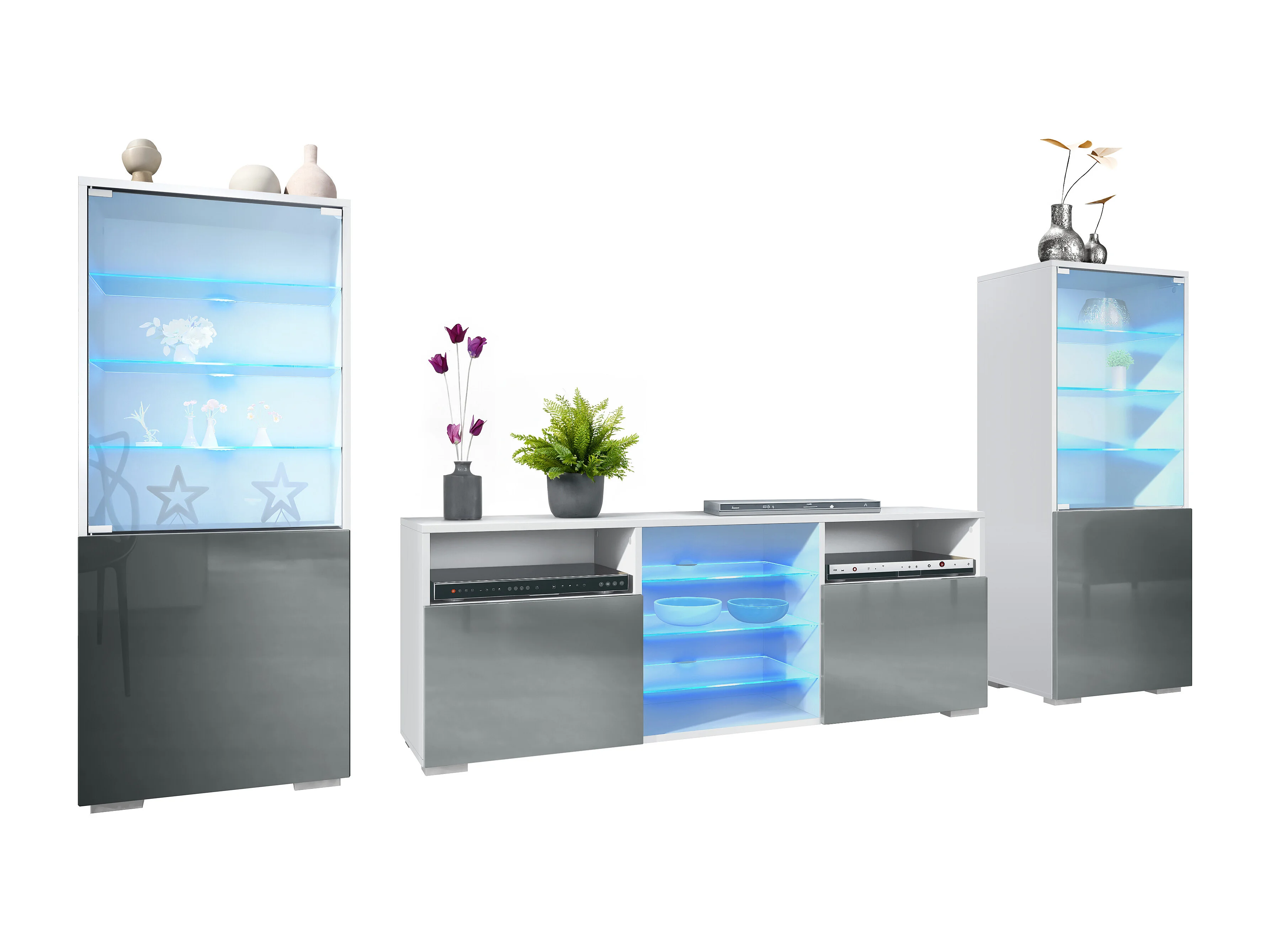 Ensemble mural Granada pour salon, comprenant 2 vitrines et 1 meuble TV, blanc mat/gris haute brillance éclairage LED inclus (286 x 122,5 x 35 cm)