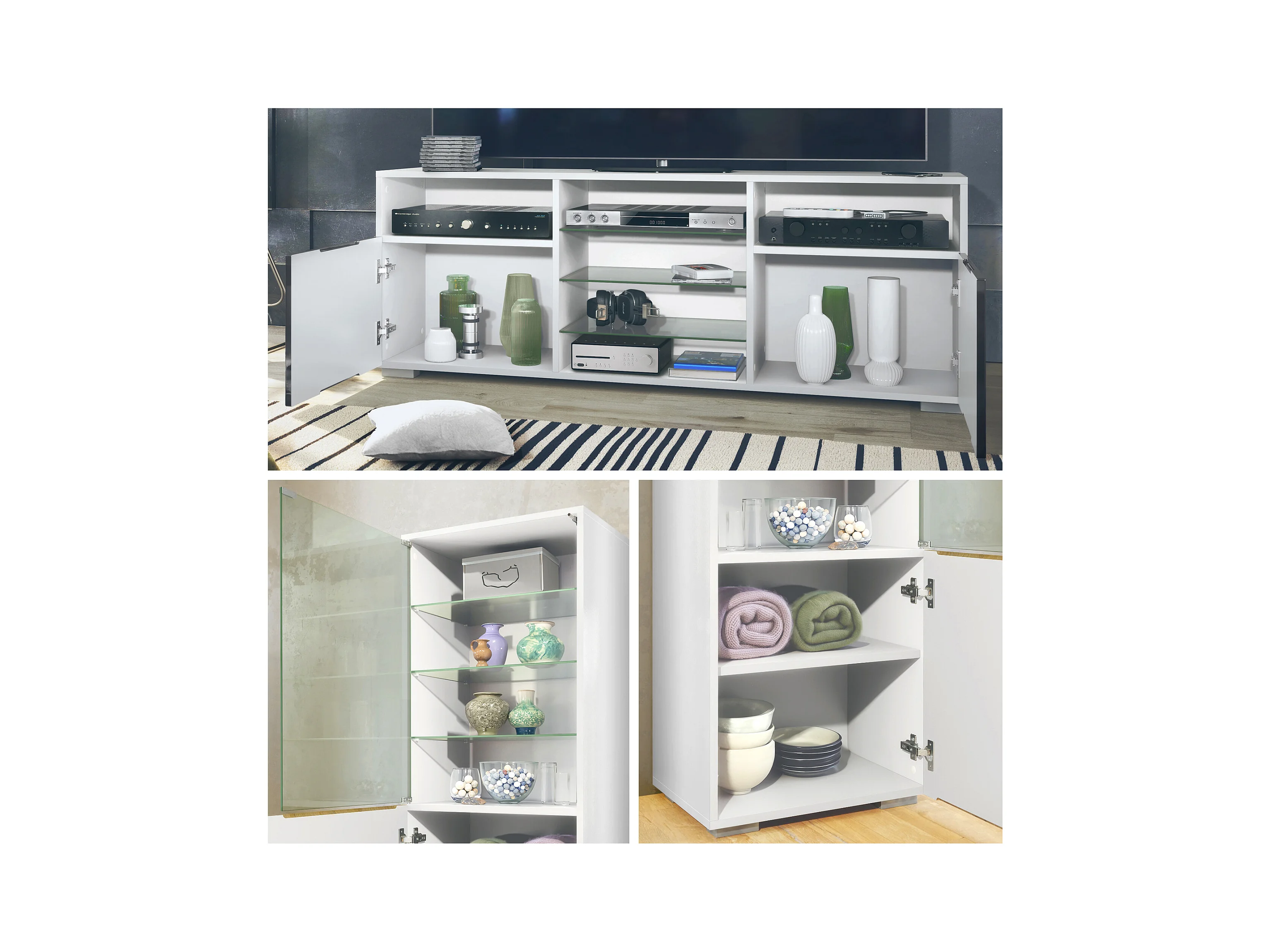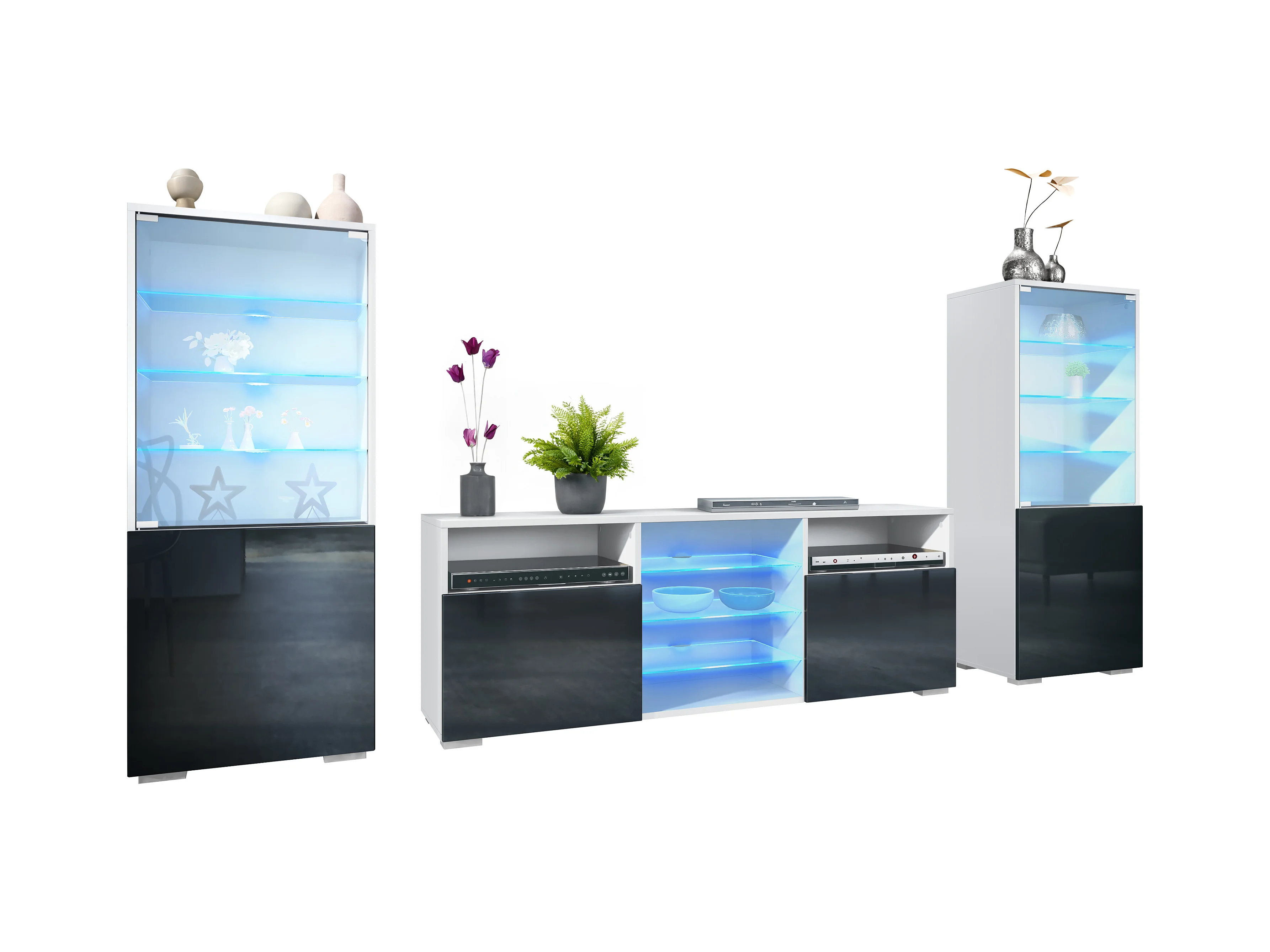 Ensemble mural Granada pour salon, comprenant 2 vitrines et 1 meuble TV, blanc mat/noir haute brillance éclairage LED inclus (286 x 122,5 x 35 cm)