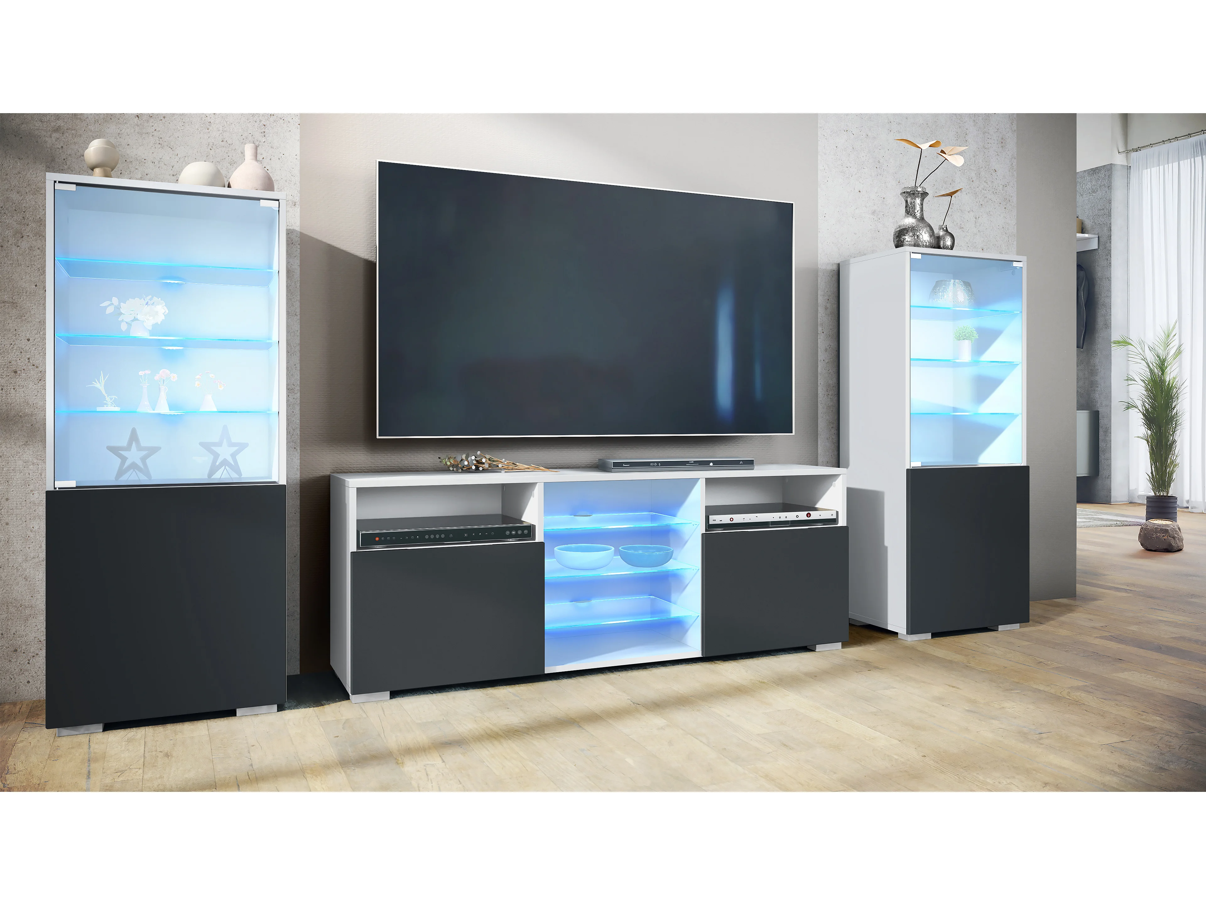 Ensemble mural Granada pour salon, comprenant 2 vitrines et 1 meuble TV, blanc mat/noir mat éclairage LED inclus (286 x 122,5 x 35 cm)