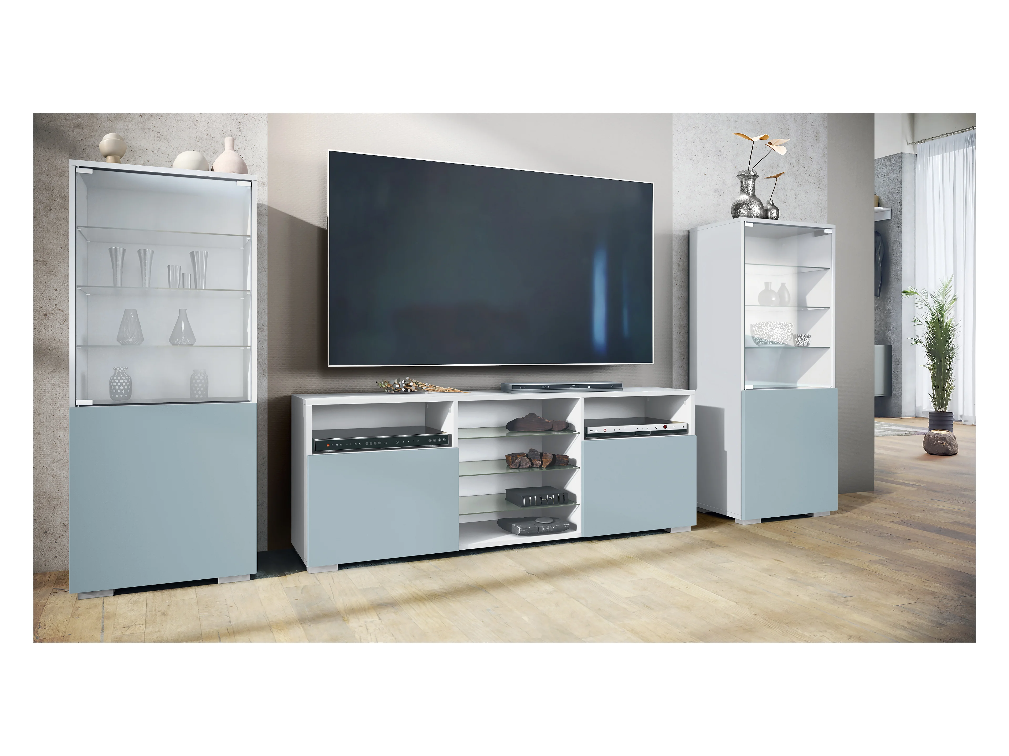 Ensemble mural Granada pour salon, comprenant 2 vitrines et 1 meuble TV, False/denim mat (286 x 122,5 x 35 cm)