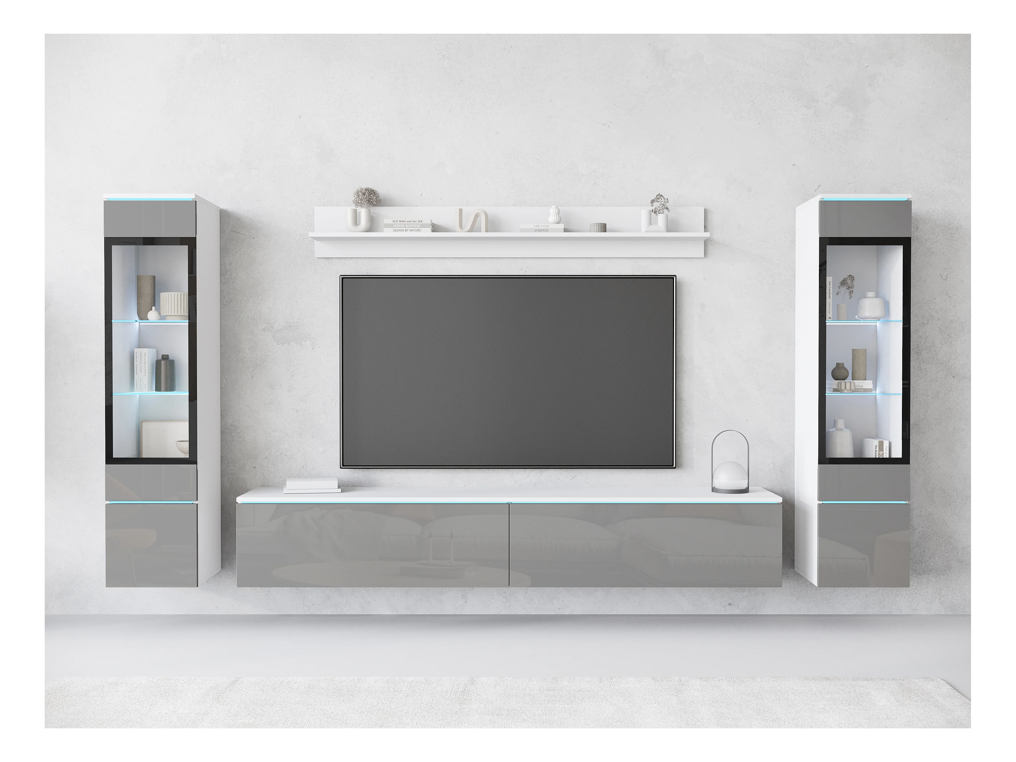 Ensemble moderne de meubles de salon 4 éléments, meuble TV 180 cm, 2 vitrines et étagère, corps blanc mat, façades gris brillant, autoportant ou suspendu