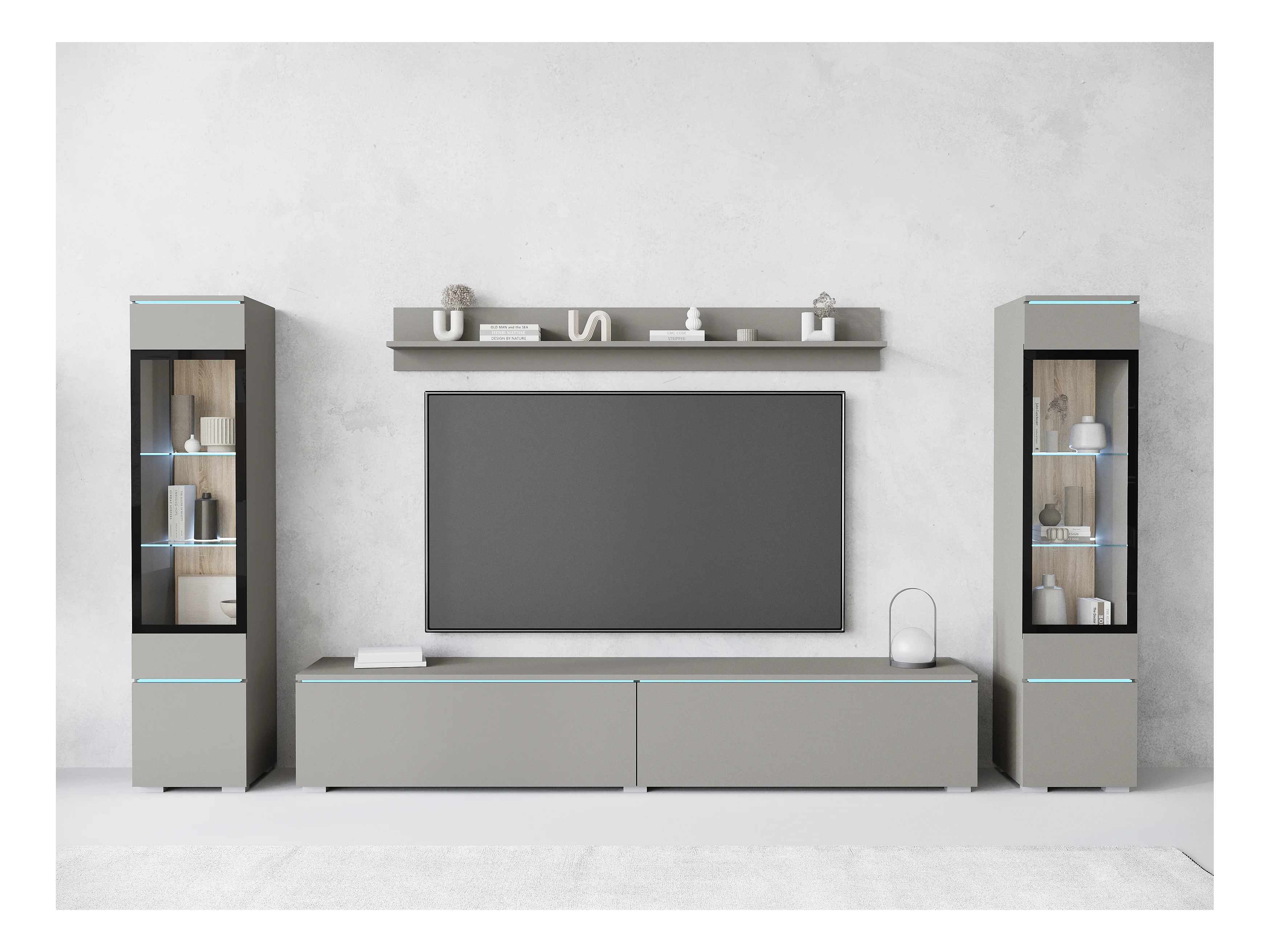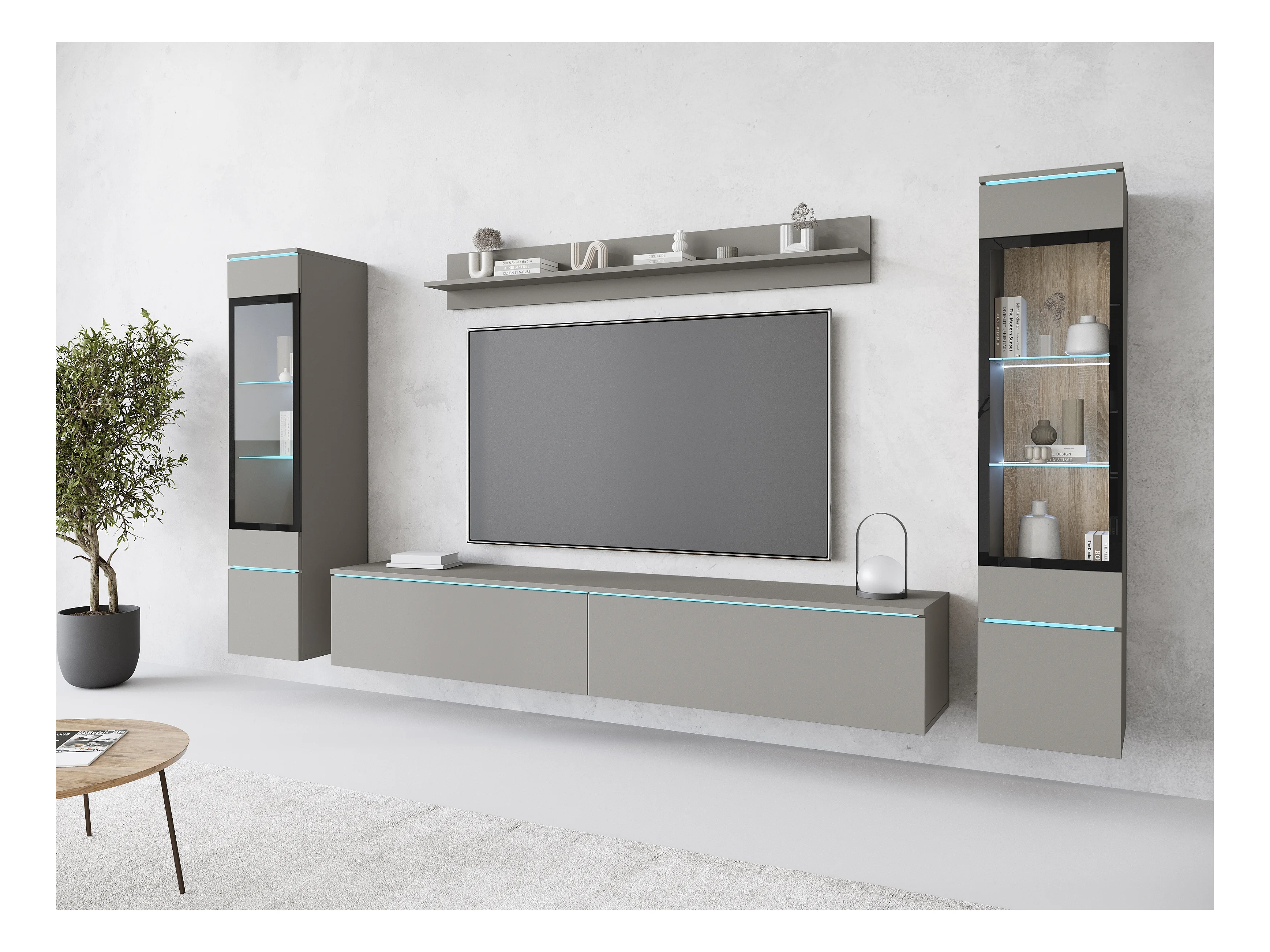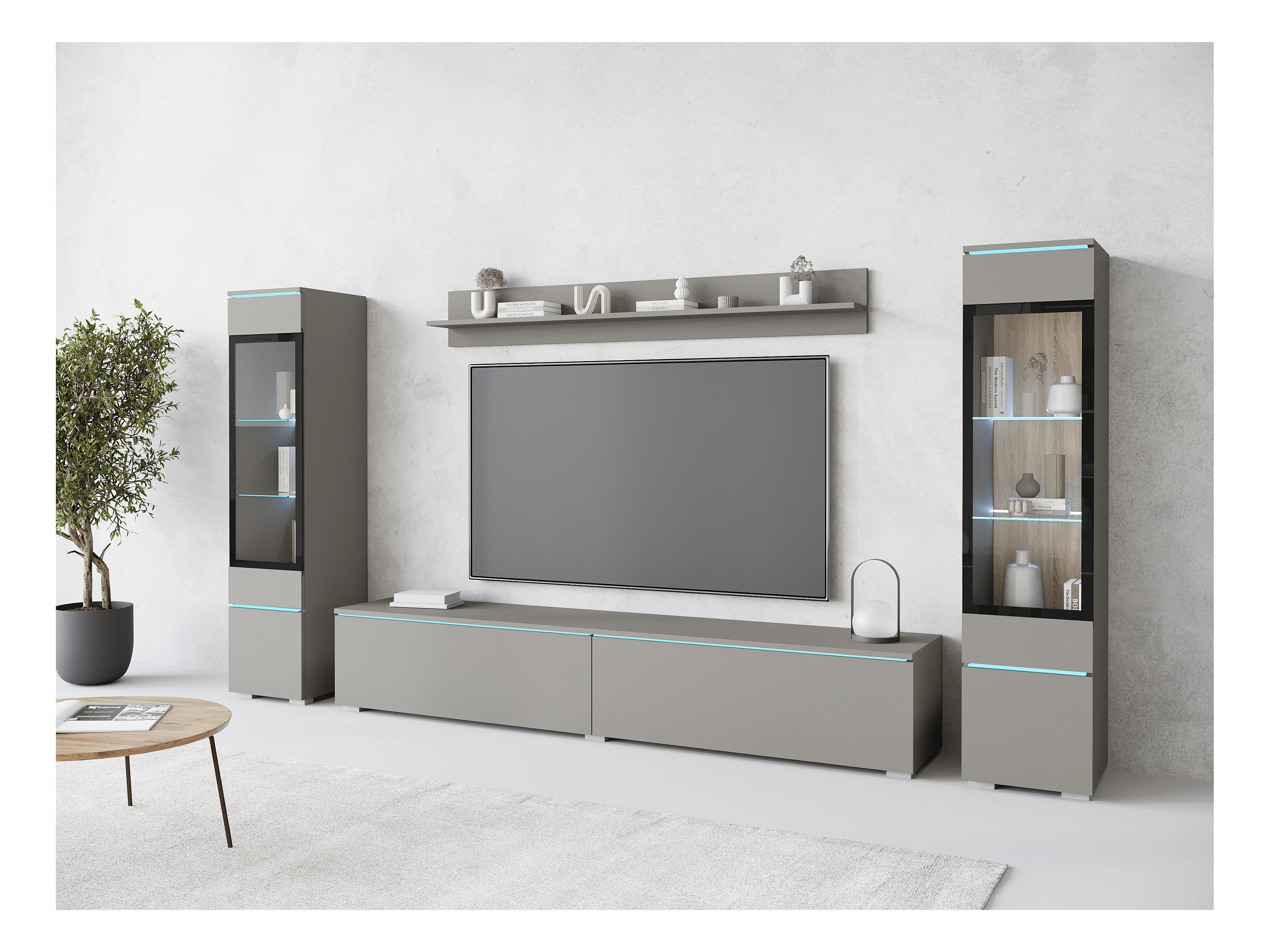 Ensemble moderne de meubles de salon 4 éléments – meuble TV 180 cm, 2 vitrines et étagère – mur TV gris palladium mat, autoportant ou suspendu