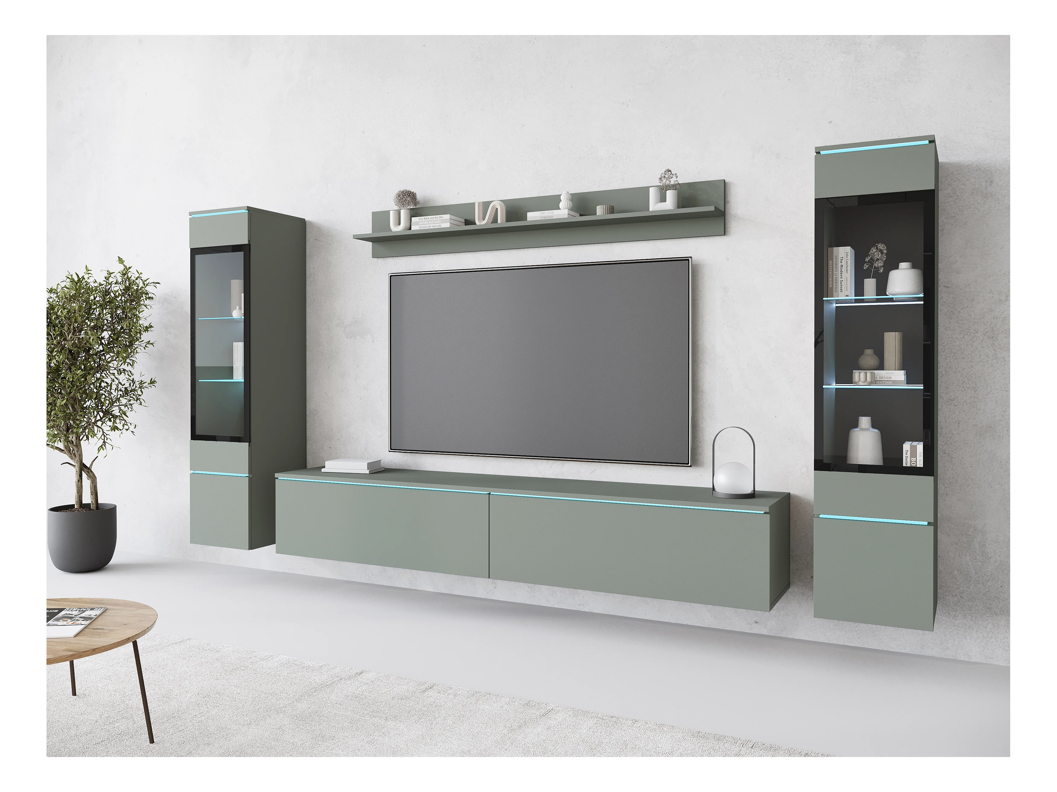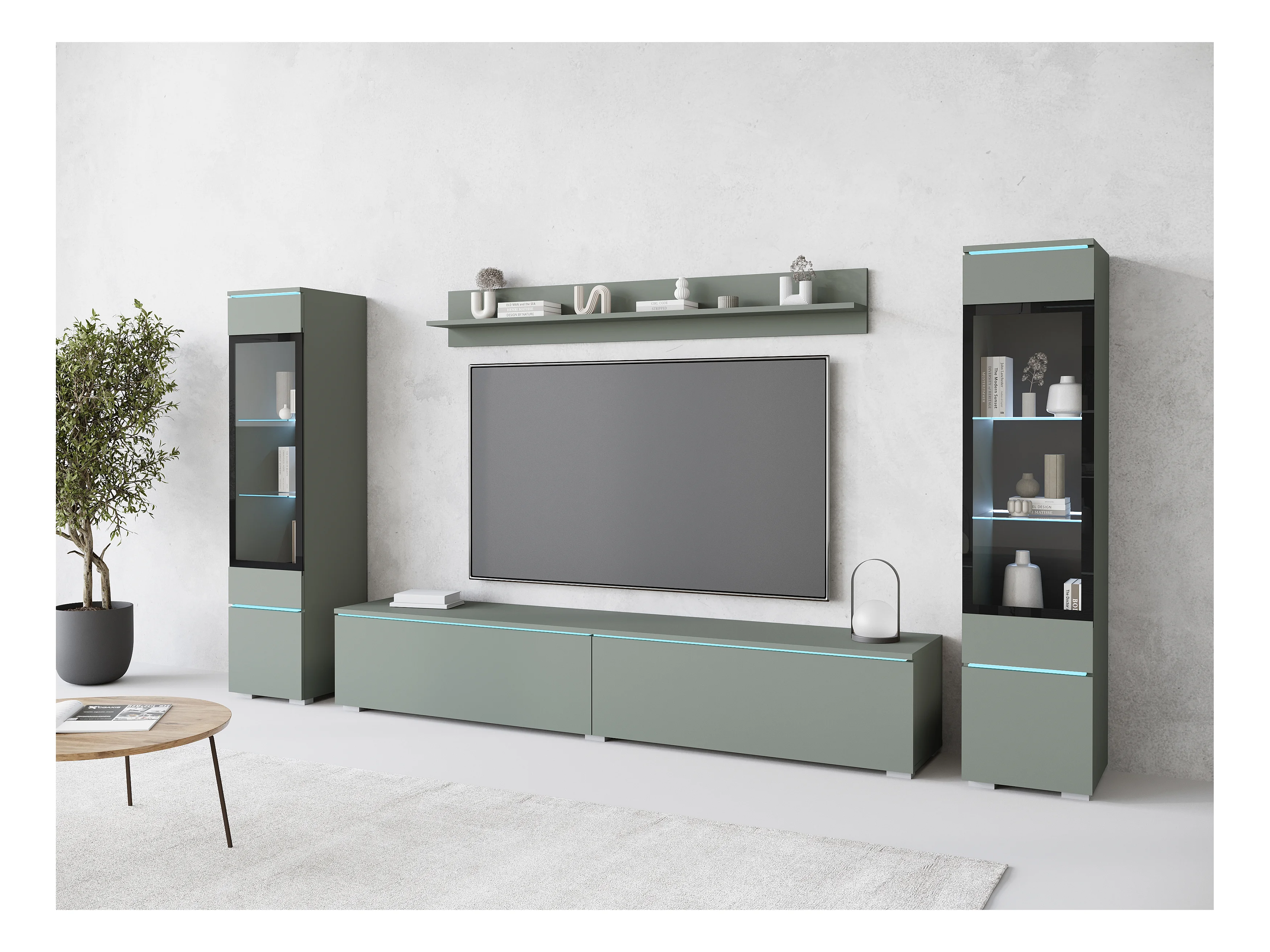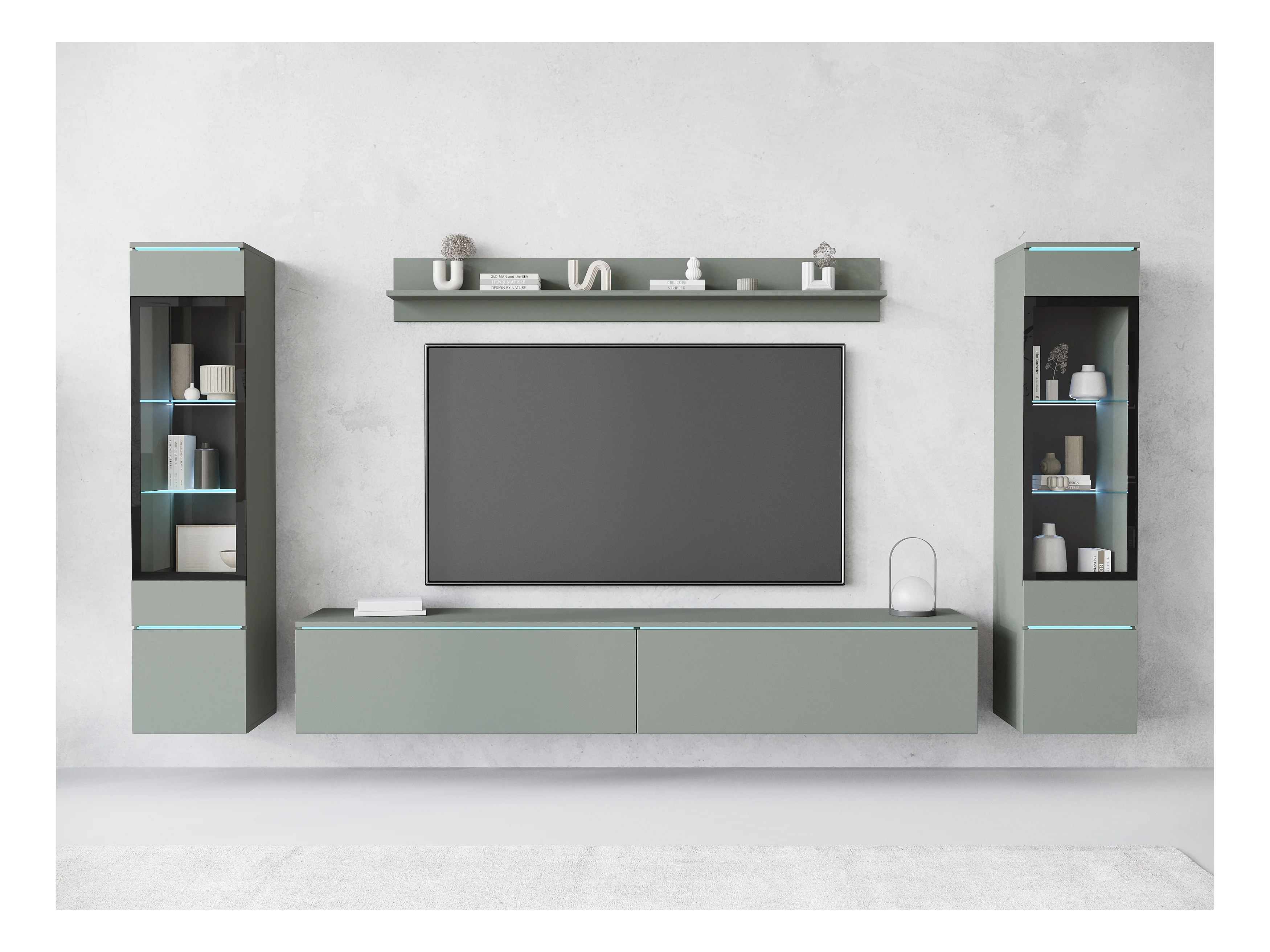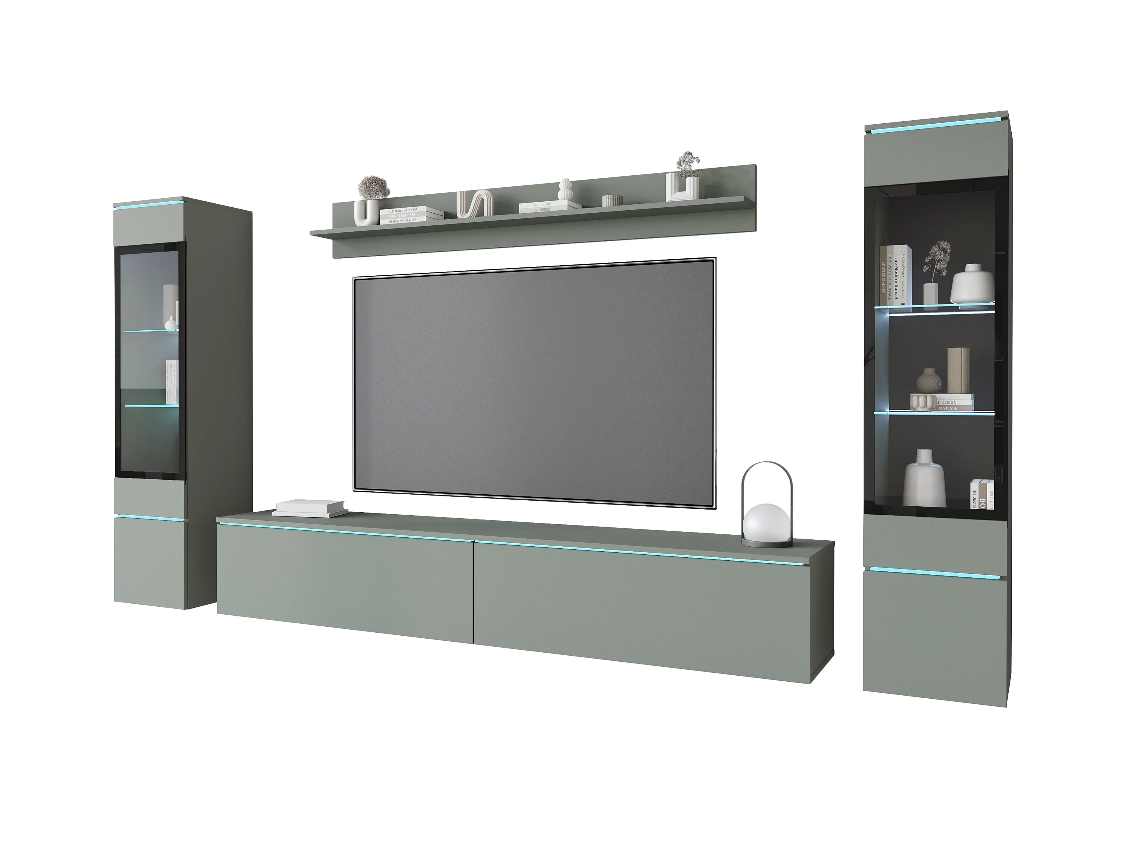 Ensemble moderne de meubles de salon 4 éléments – meuble TV 180 cm, 2 vitrines et étagère – mur TV vert brume mat, autoportant ou suspendu