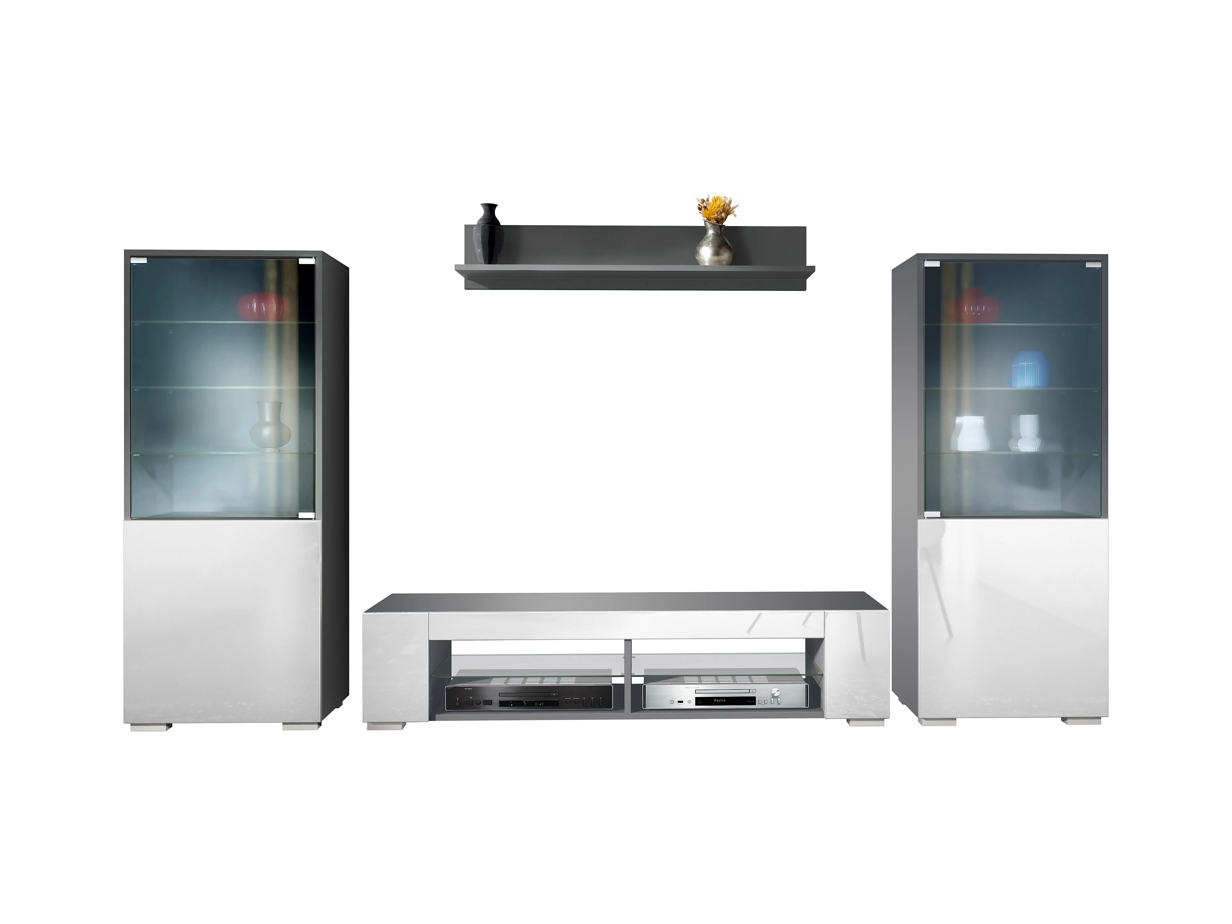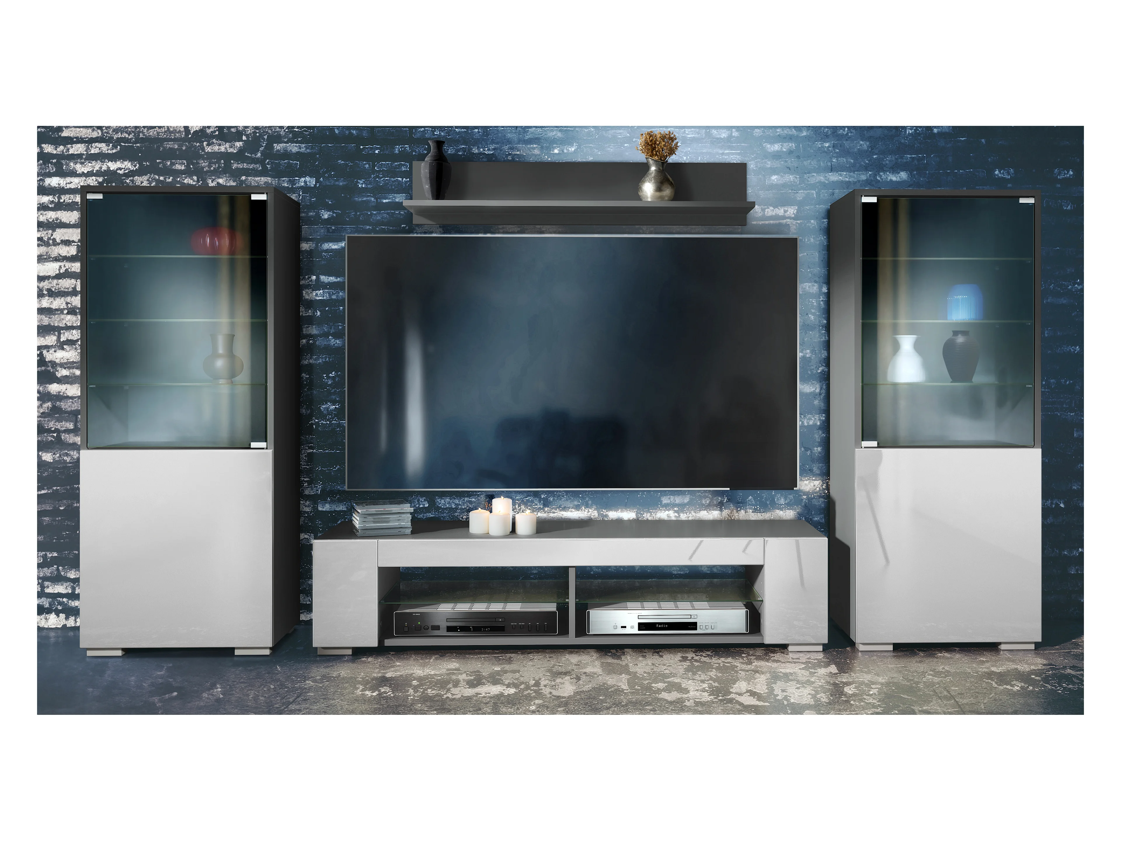 Ensemble mural Nevada V2, meuble de salon composé de 2 vitrines, 1 meuble TV et 1 étagère murale, Anthracite mat/blanc haute brillance (304,5 x 141 x 39 cm)