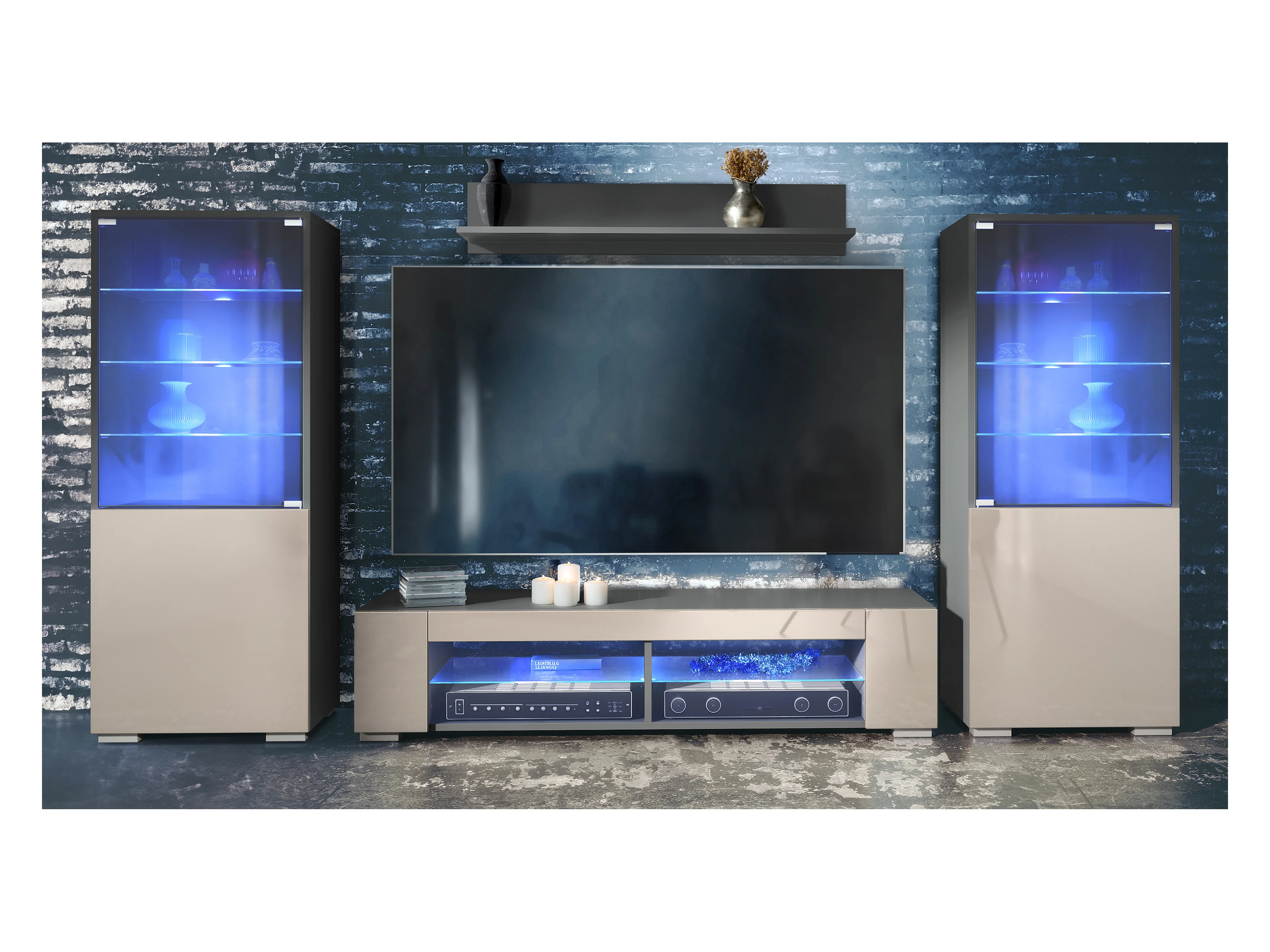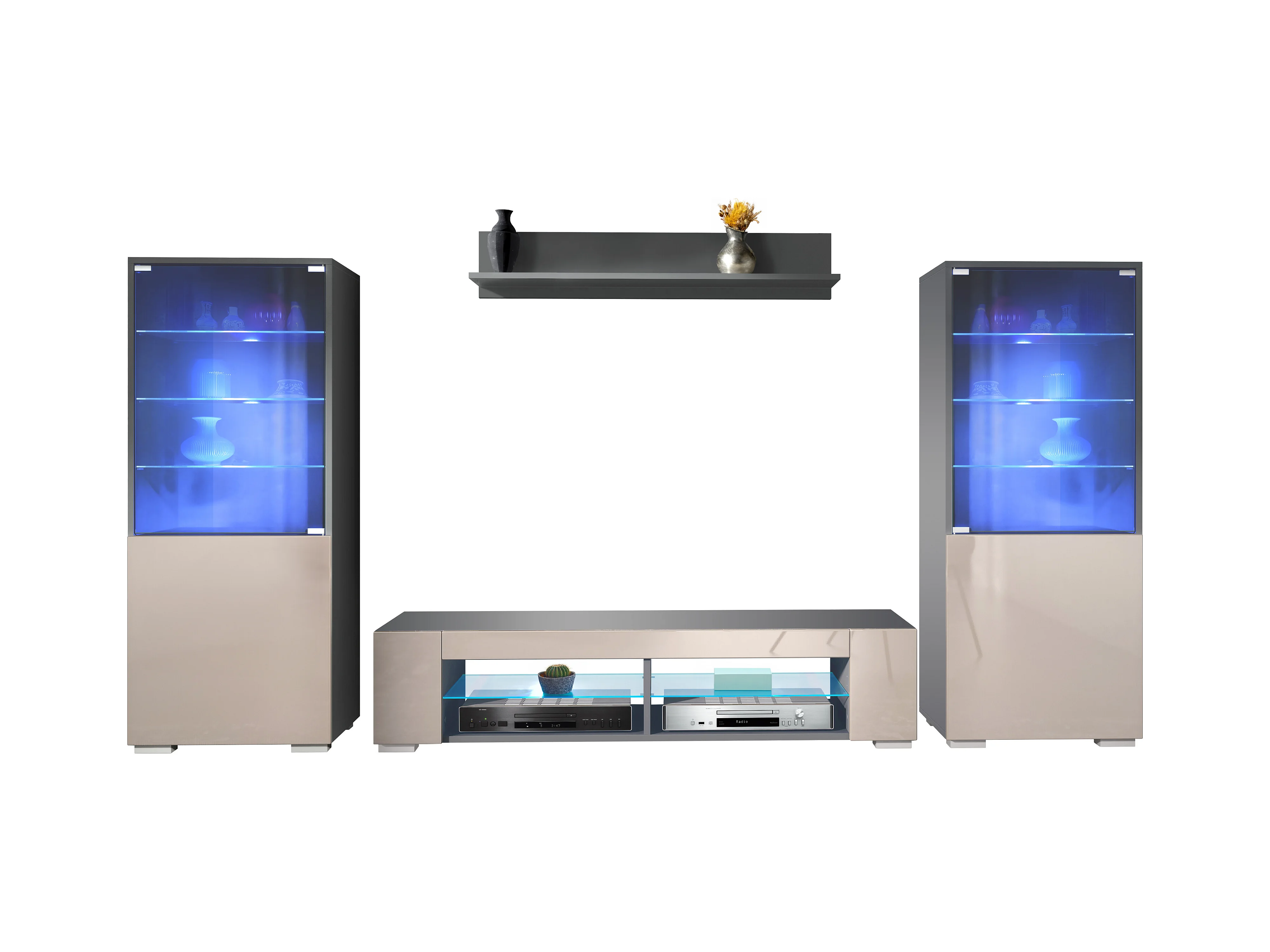 Ensemble mural Nevada V2, meuble de salon composé de 2 vitrines, 1 meuble TV et 1 étagère murale, Anthracite mat/gris sable brillant LED incluse (304,5x141x39 cm)