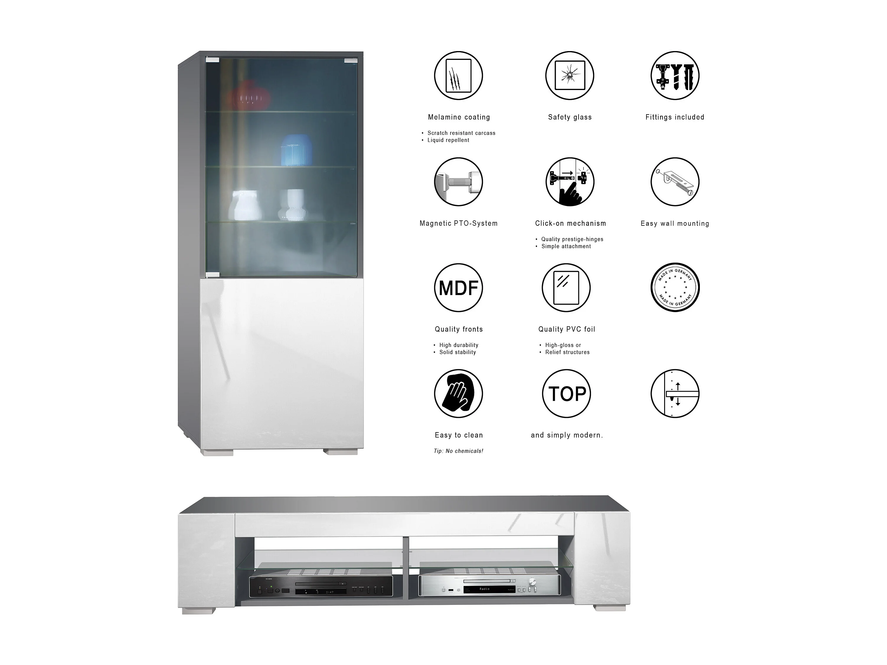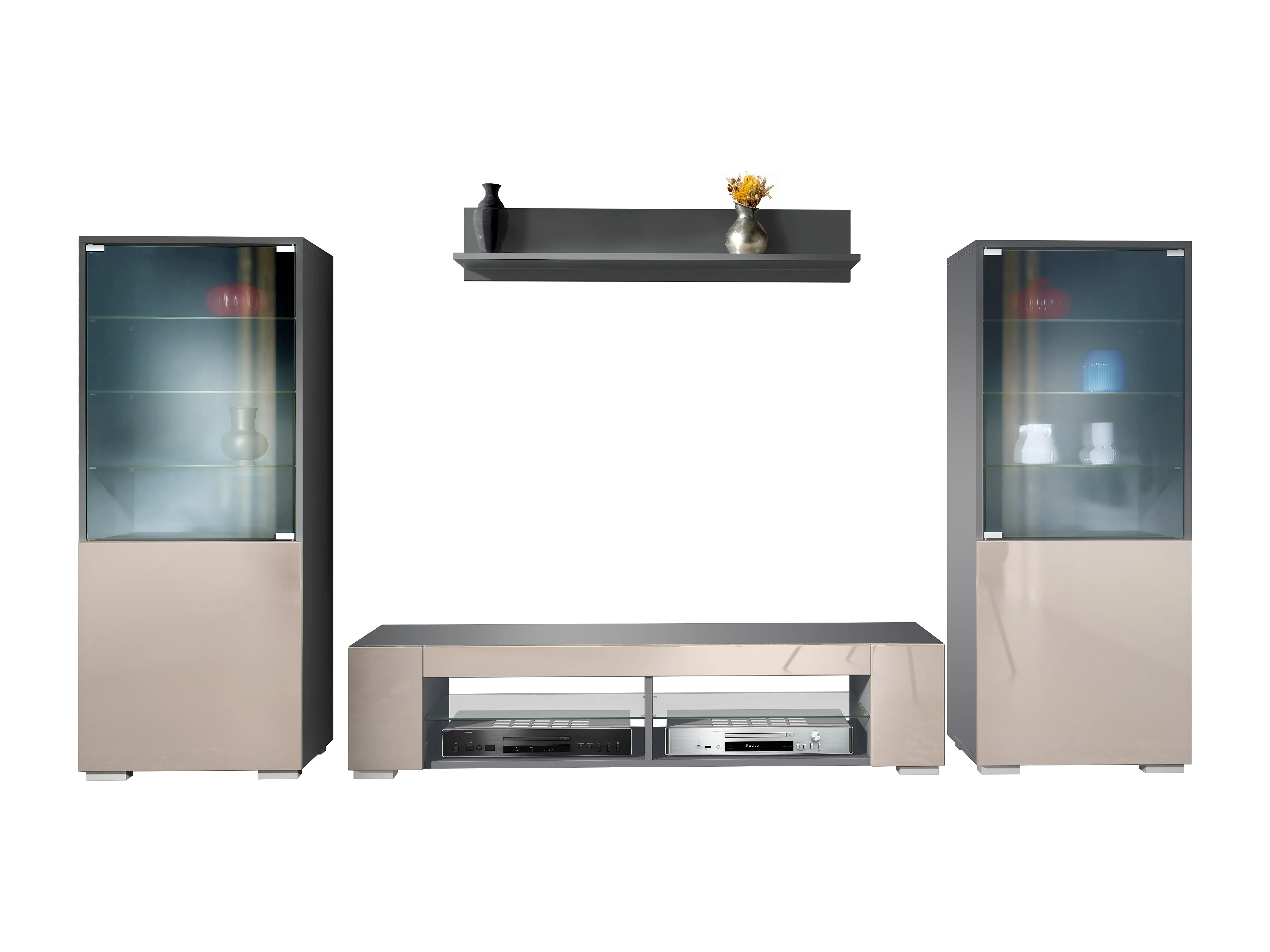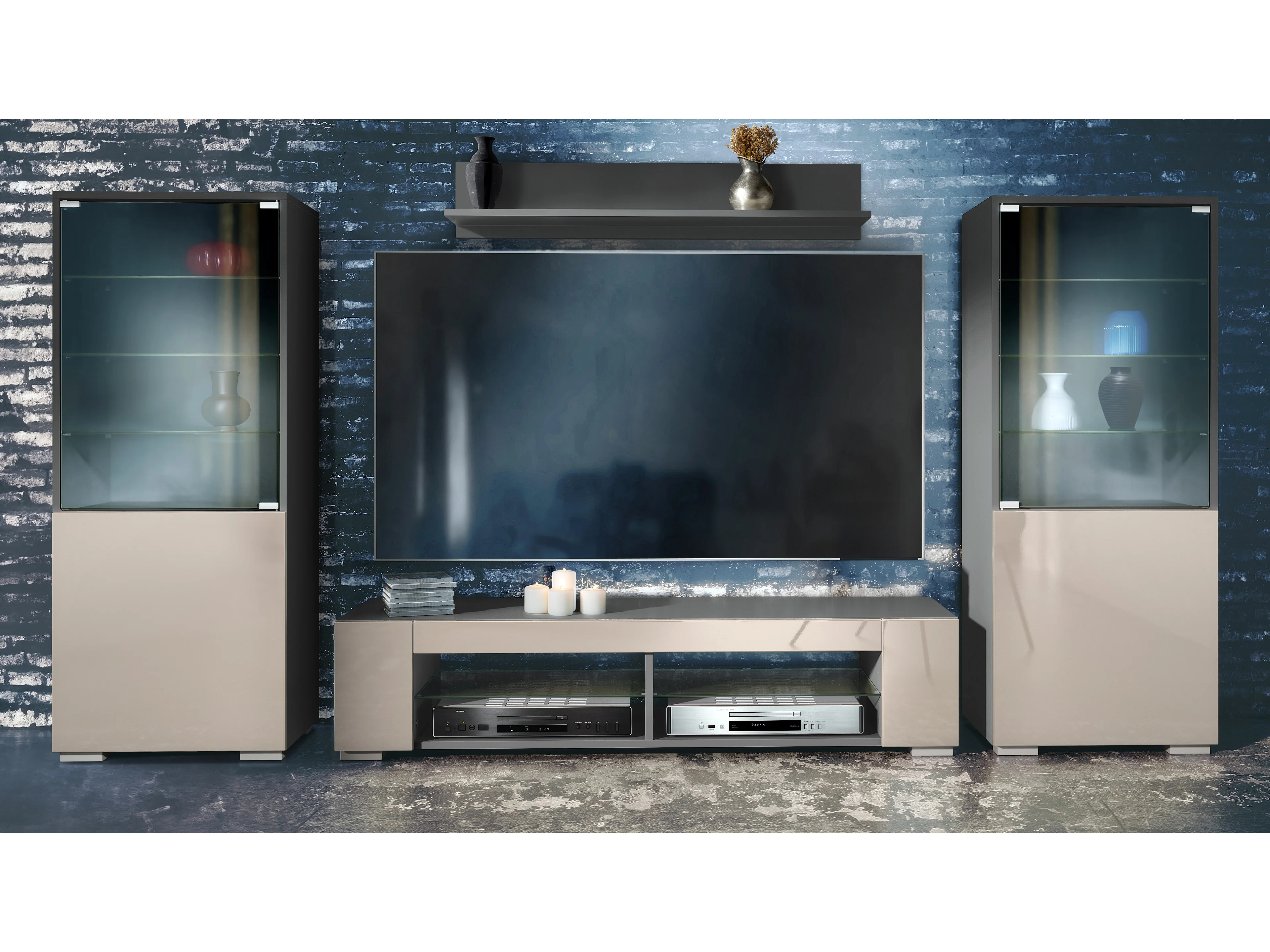 Ensemble mural Nevada V2, meuble de salon composé de 2 vitrines, 1 meuble TV et 1 étagère murale, Anthracite mat/gris sable haute brillance (304,5 x 141 x 39 cm)