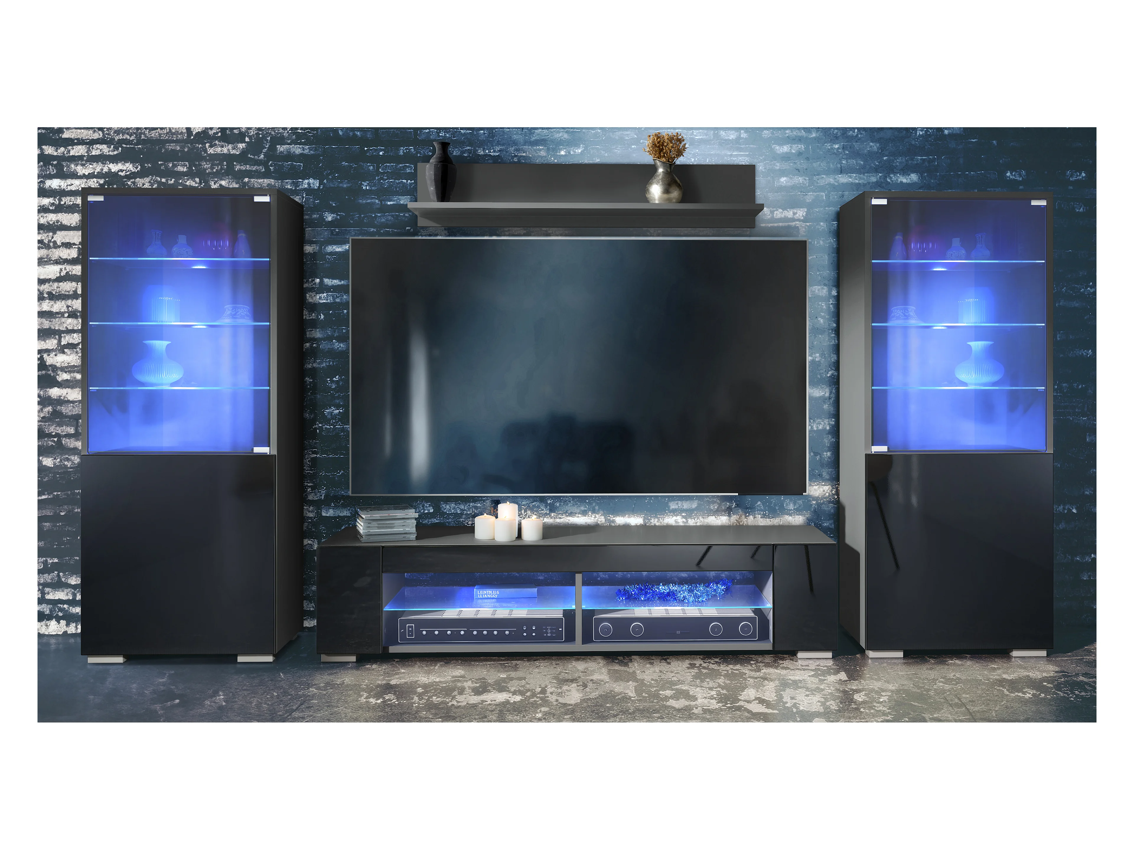Ensemble mural Nevada V2, meuble de salon composé de 2 vitrines, 1 meuble TV et 1 étagère murale, Anthracite mat/noir brillant LED incluse (304,5 x 141 x 39 cm)