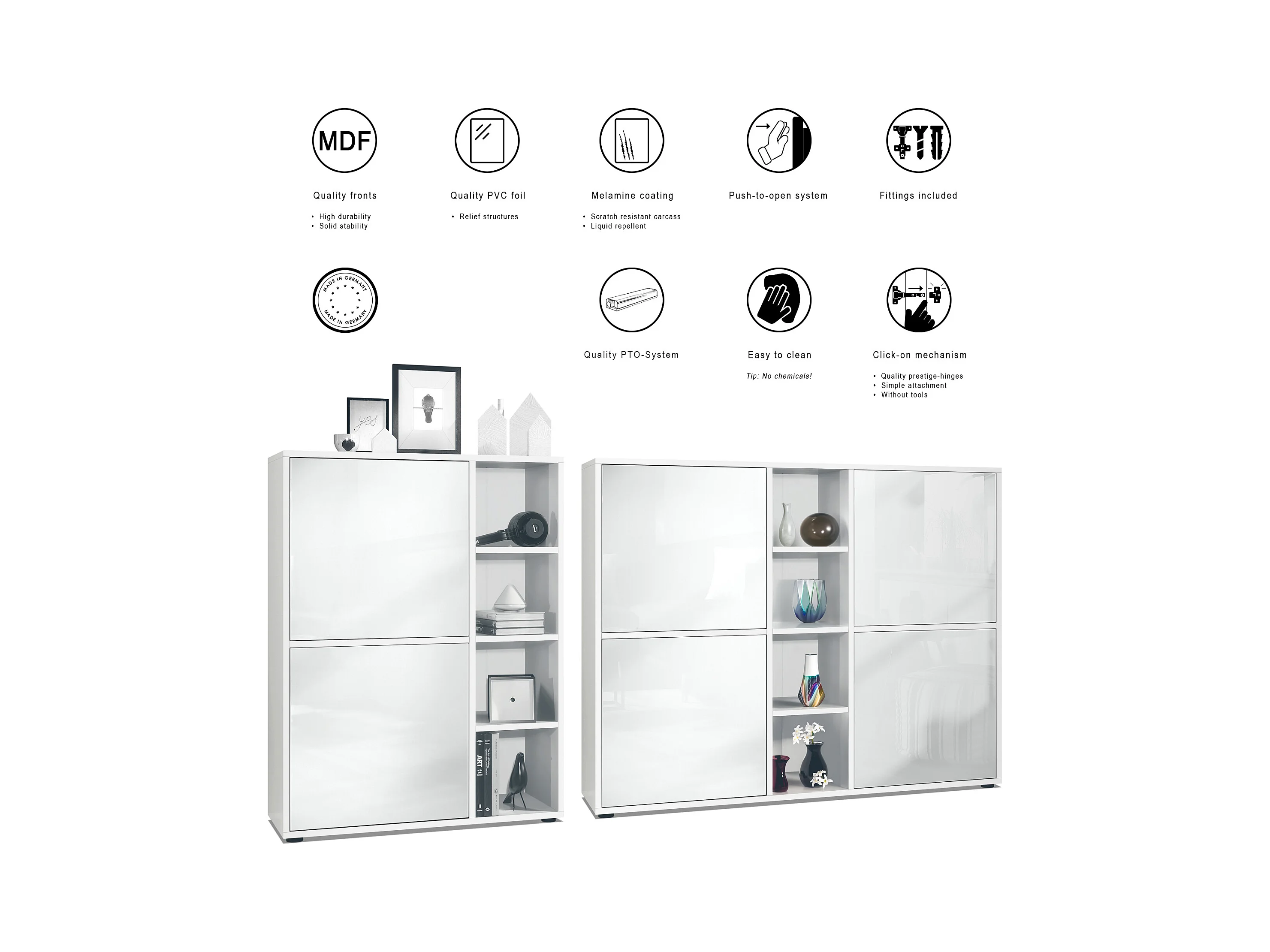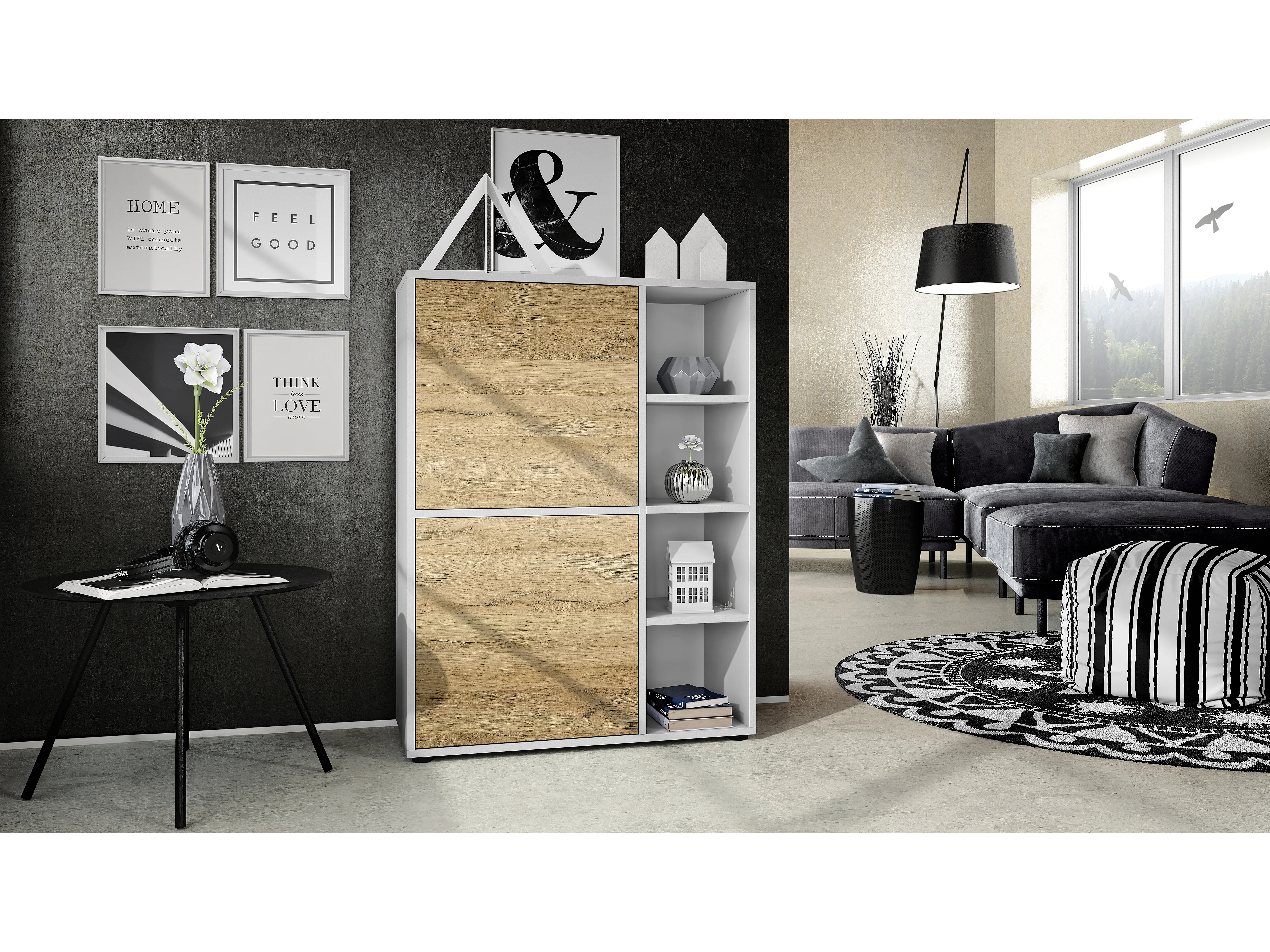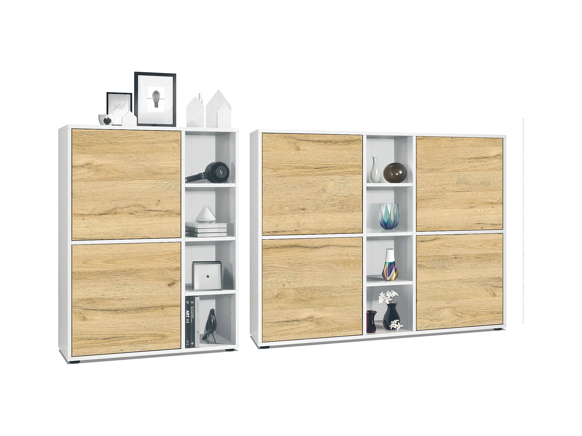 Ensemble pour salon Miami, composé de deux buffets hauts avec un total de 6 portes et 8 compartiments, corps en blanc mat, façades en chêne nature.