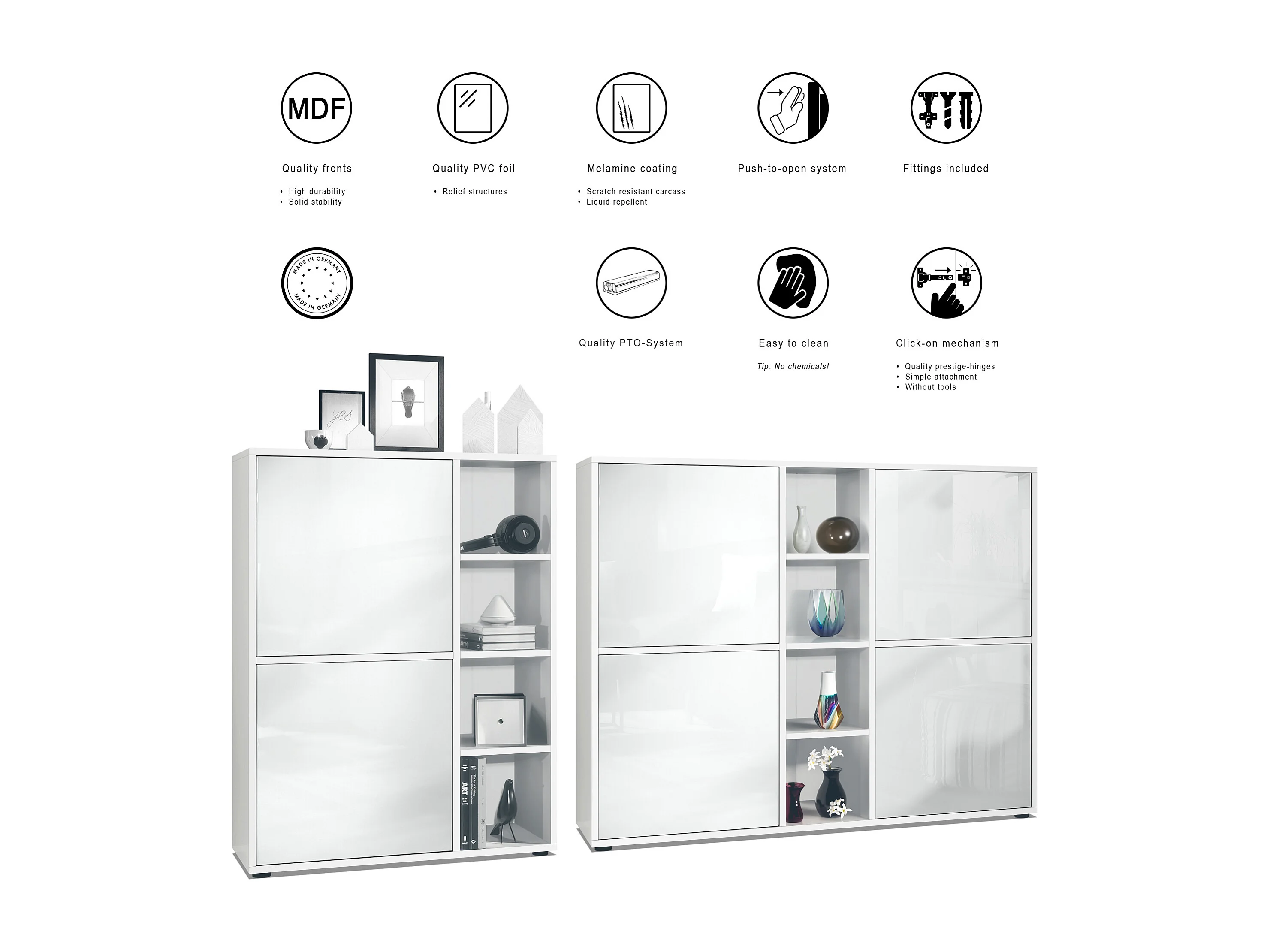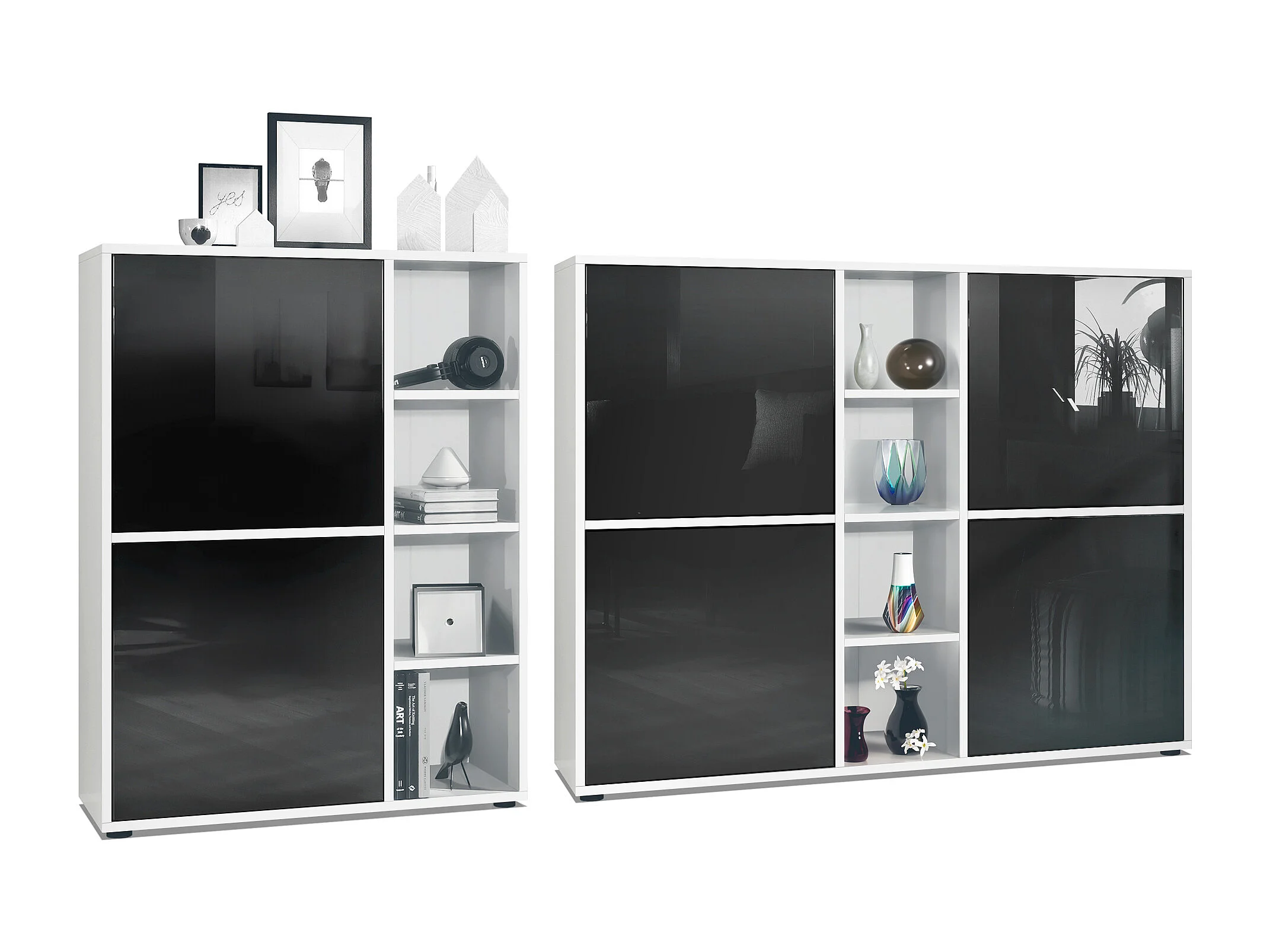 Ensemble pour salon Miami, composé de deux buffets hauts avec un total de 6 portes et 8 compartiments, corps en blanc mat, façades en noir haute brillance.
