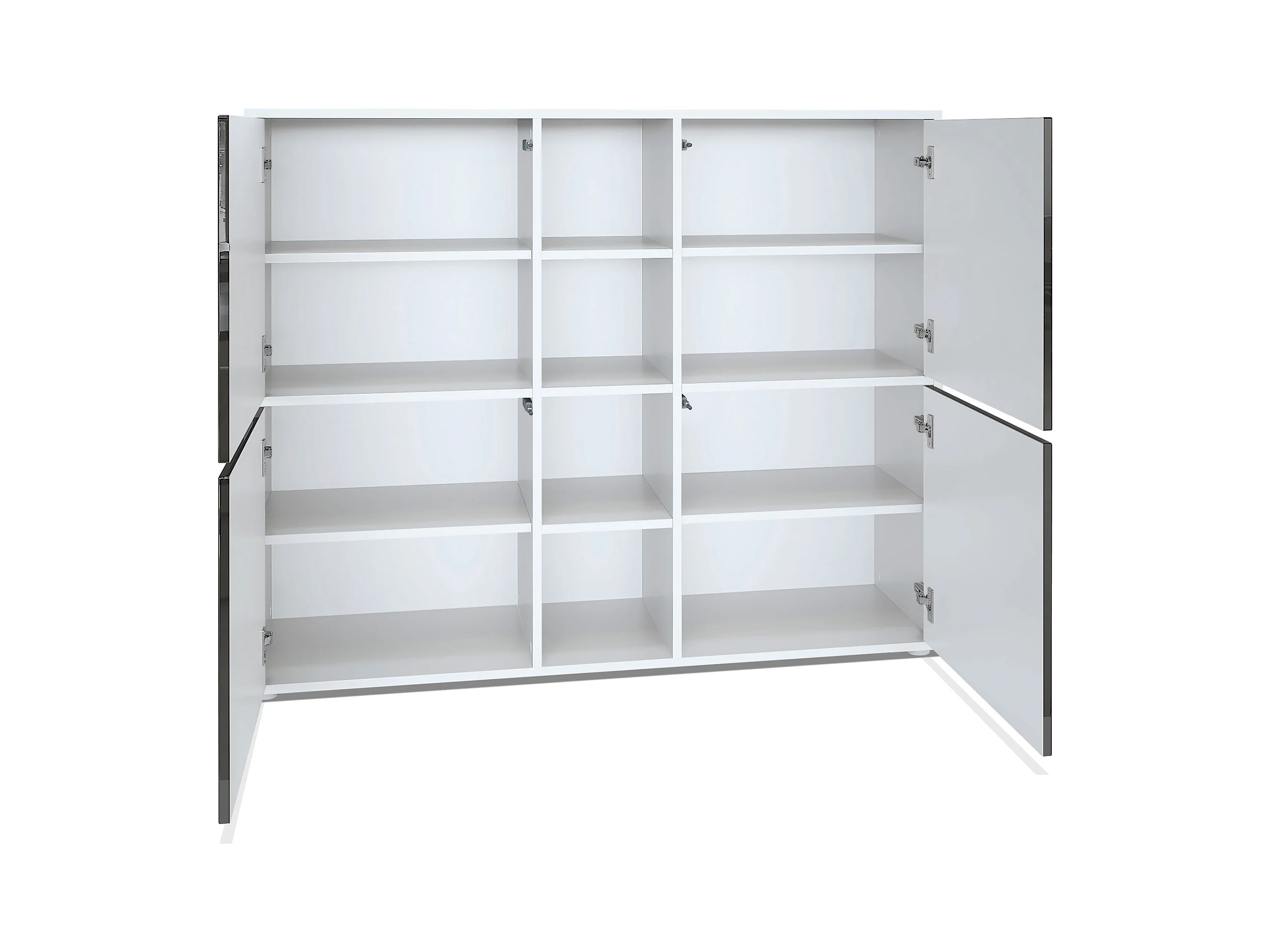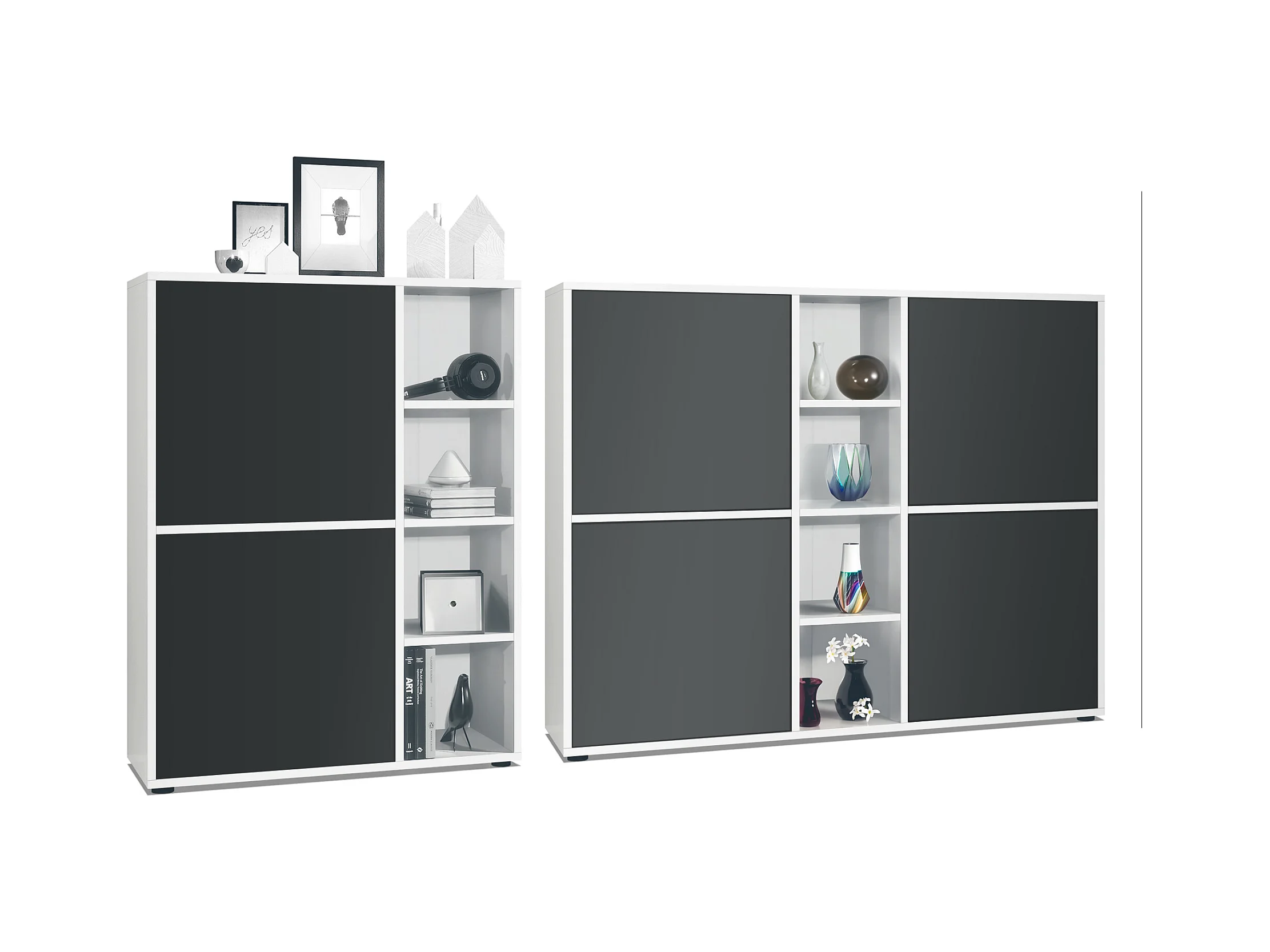 Ensemble pour salon Miami, composé de deux buffets hauts avec un total de 6 portes et 8 compartiments, corps en blanc mat, façades en noir mat.