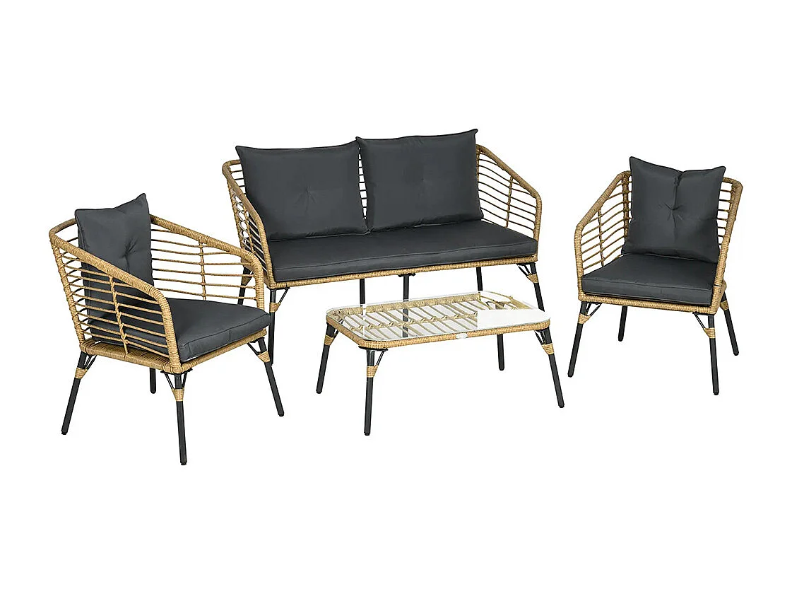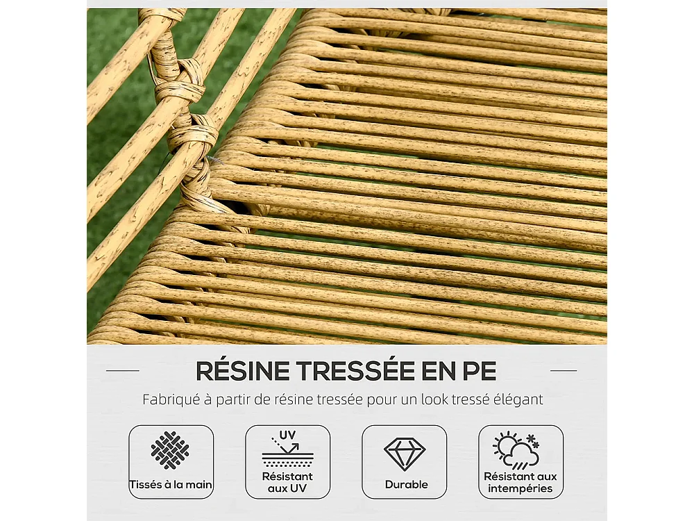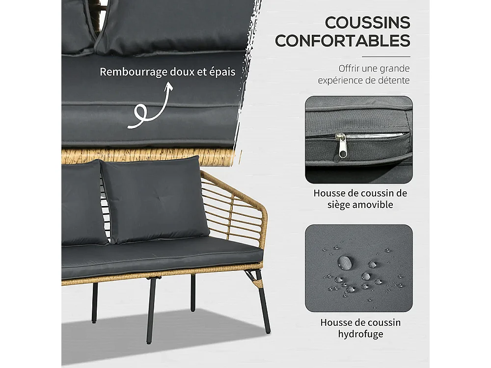 Ensemble salon de jardin 4 pièces canapé 2 places 2 fauteuils 1 table basse 7 coussins métal et résine imitation rotin