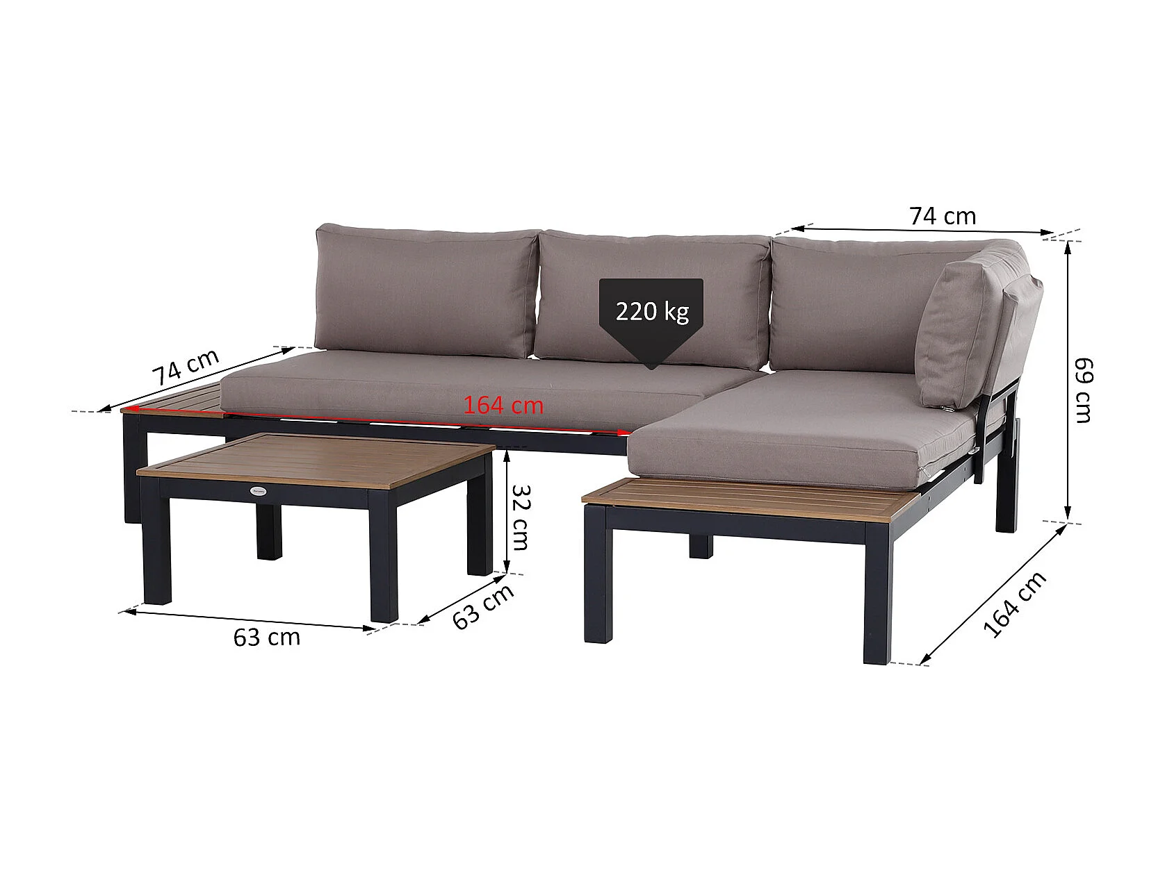 Ensemble salon de jardin d'angle design contemporain 5 places coussins marron table basse alu. noir et imitation bois