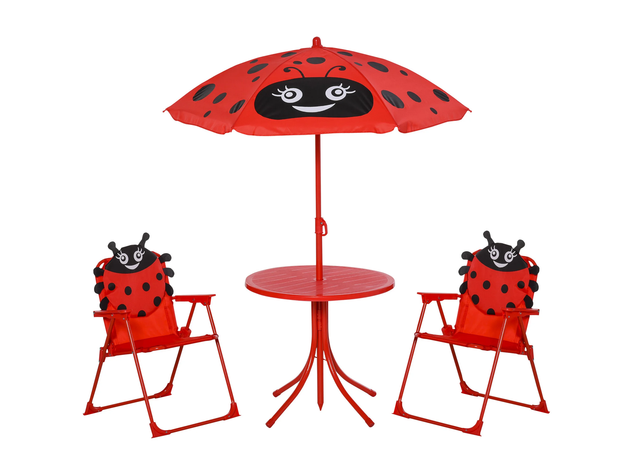 Ensemble salon de jardin enfant 4 pcs design coccinelle - table ronde + 2 chaises pliables + parasol - métal époxy oxford rouge