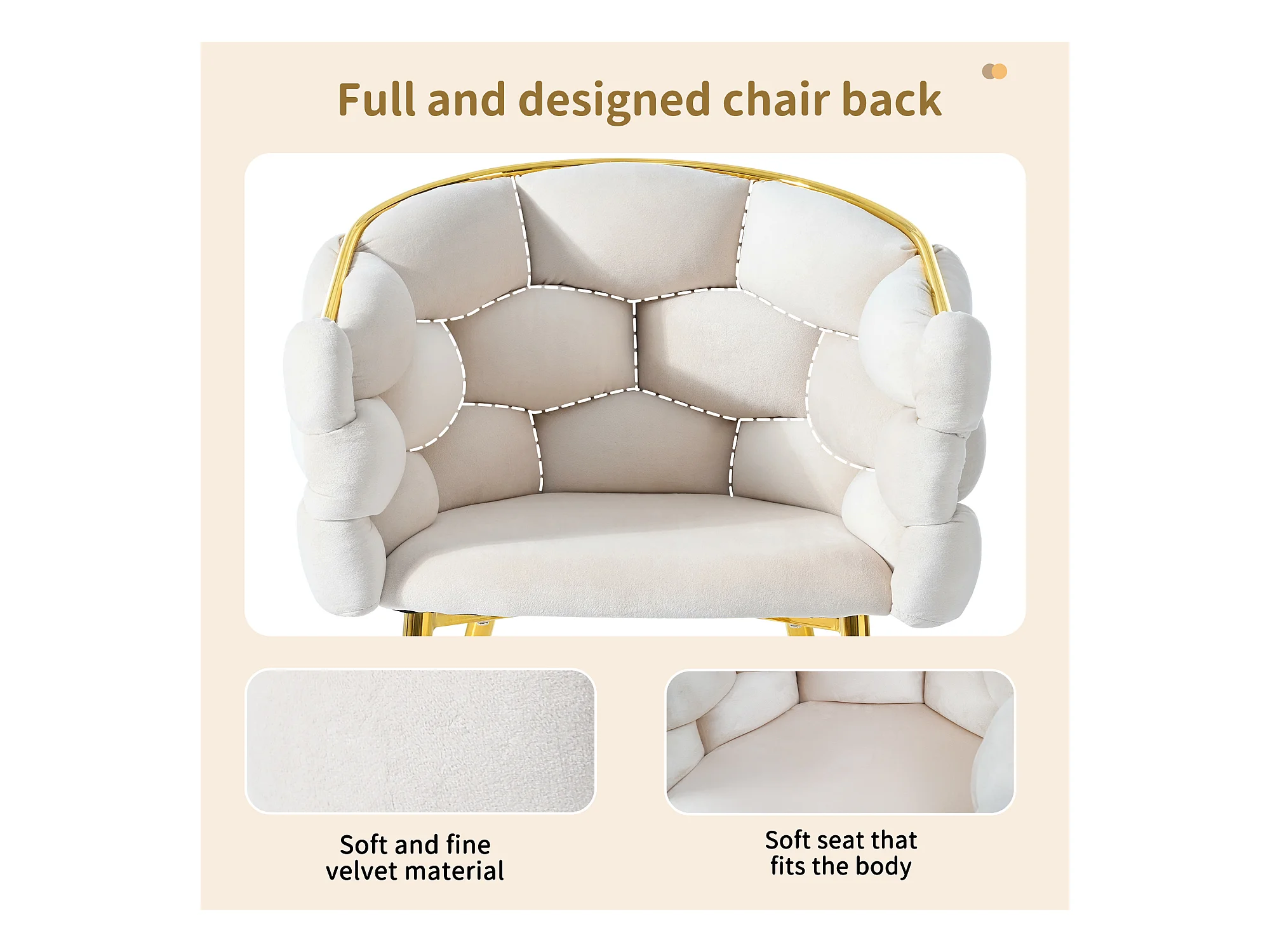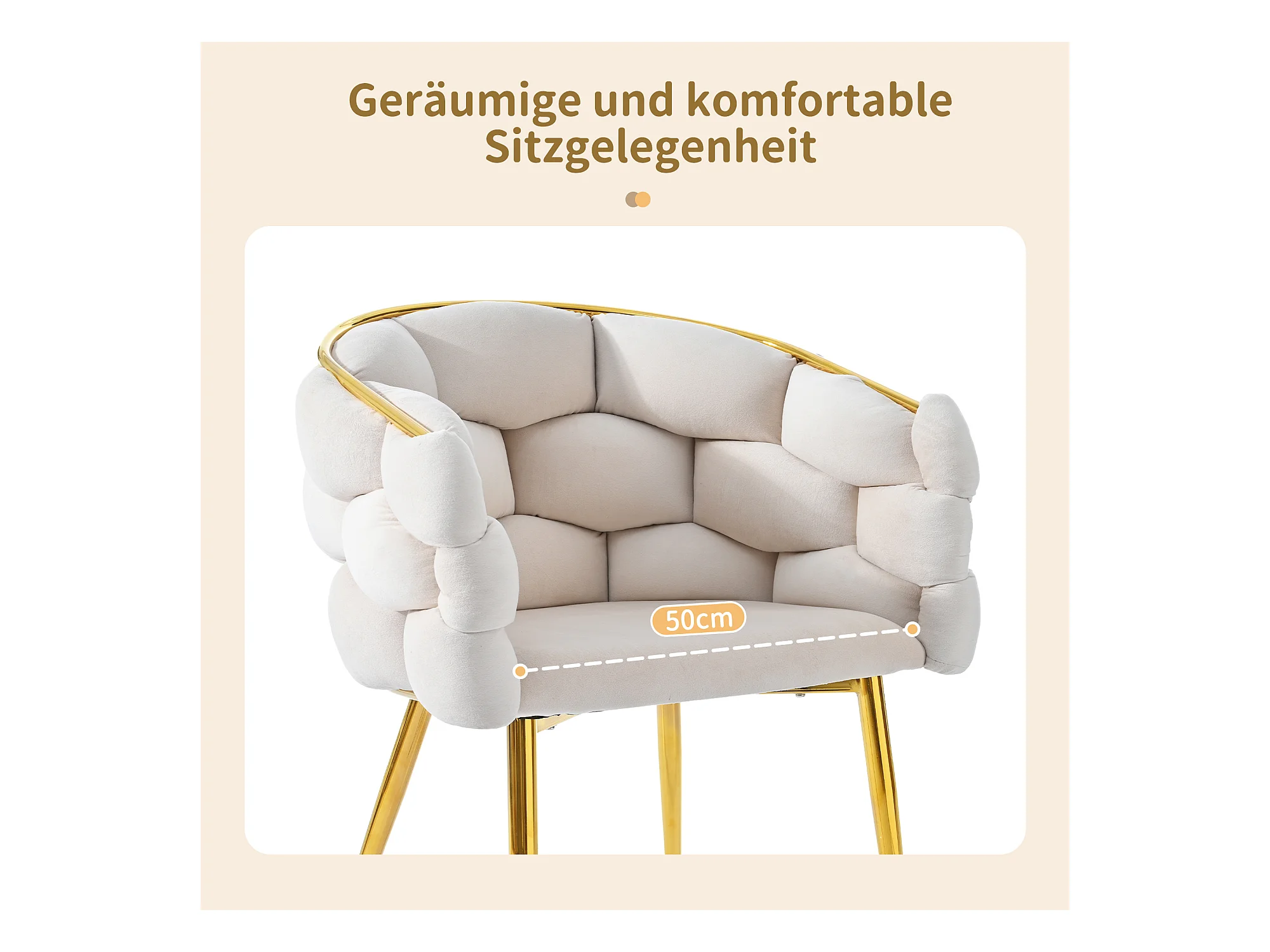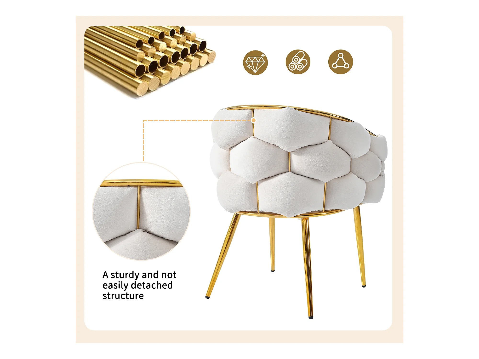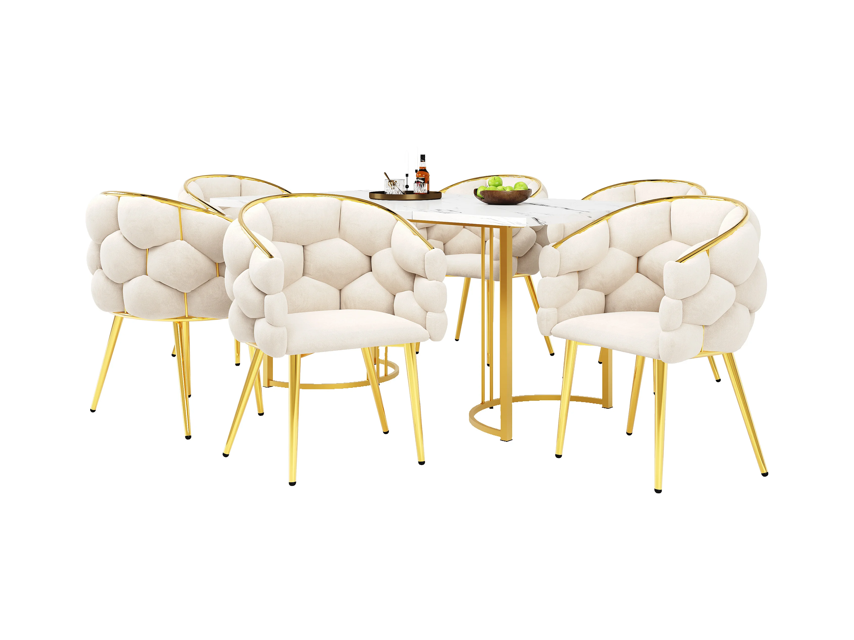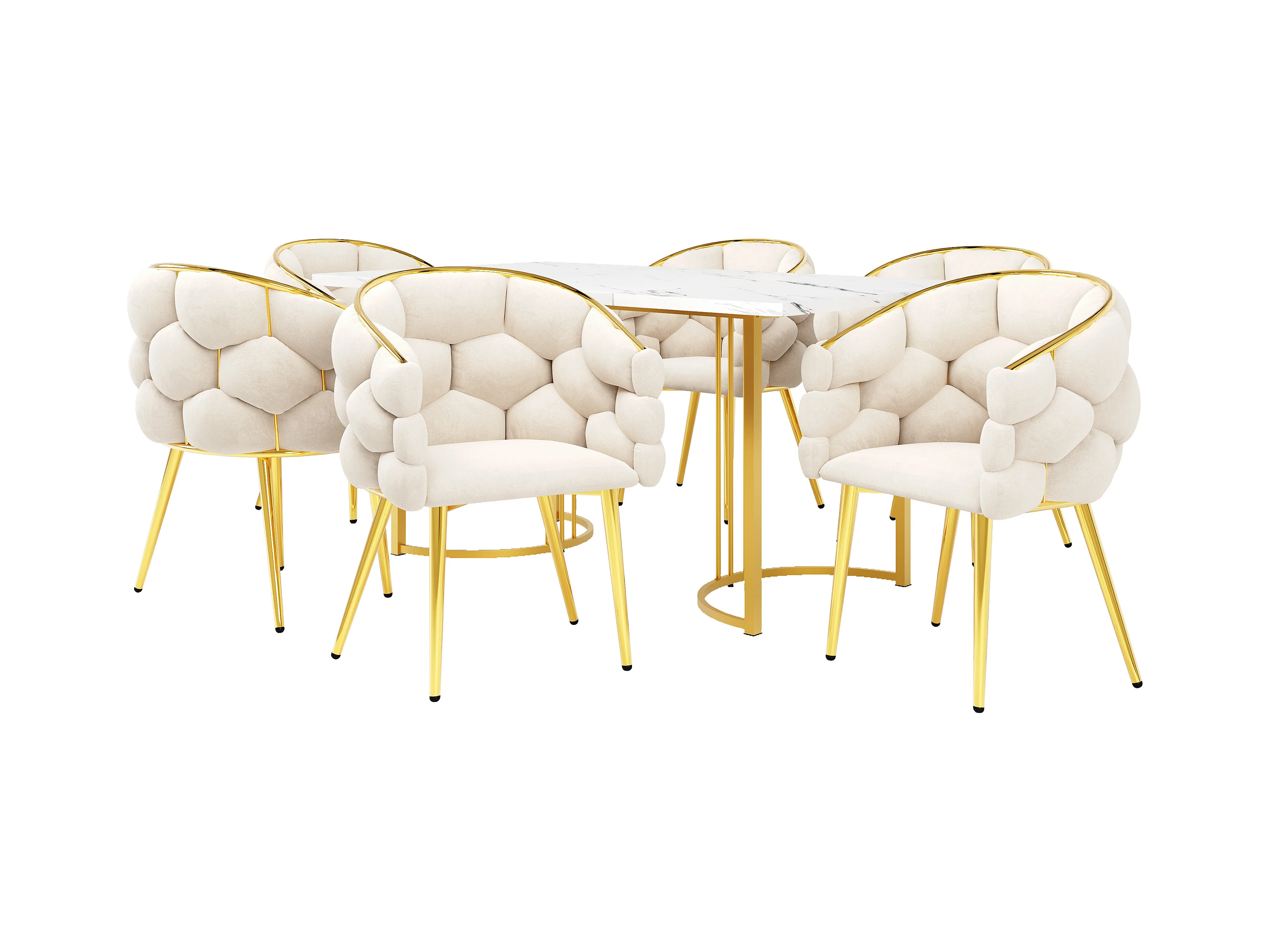 Ensemble table à manger + 6 chaises en velours - 140 x 80 x 75 cm - MDF + Pieds en métal doré - Blanc + beige
