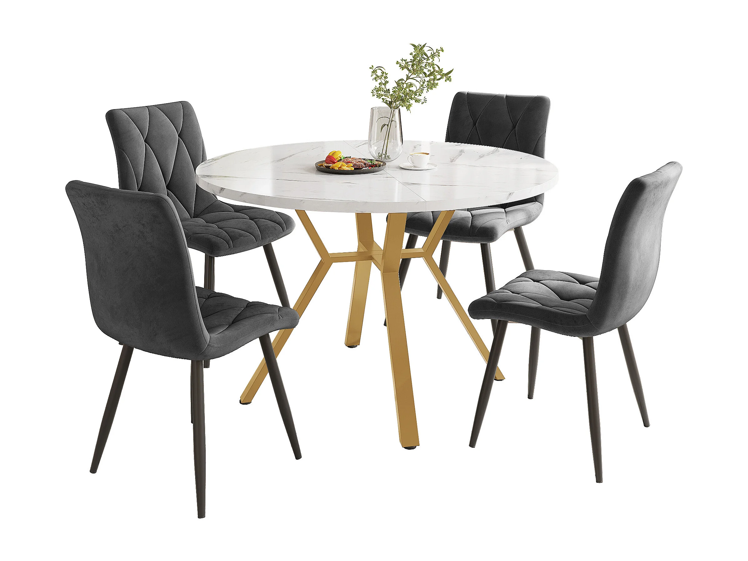 Ensemble table à manger et chaises (5 pièces), table ronde en marbre moderne + 4 chaises en velours gris avec pieds dorés (diamètre 50x75 cm)