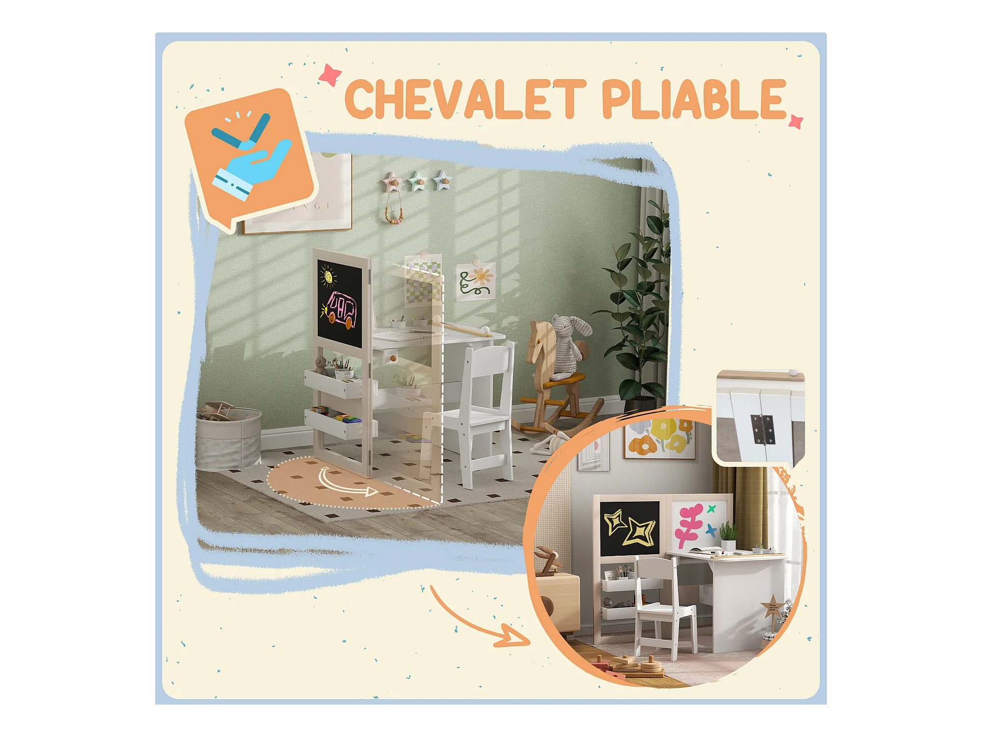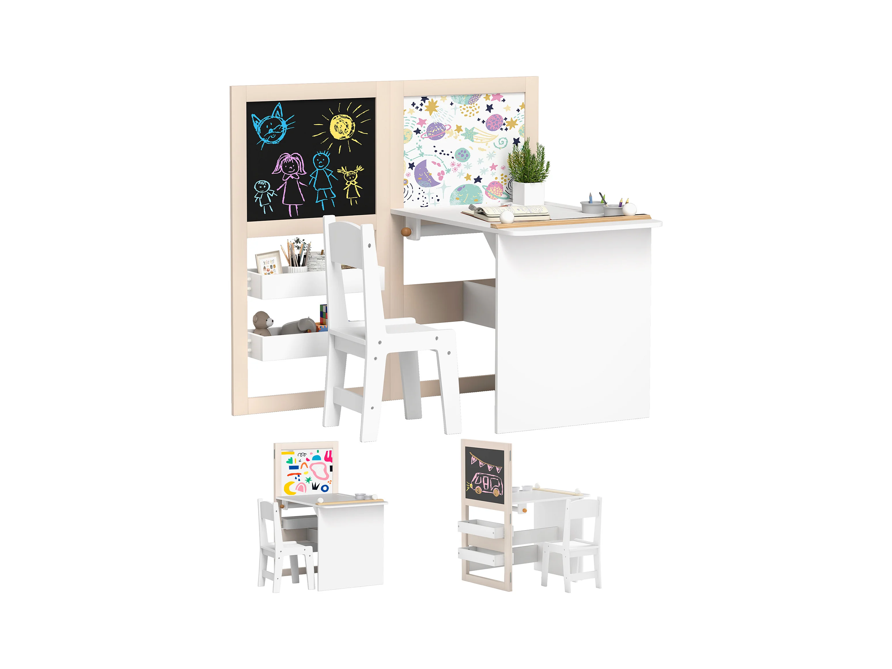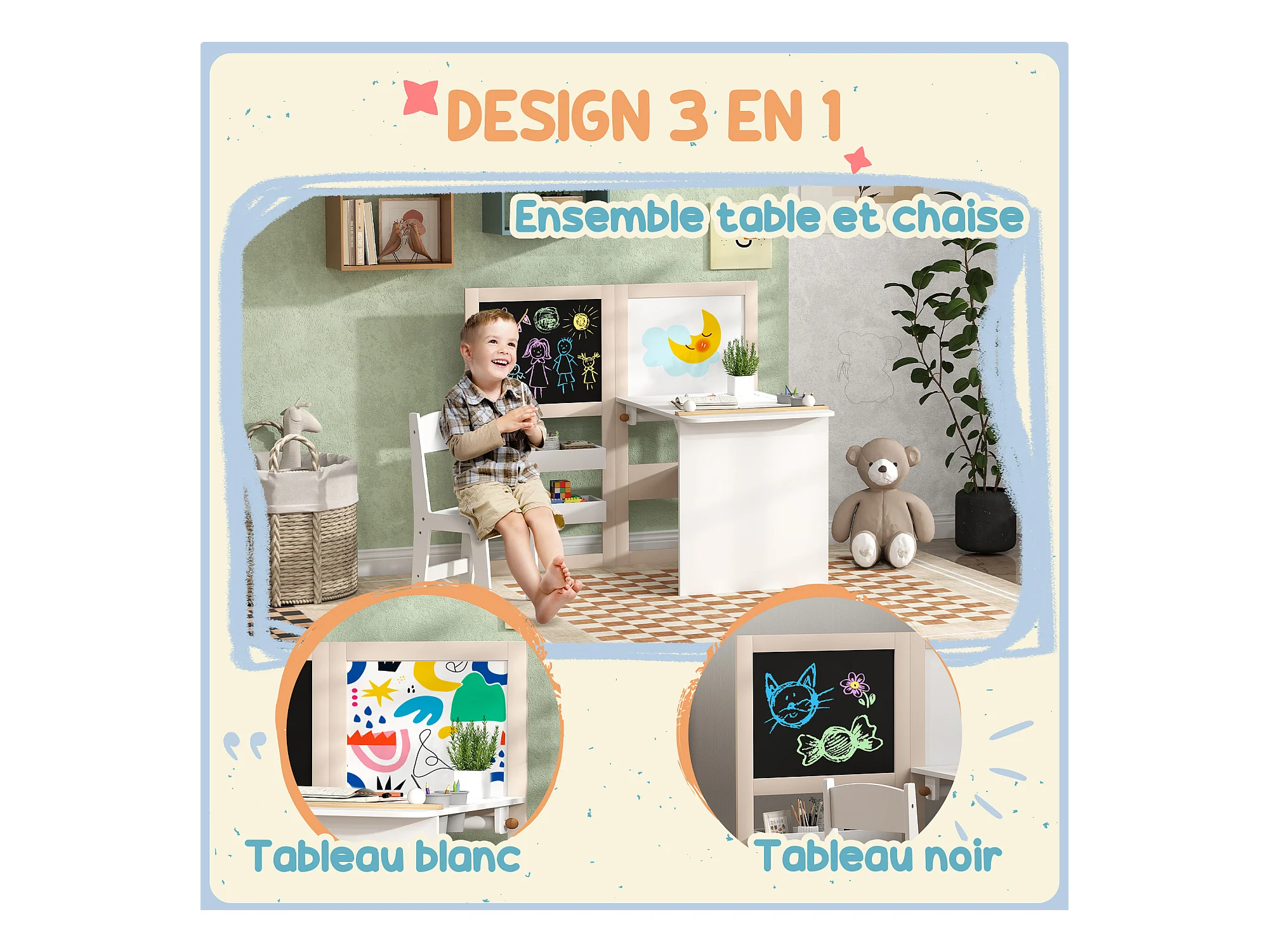 Ensemble table chaise tableaux pliables enfant multi-rangement MDF beige blanc