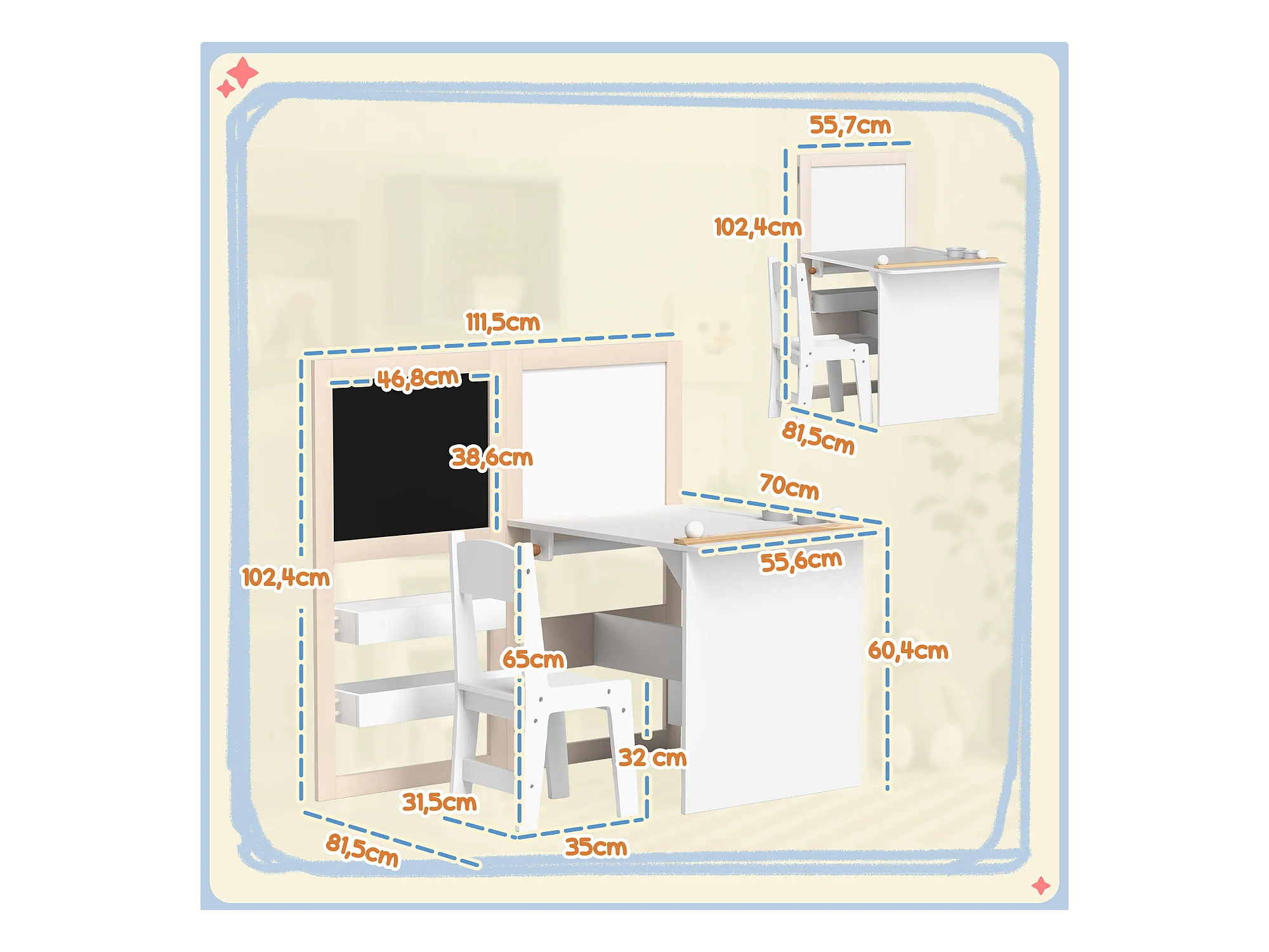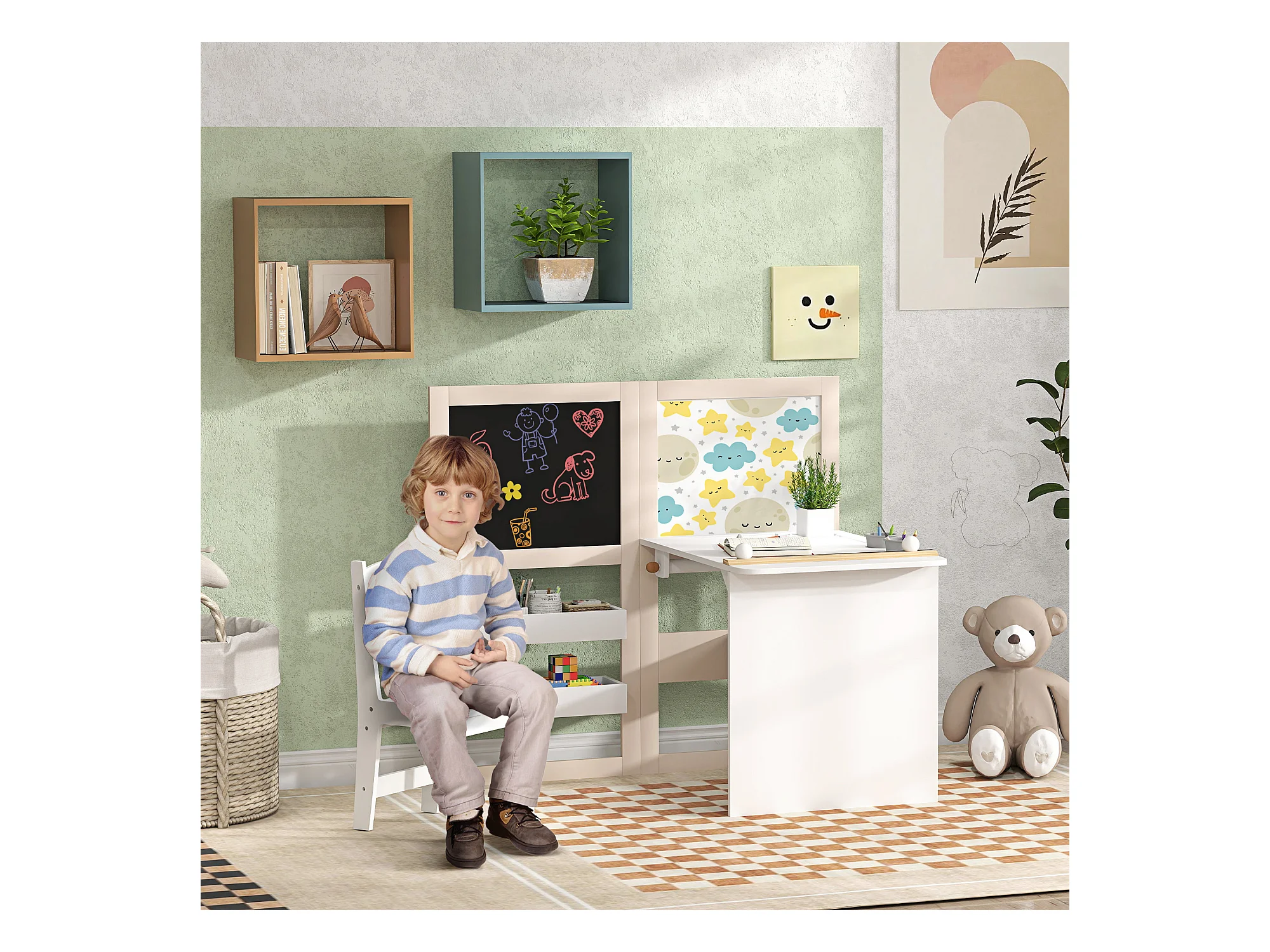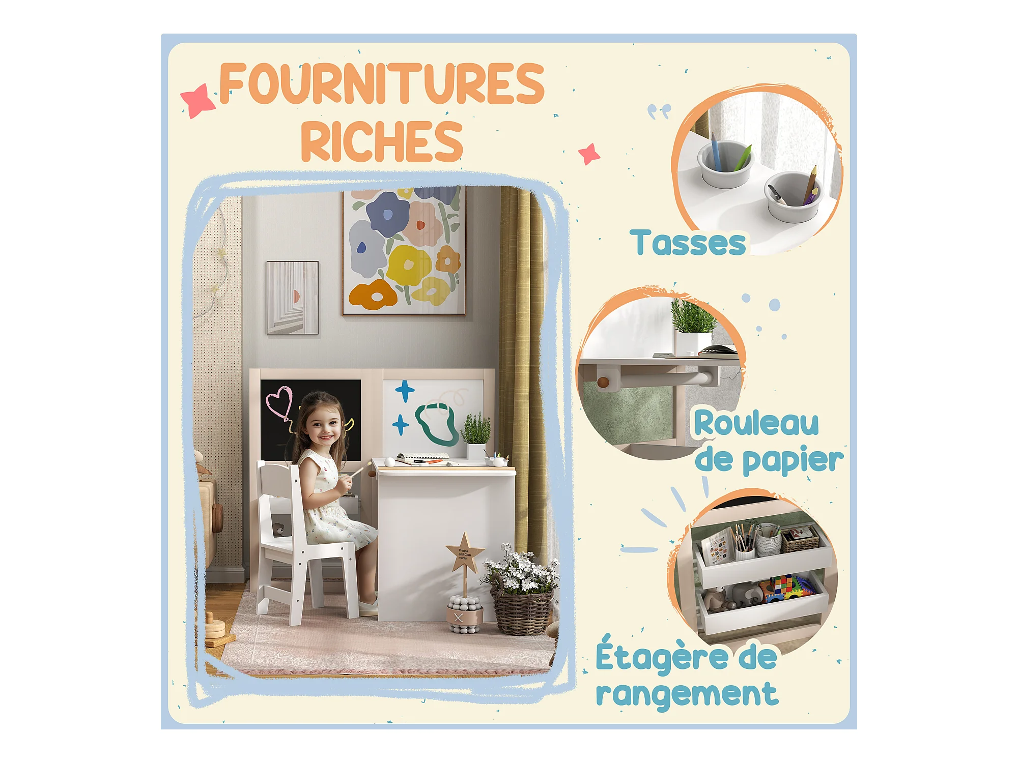 Ensemble table chaise tableaux pliables enfant multi-rangement MDF beige blanc