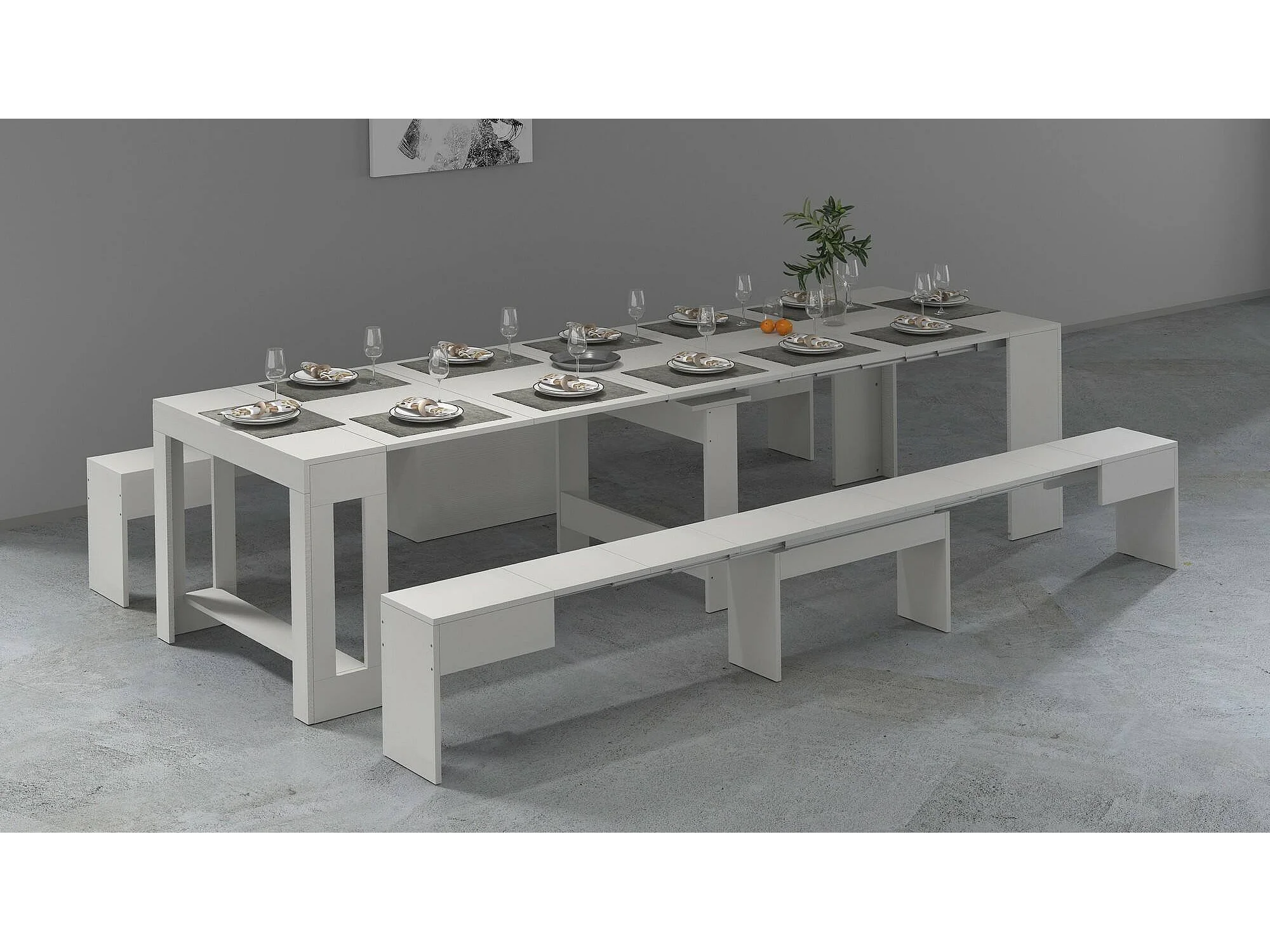 Ensemble table et chaises Dadamoni, Composition polyvalente, Ensemble avec console et 2 bancs extensibles, 100% Made in Italy, 66x25h45 cm, Blanc